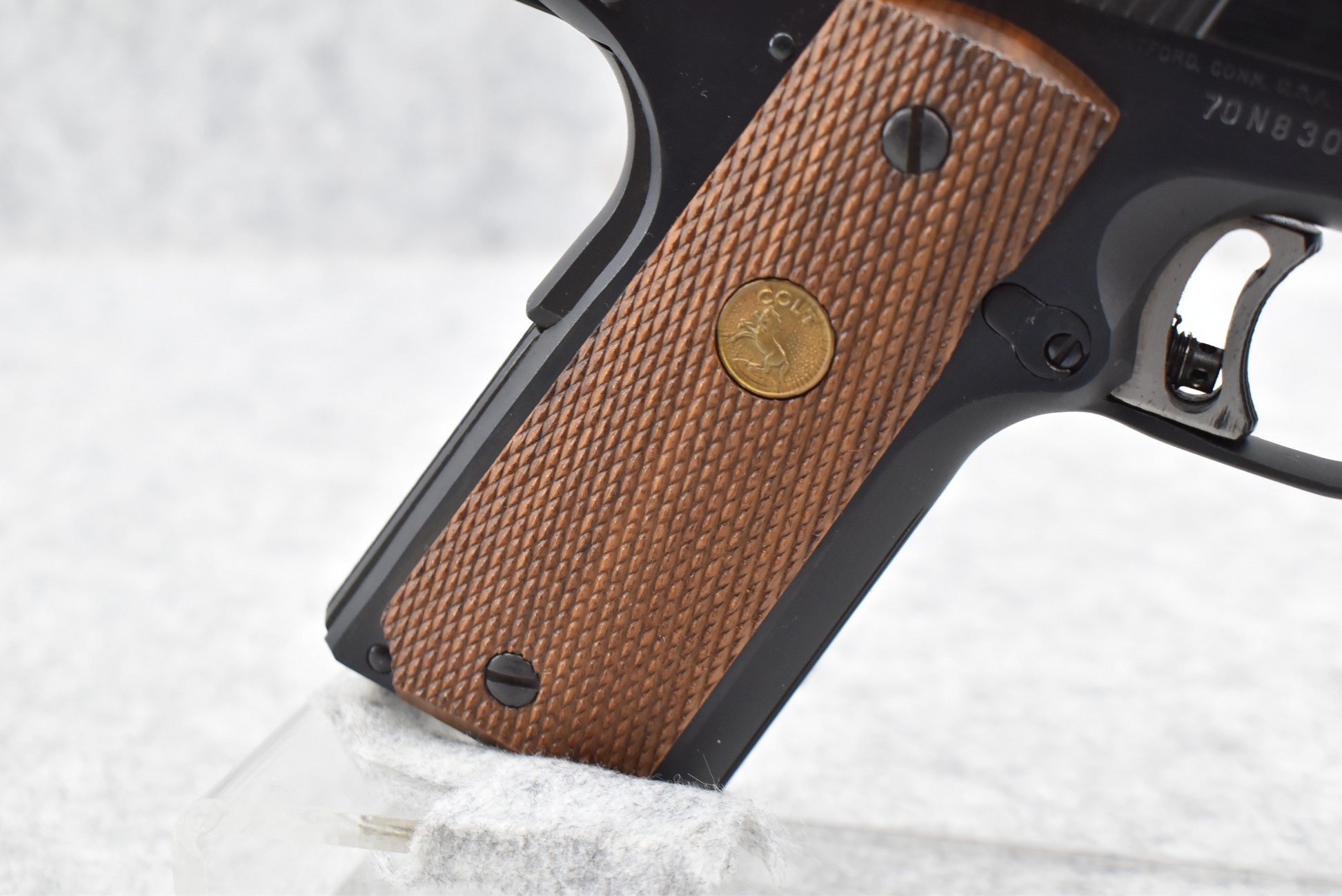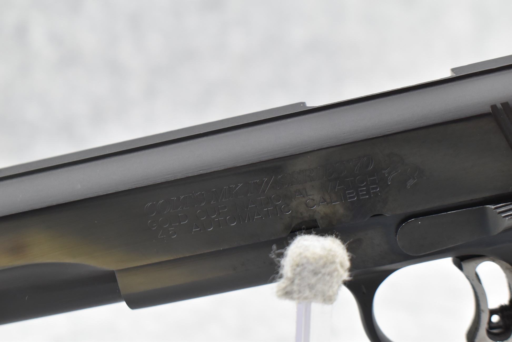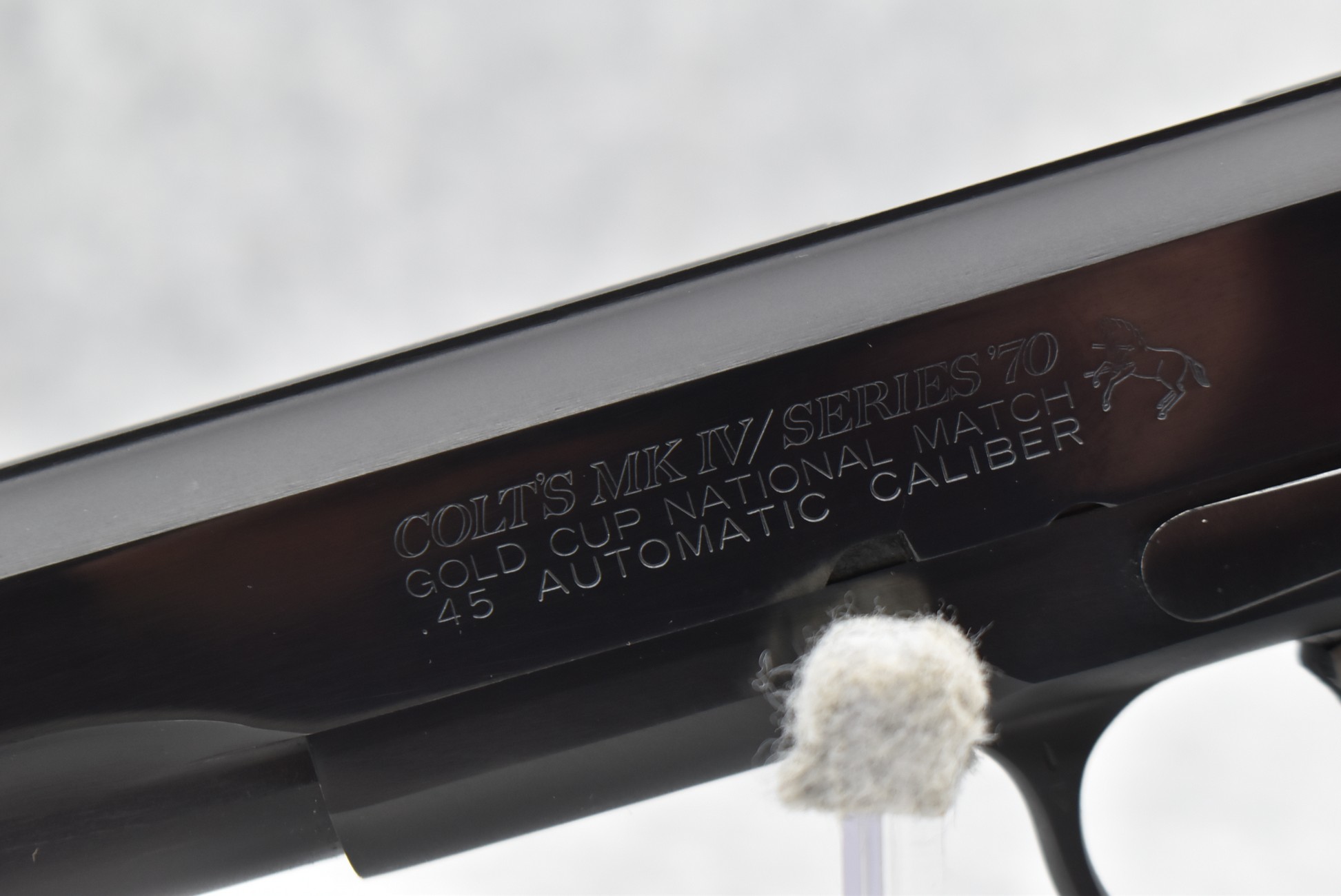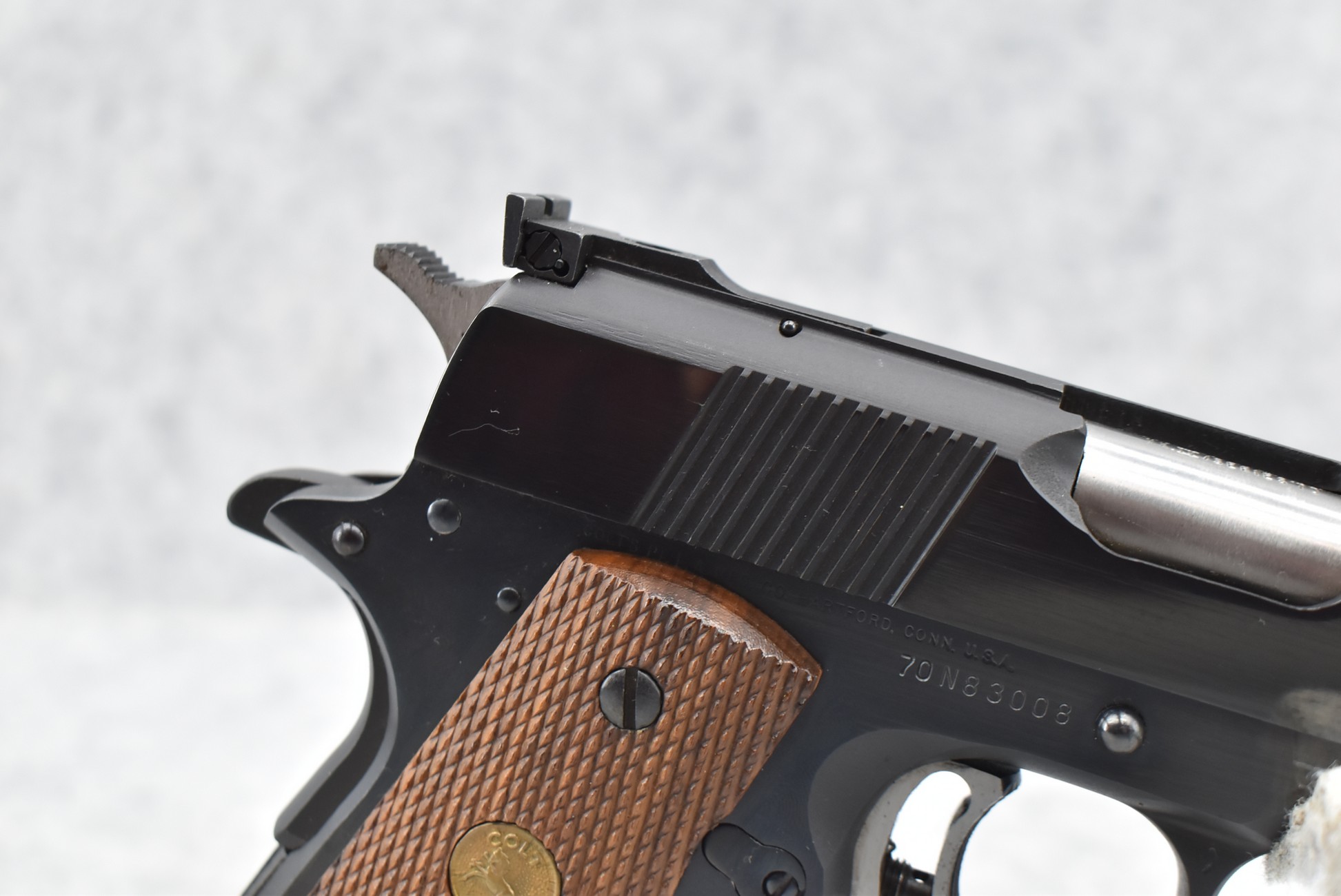 366R. Colt – Mod. MKIV Series 70-Gold Cup National Match – 45 Auto Cal. Semi-Auto Pistol – w/5” Barrel w/Blade Front & Adj. Rear Notch Sights – Blued Finish – w/Colt Factory Checkered Wod Grips – w/2 Colt Detachable Magazines – Appears New w/Colt Gold Cup 2pc. Box & Pamphlet – Mfg. 1980