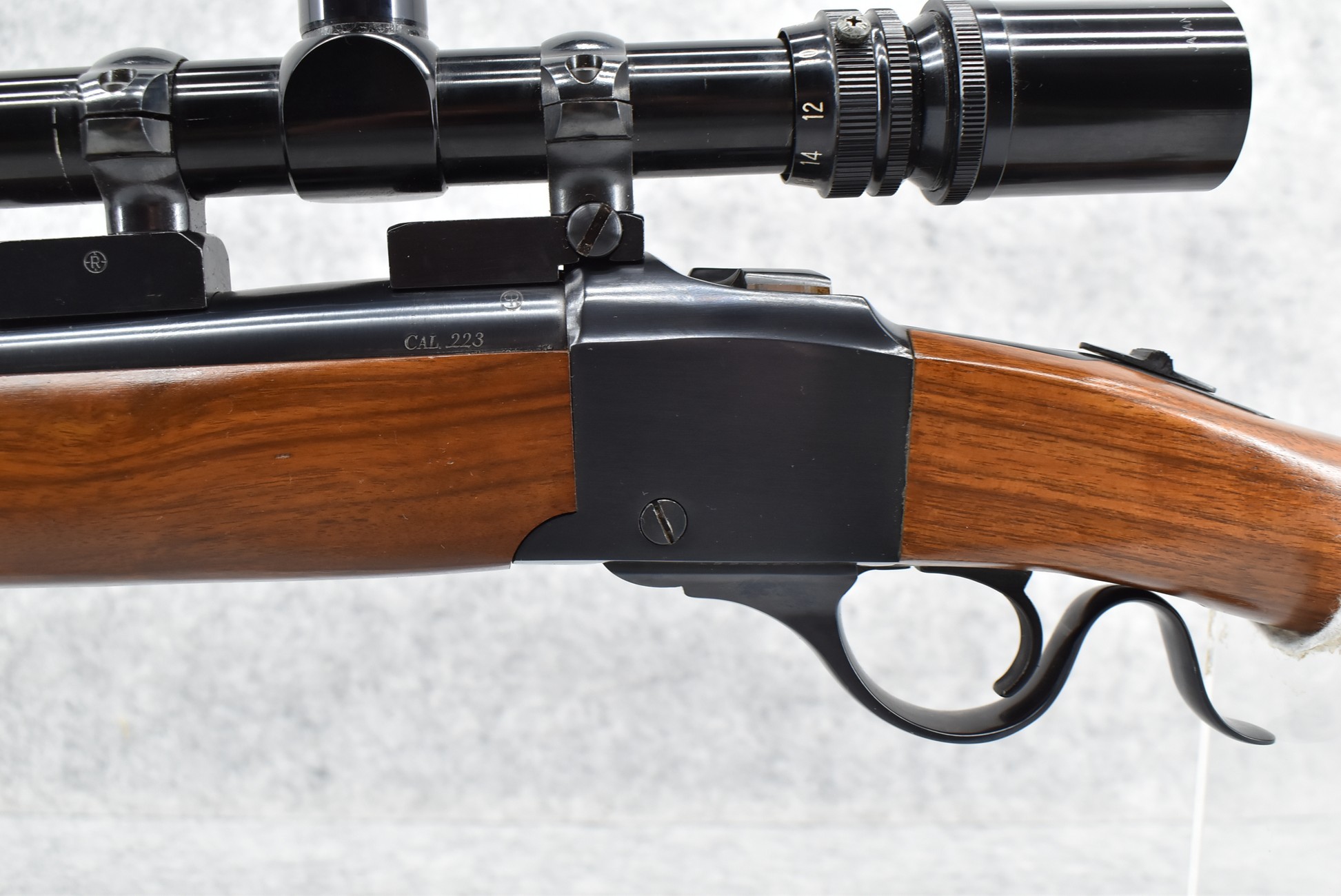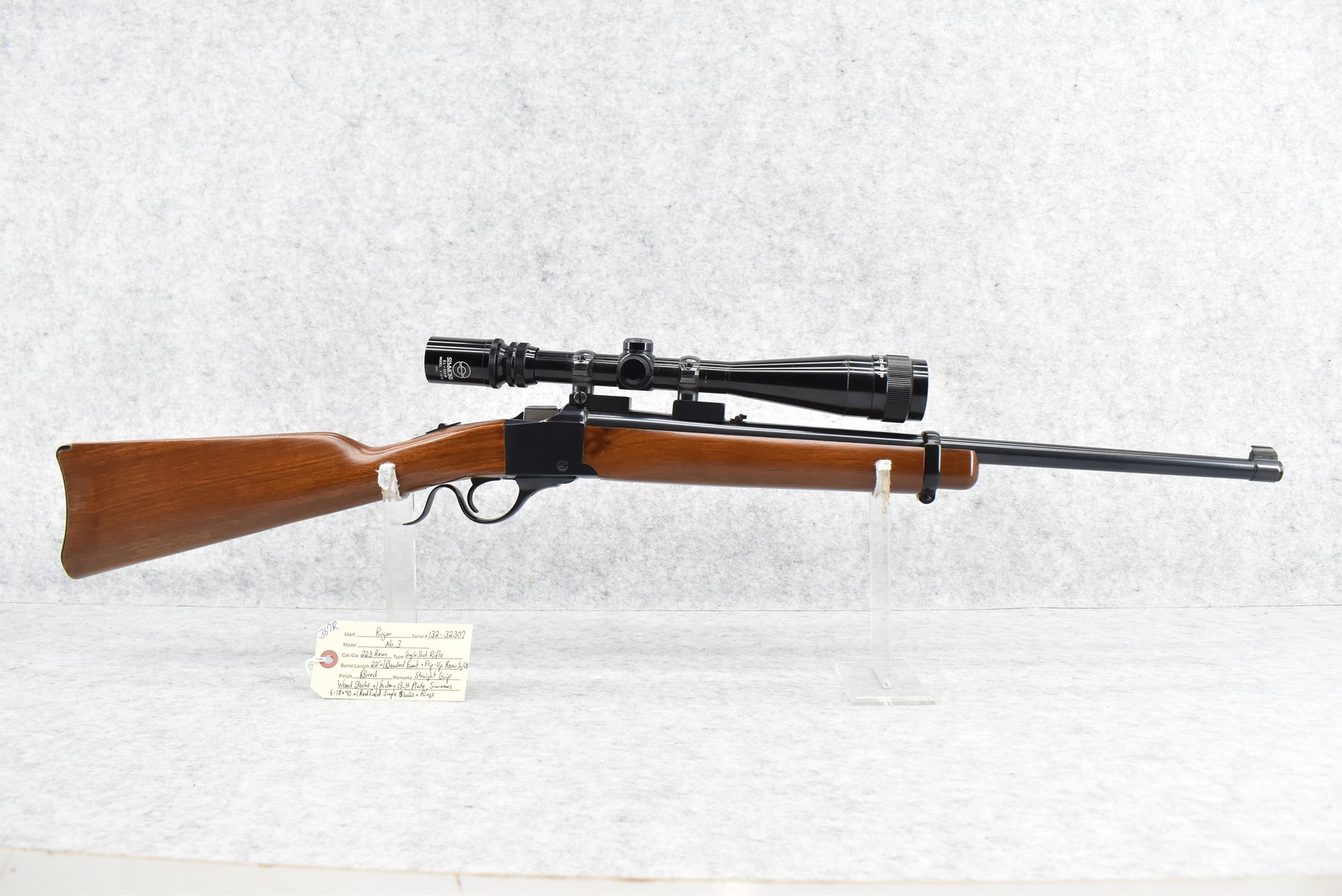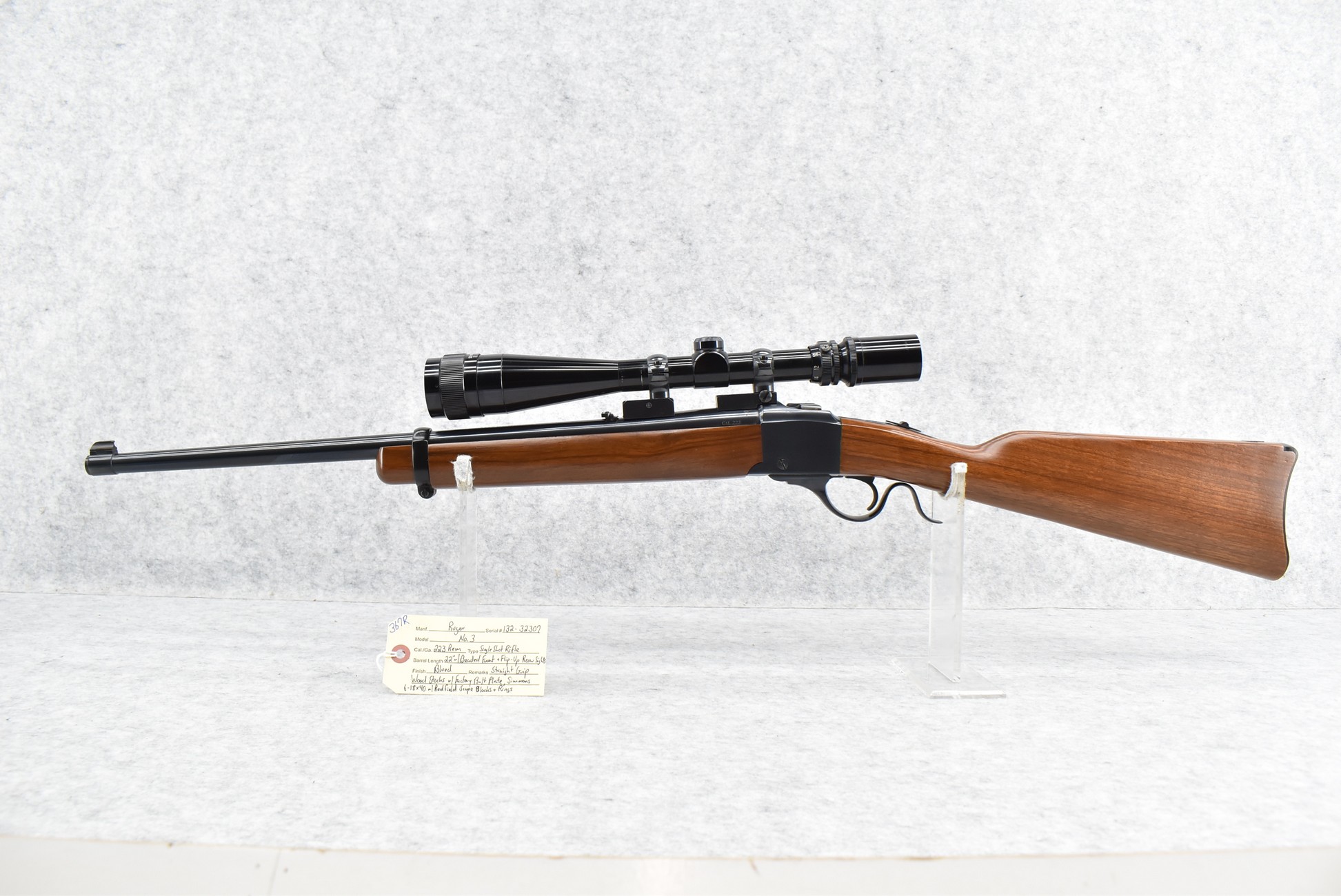 367R. Ruger – Mod. No. 3 – 223 Rem. Cal. Single Shot Rifle – w/22” Barrel w/Beaded Front & Flip Up Rear Sights – Blued Finish – w/Straight Grip Wood Stocks w/Factory Butt Plate – w/Simmons 6-18×40 Scope – w/Redfield Scope Blocks & Rings