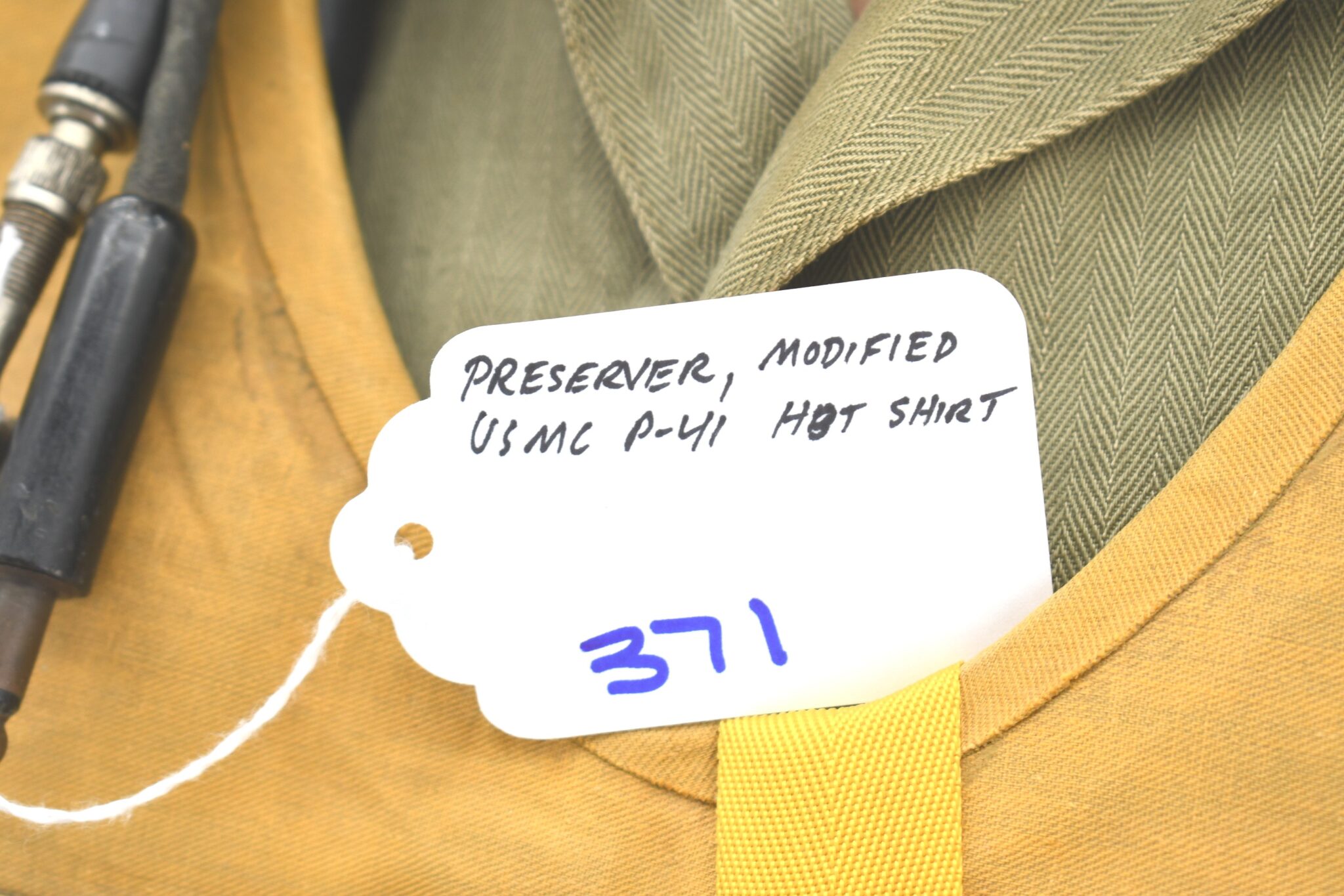 371. WWII U.S. Navy/U.S. Marine Corps Aviator Lot – Summer U.S.N. Flight Helmet w/Avionics and AN-6530 Goggles, U.S.N. Mae West Life Preserver, and Modified U.S.M.C. P-41 Hot Shirt