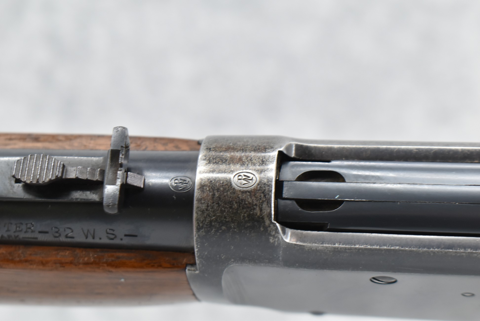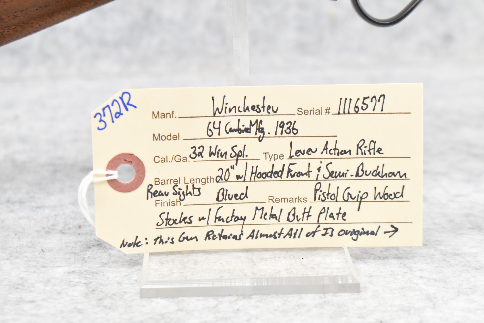 372R. Winchester – Mod. 64 “Carbine” – 32 Win. Spl. Cal. Lever Action Rifle – w/20” Barrel w/Hooded Front & Semi-Buckhorn Rear Sights – Blued Finish – w/Pistol Grip Wood Stocks w/Factory Metal Butt Plate – Mfg. 1936 – Note: This Gun Retains Almost All of its Original Blue Finish – Great Find