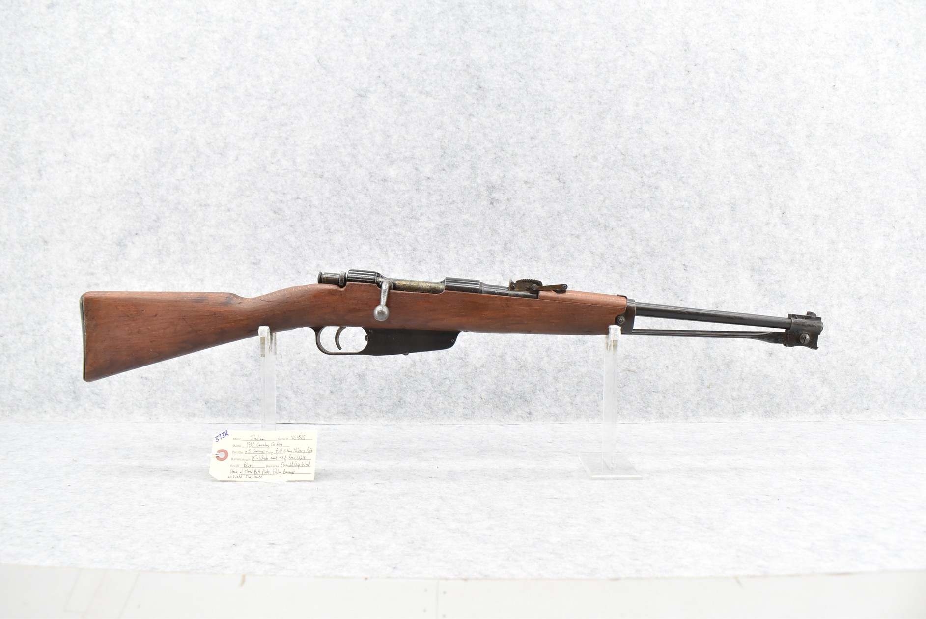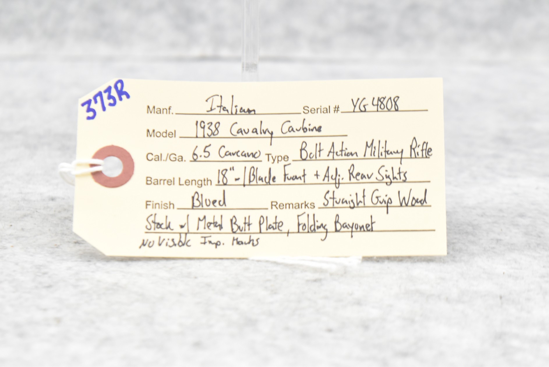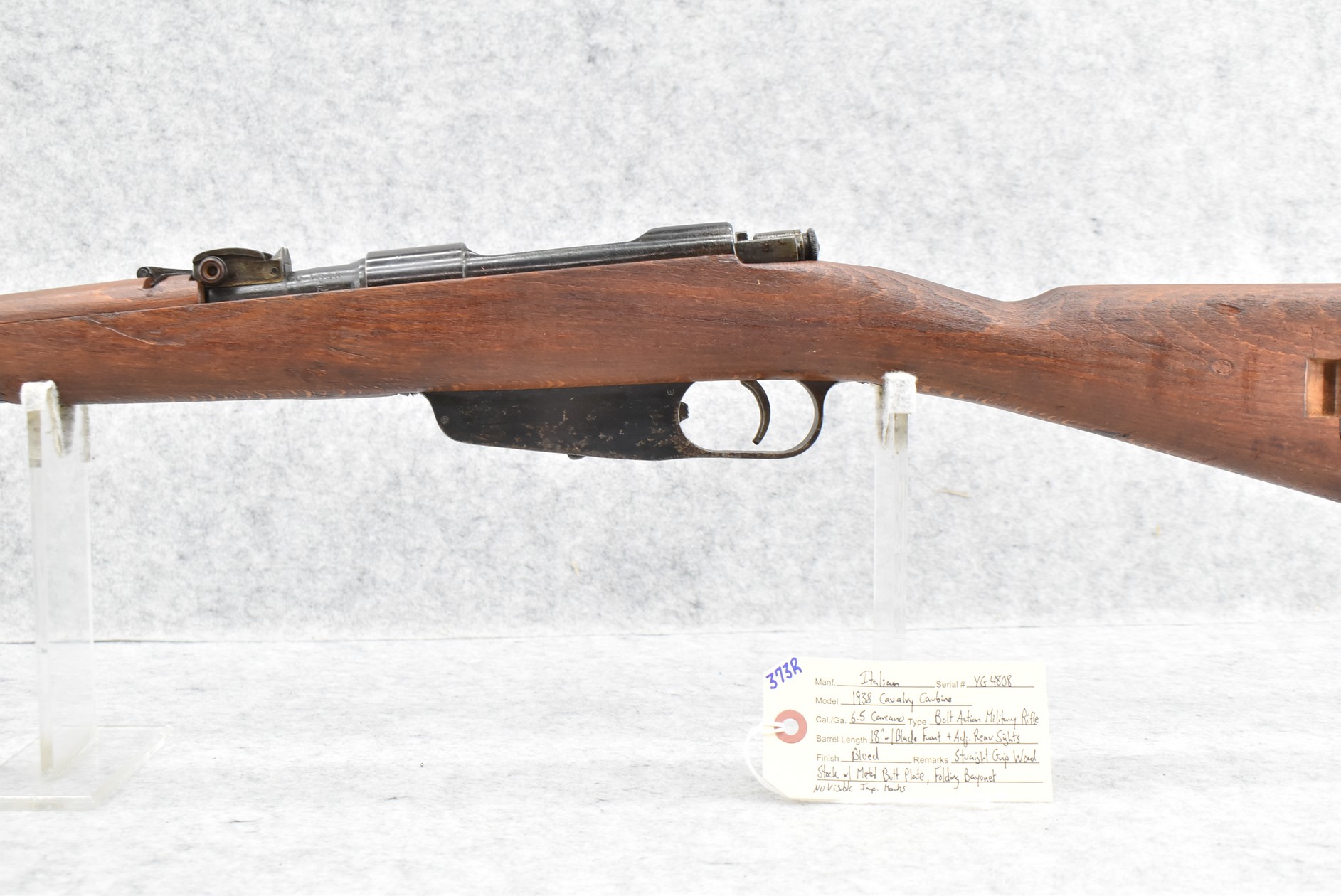 373R. Italian – Mod. 1938 Cavalry Carbine – 6.5 Carcano Cal. Bolt Action Military Rifle – w/18” Barrel w/Blade Front & Adj. Rear Sights – Blued Finish – w/Straight Grip Wood Stock w/Metal Butt Plate – w/Folding Bayonet – No Visible Import Marks