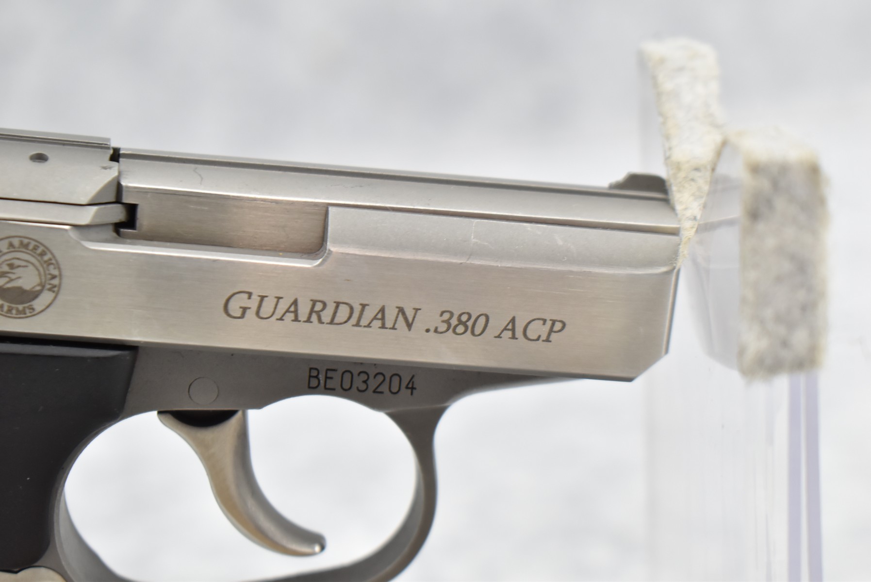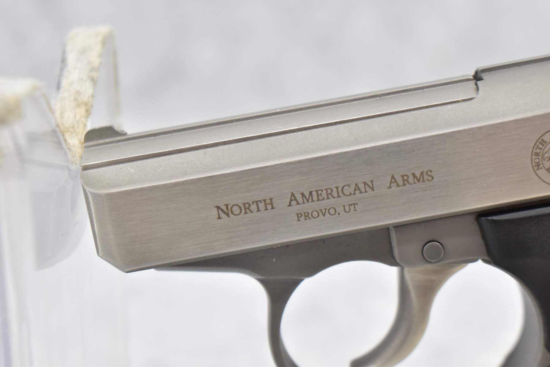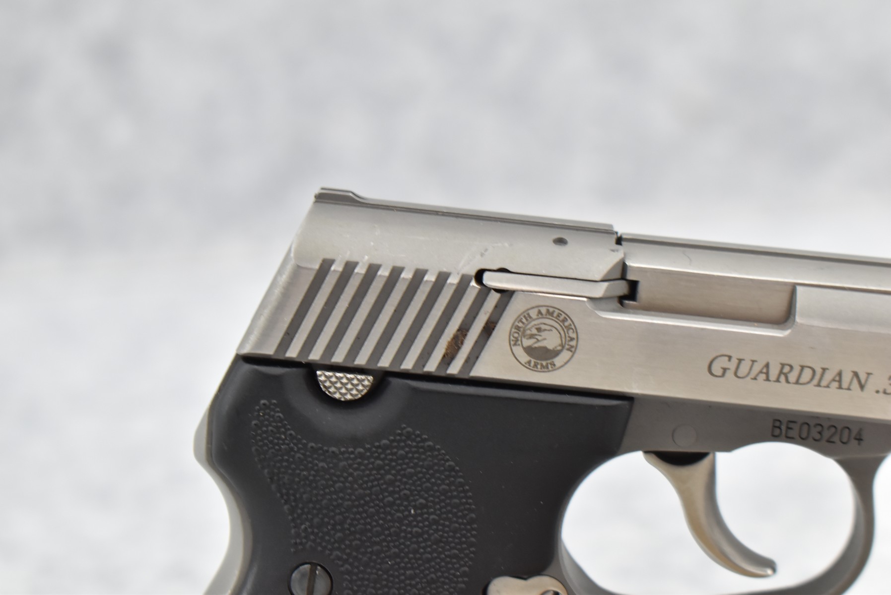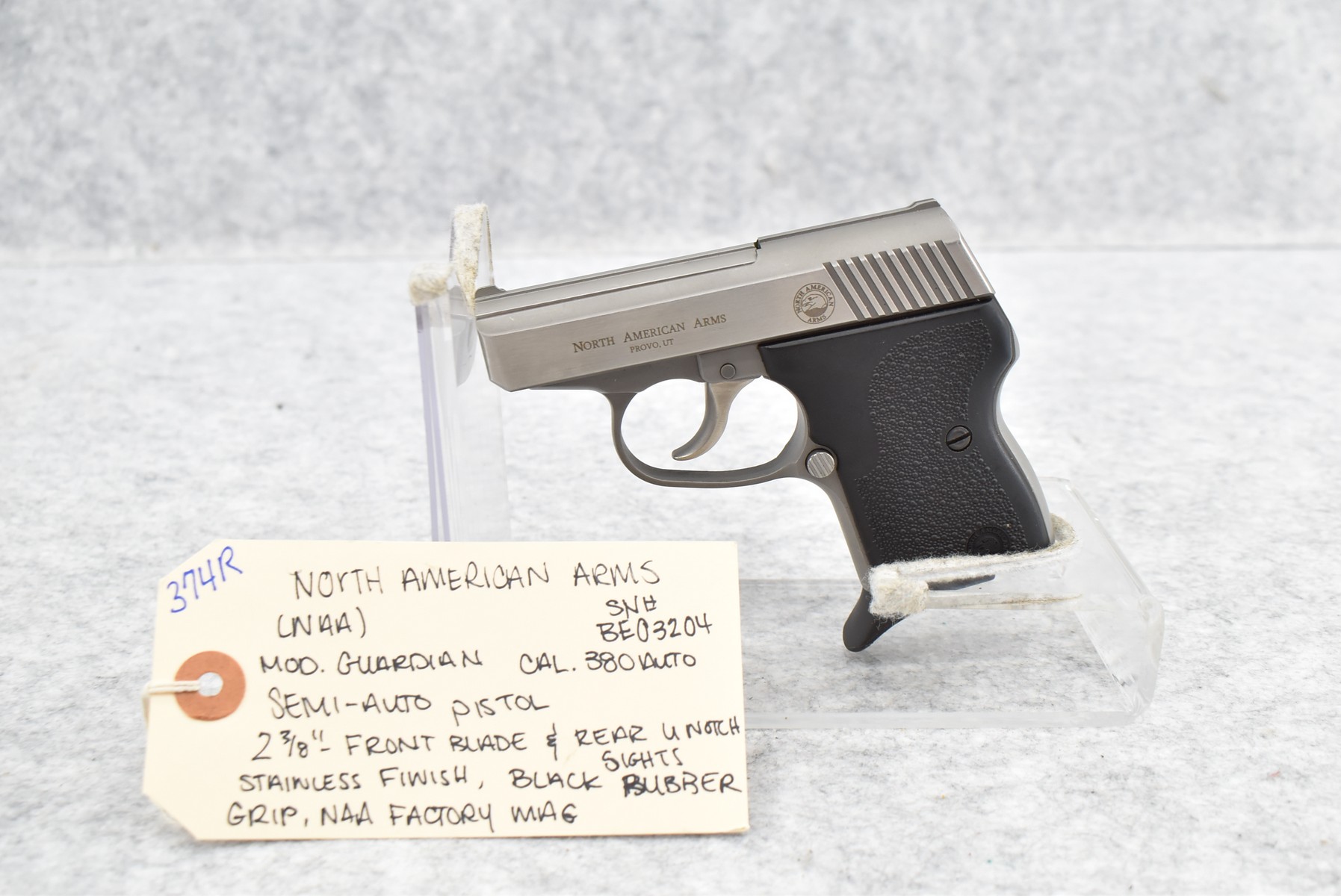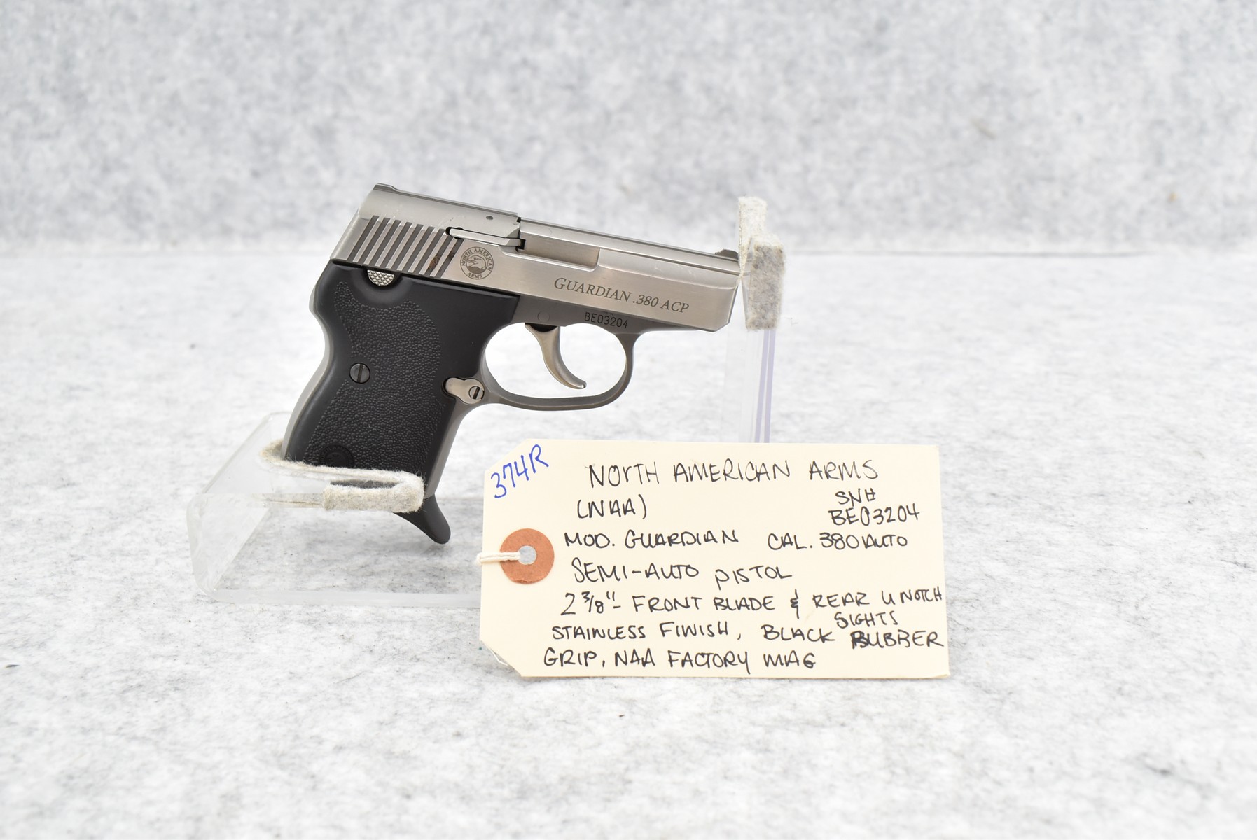 374R. North American Arms (NAA) – Mod. Guardian – 380 Auto Cal. Semi-Auto Pistol – w/2 3/8” Barrel w/Front Blade & Rear U-Notch Sights – Stainless Finish – w/Black Rubber Grips – w/NAA Factory Mag
