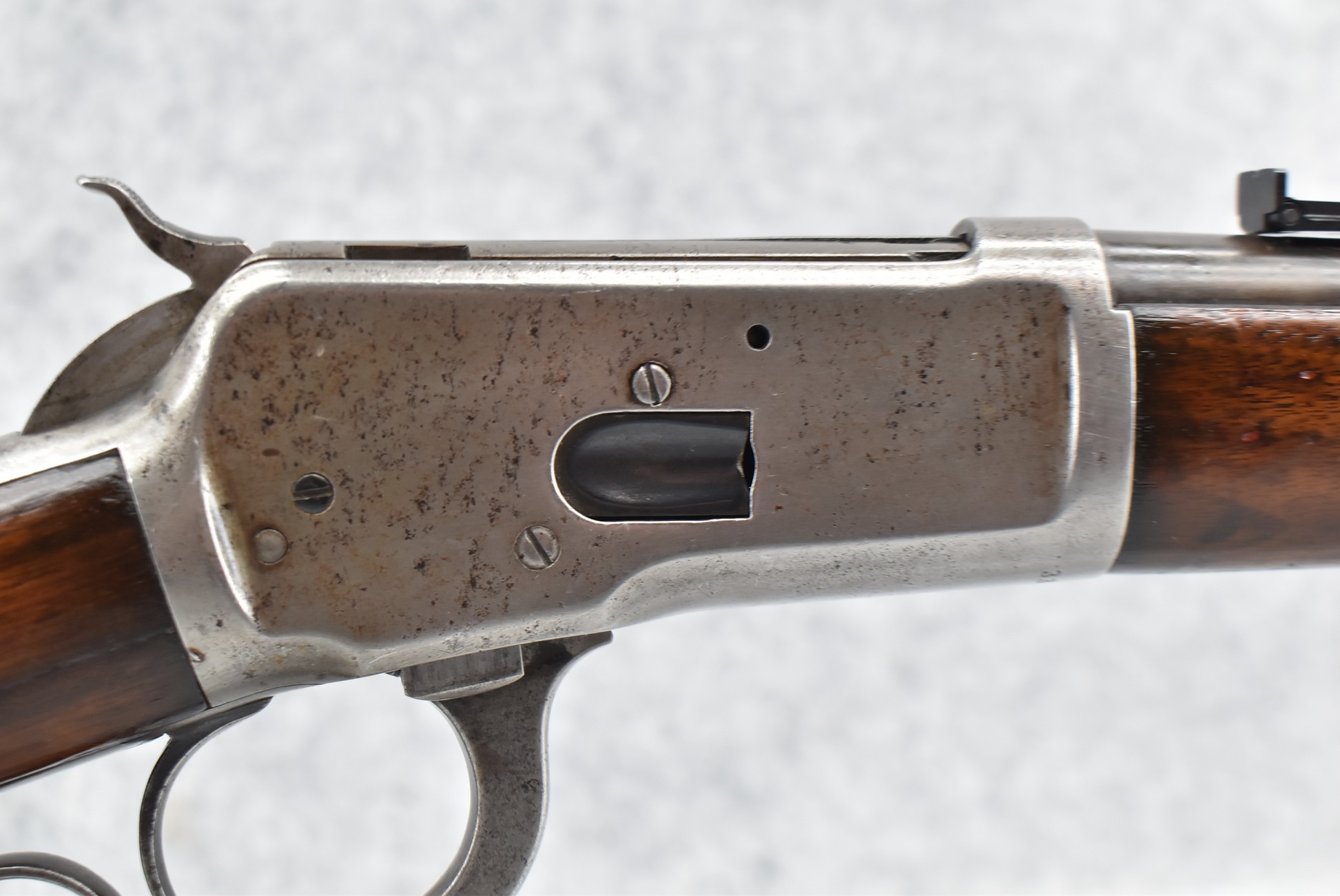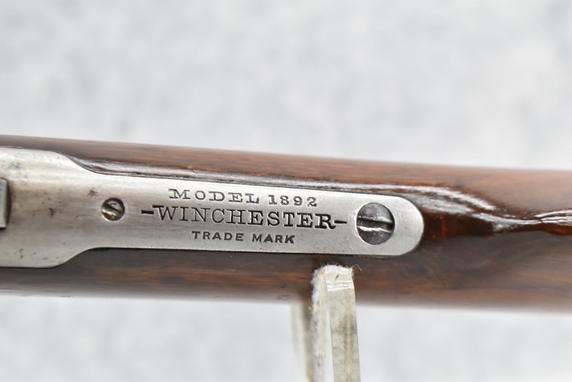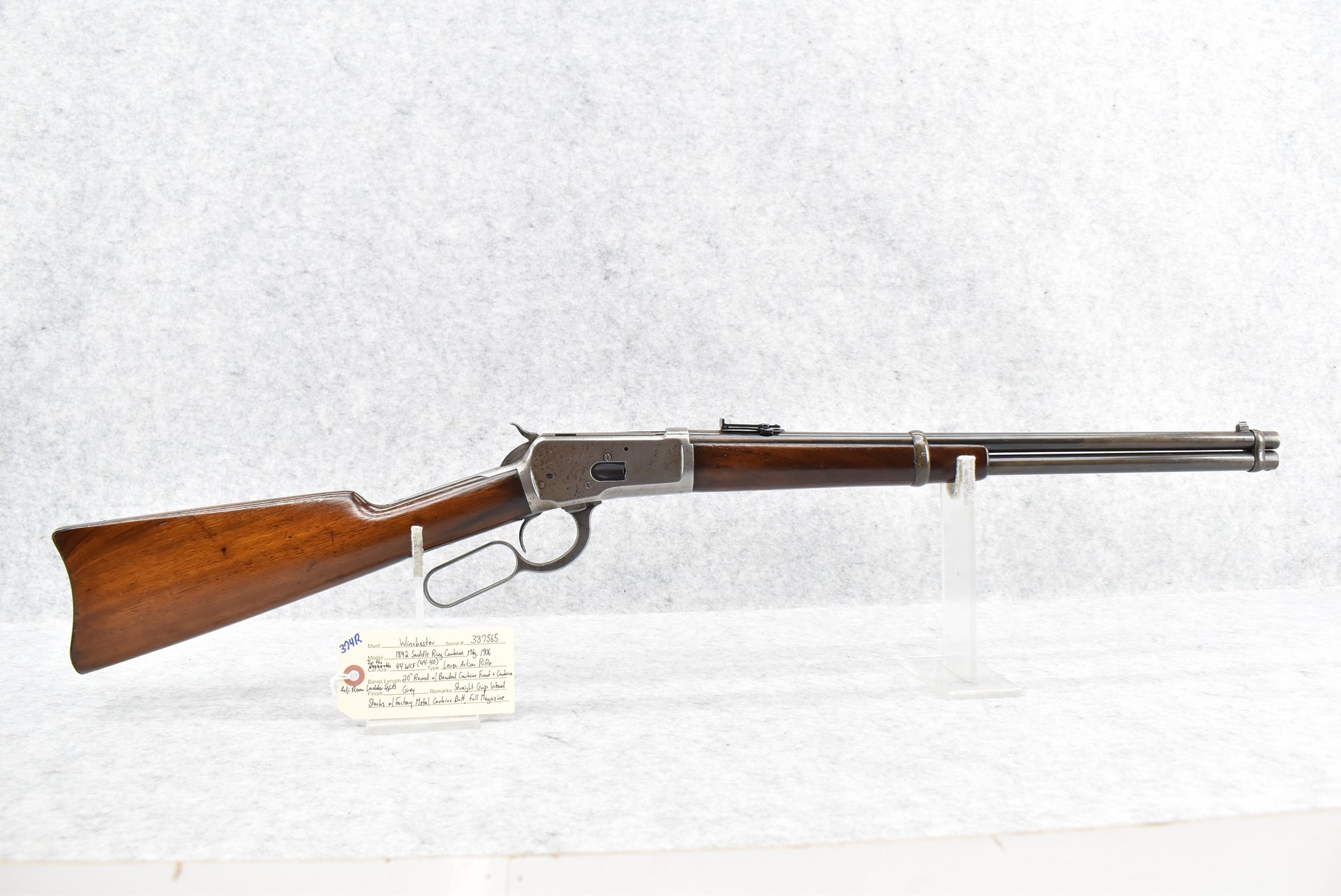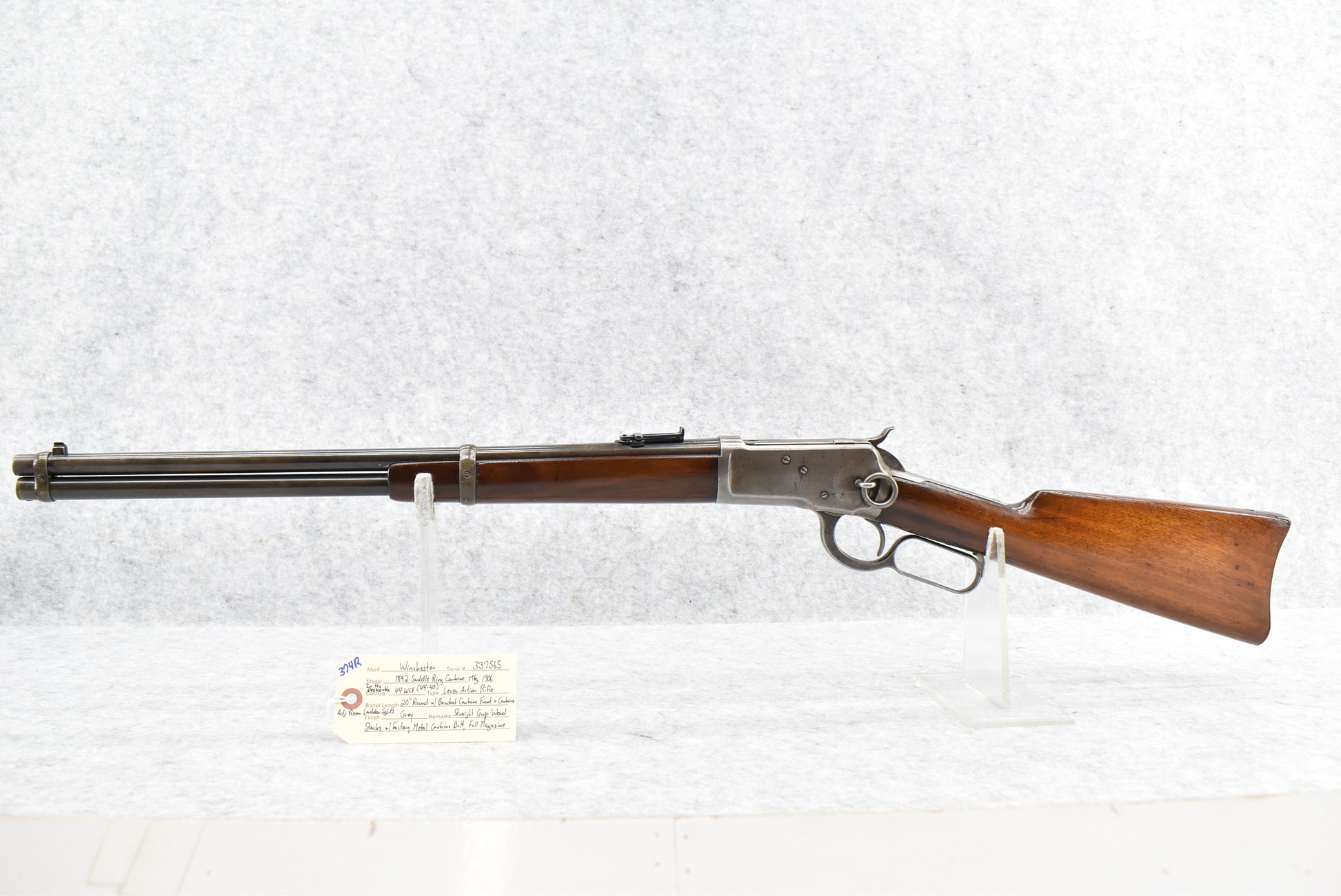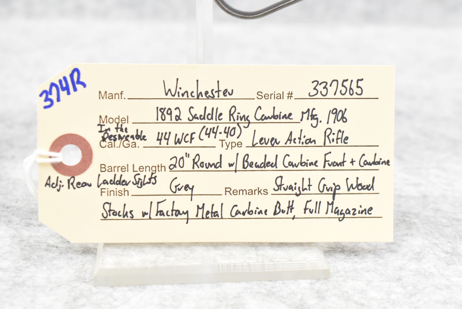 374R. Winchester – Mod. 1892 Saddle Ring Carbine – In the Desirable 44 WCF (44-40) Cal. Lever Action Rifle – w/20” Round Barrel w/Correct Beaded Carbine Front & Carbine Adj. Rear Ladder Sights w/Full Magazine – Gray Finish – w/Straight Grip Wood Stocks w/Factory Metal Carbine Butt Plate – Mfg. 1906