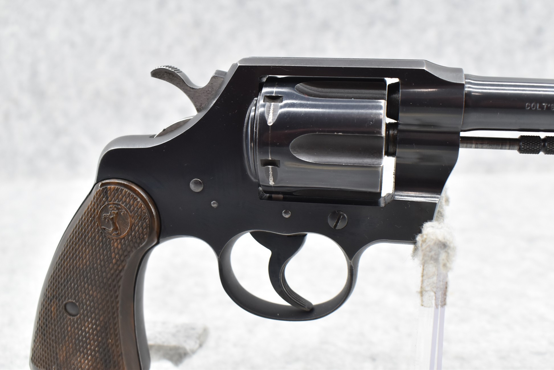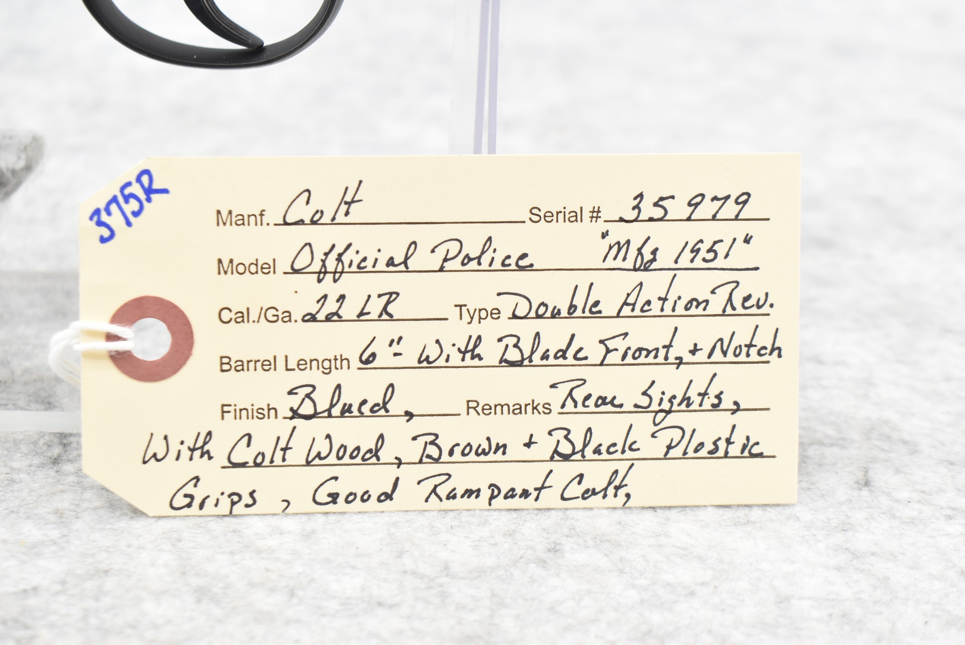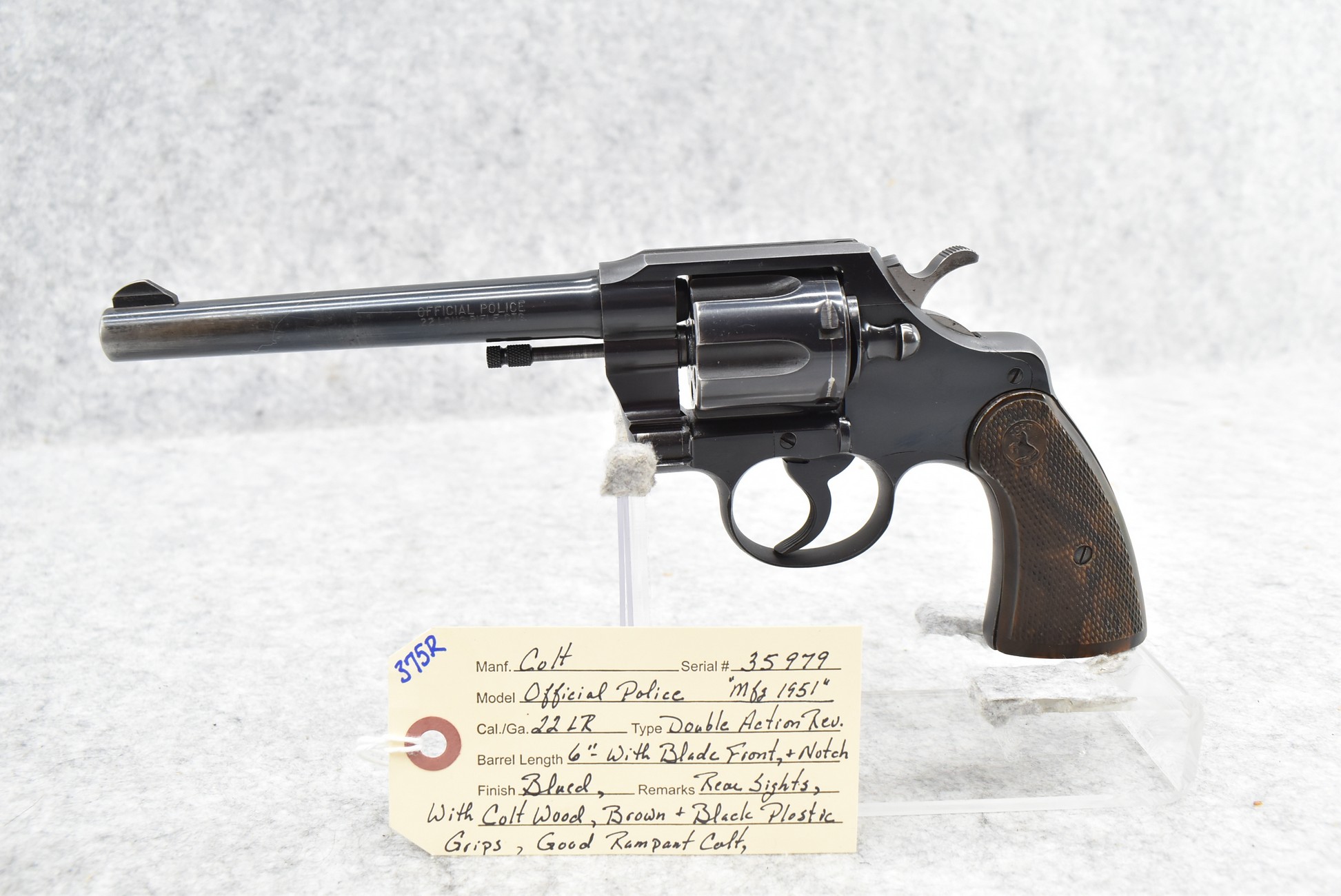 375R. Colt – Mod. Official Police – 22LR Cal. Double Action Revolver – w/6” Barrel w/Blade Front & Notch Rear Sights – Blued Finish – w/Colt Wood Brown Grips – w/Good Rampant Colt – Mfg. 1951