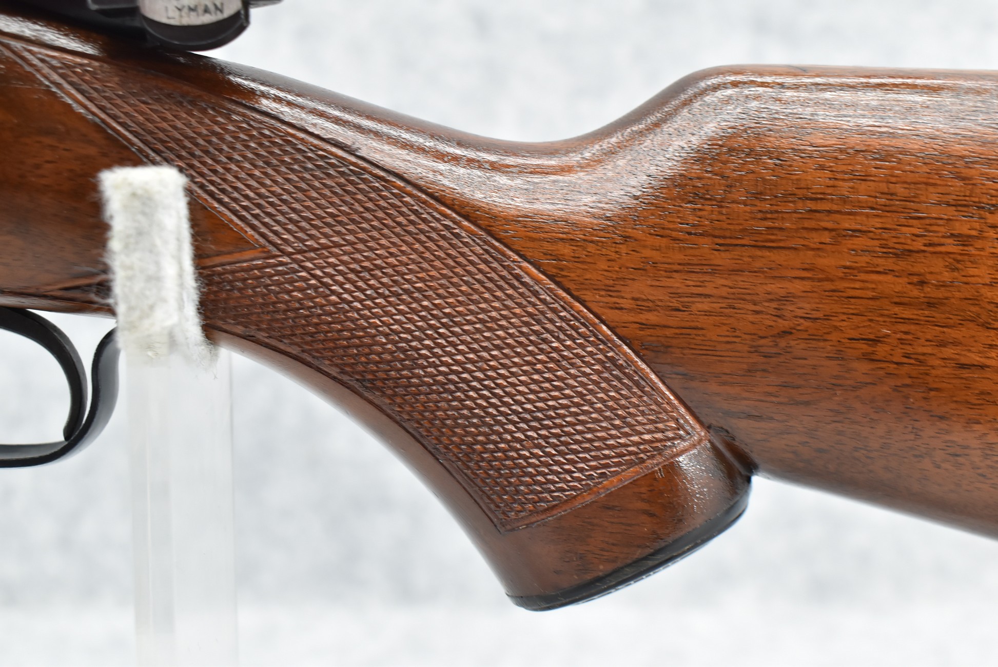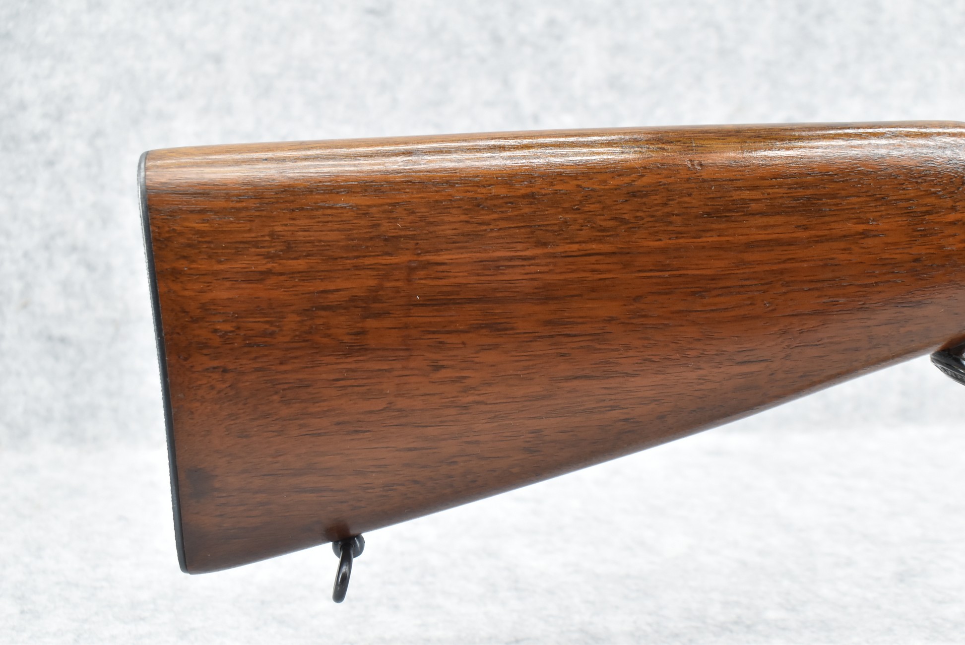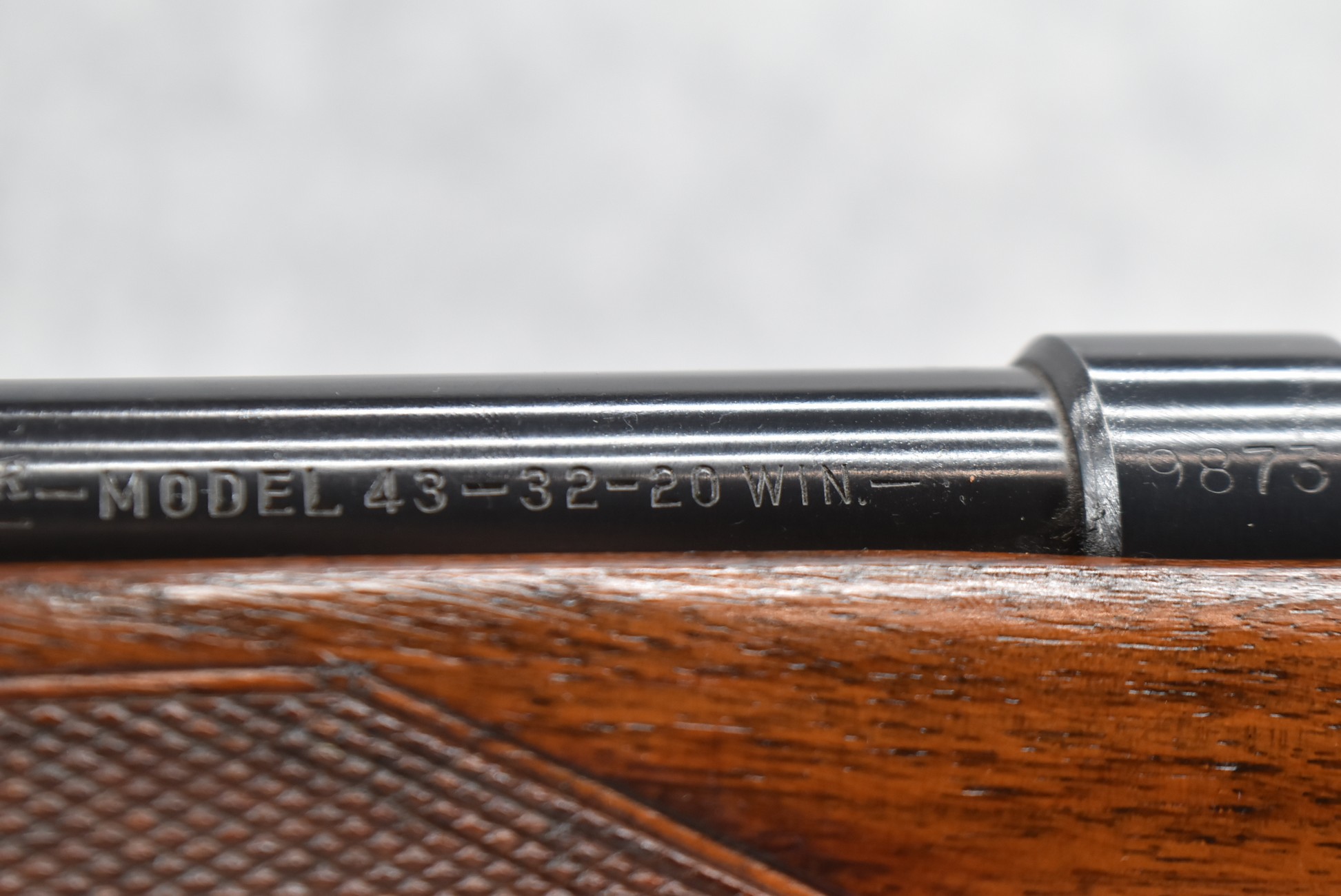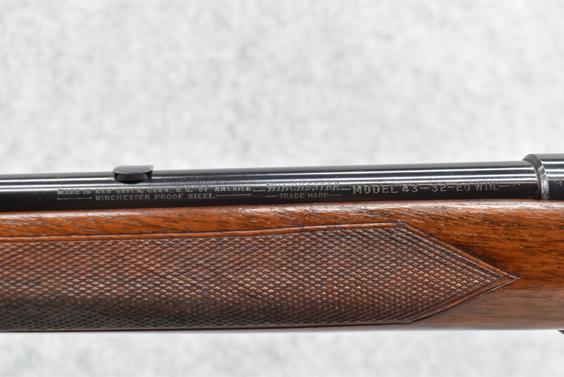376R. Winchester – Mod. 43 Deluxe – In the Scarce 32-20 Win. Cal. Bolt Action Rifle – w/24” Barrel w/Hooded Front Sight & (Rear Dovetail Blank) Lyman 57A Rear Receiver Adj. Peep Sight – Blued Finish – w/Checkered Capped Pistol Grip Deluxe Wood Stock w/Factory Metal Butt Plate – w/Factory Magazine – w/Factory Sling Swivels – Mfg. 1949