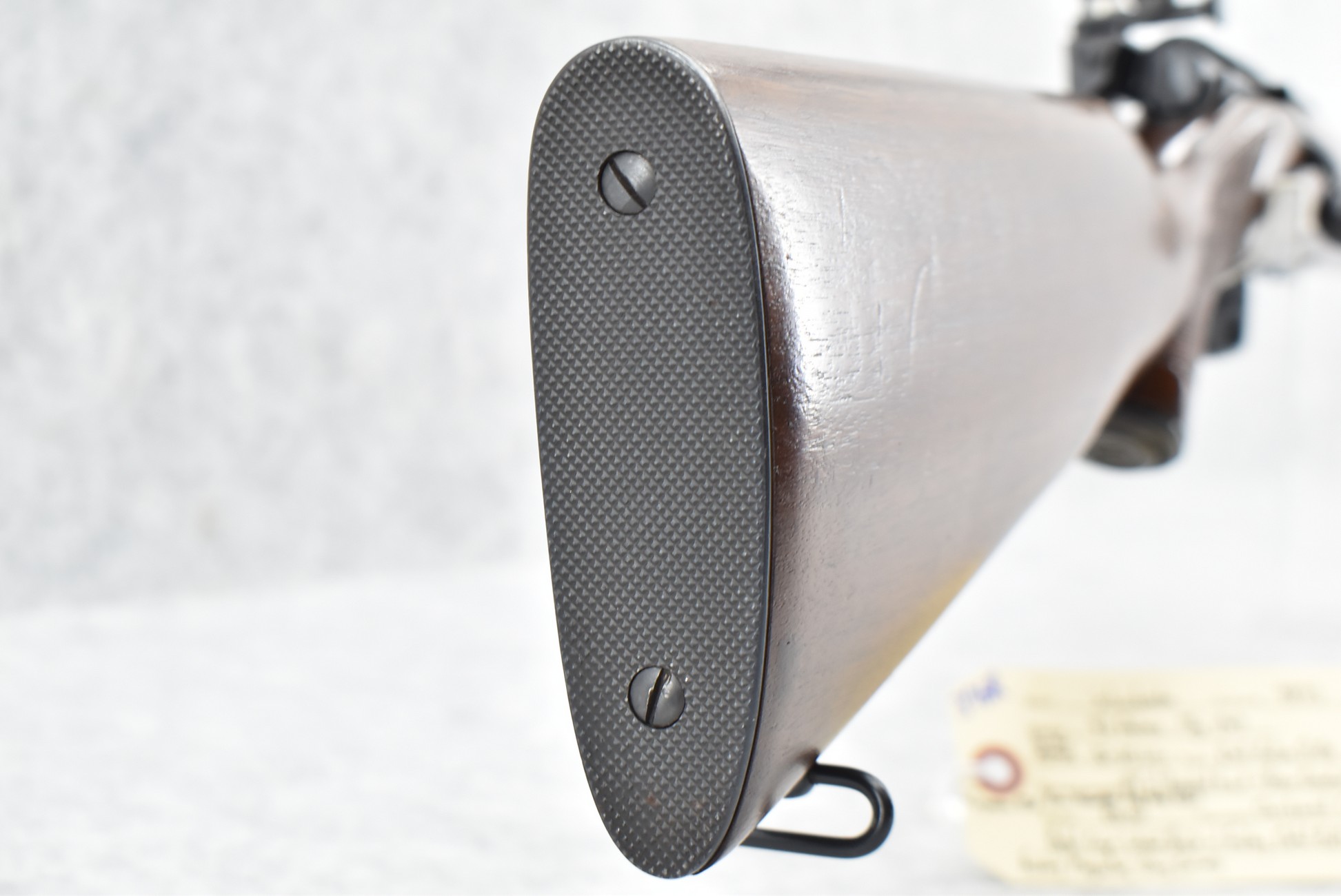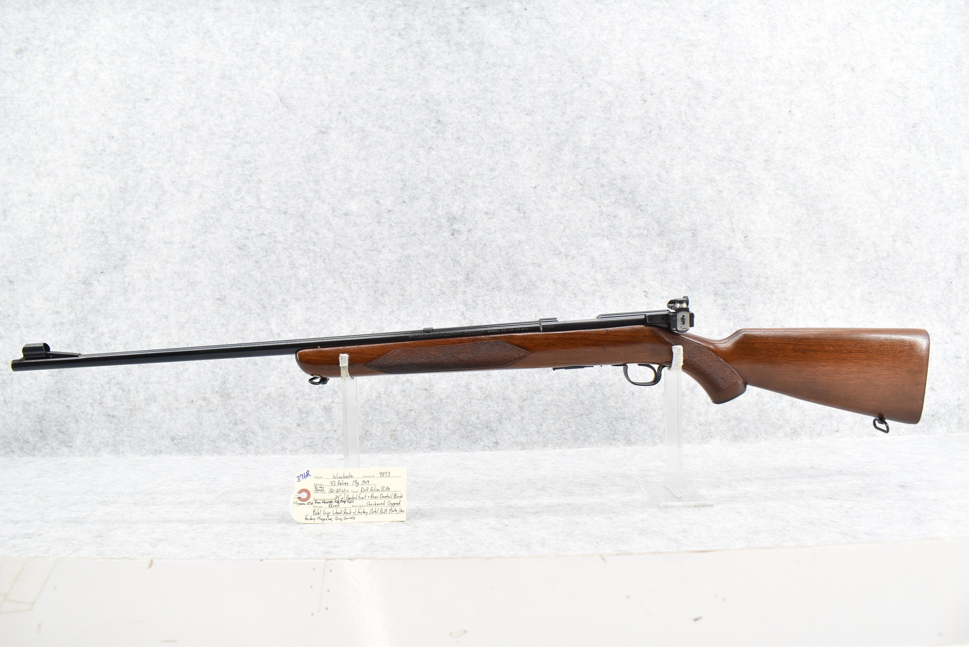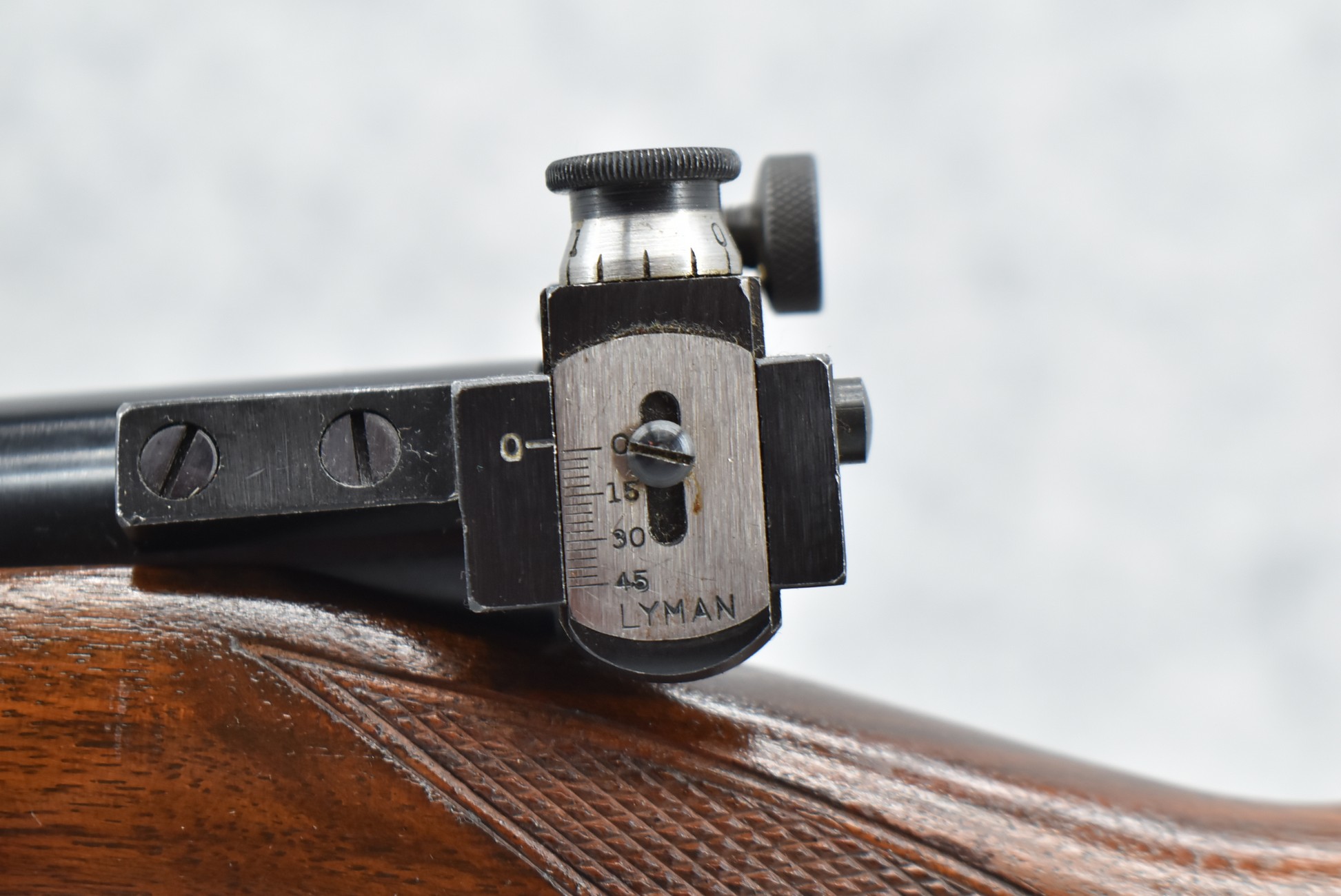 376R. Winchester – Mod. 43 Deluxe – In the Scarce 32-20 Win. Cal. Bolt Action Rifle – w/24” Barrel w/Hooded Front Sight & (Rear Dovetail Blank) Lyman 57A Rear Receiver Adj. Peep Sight – Blued Finish – w/Checkered Capped Pistol Grip Deluxe Wood Stock w/Factory Metal Butt Plate – w/Factory Magazine – w/Factory Sling Swivels – Mfg. 1949