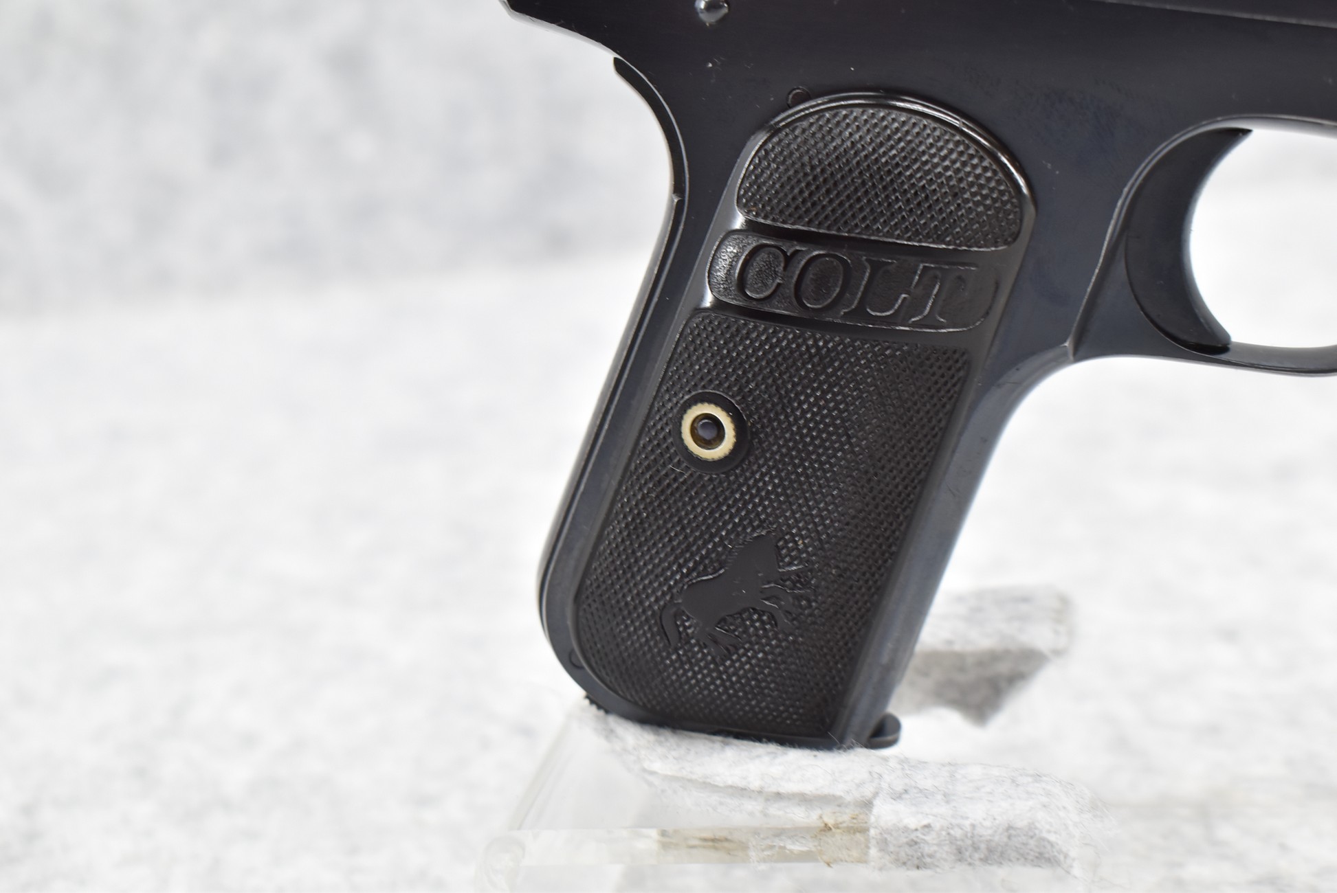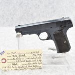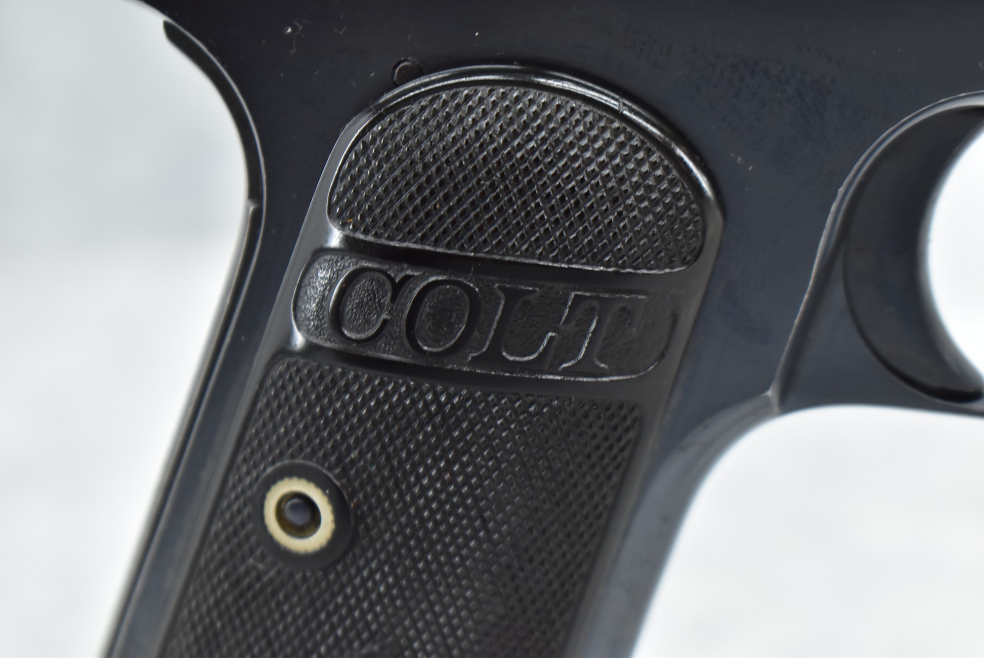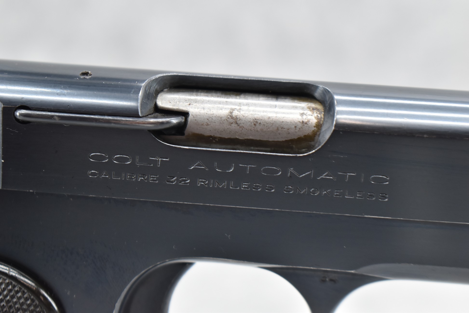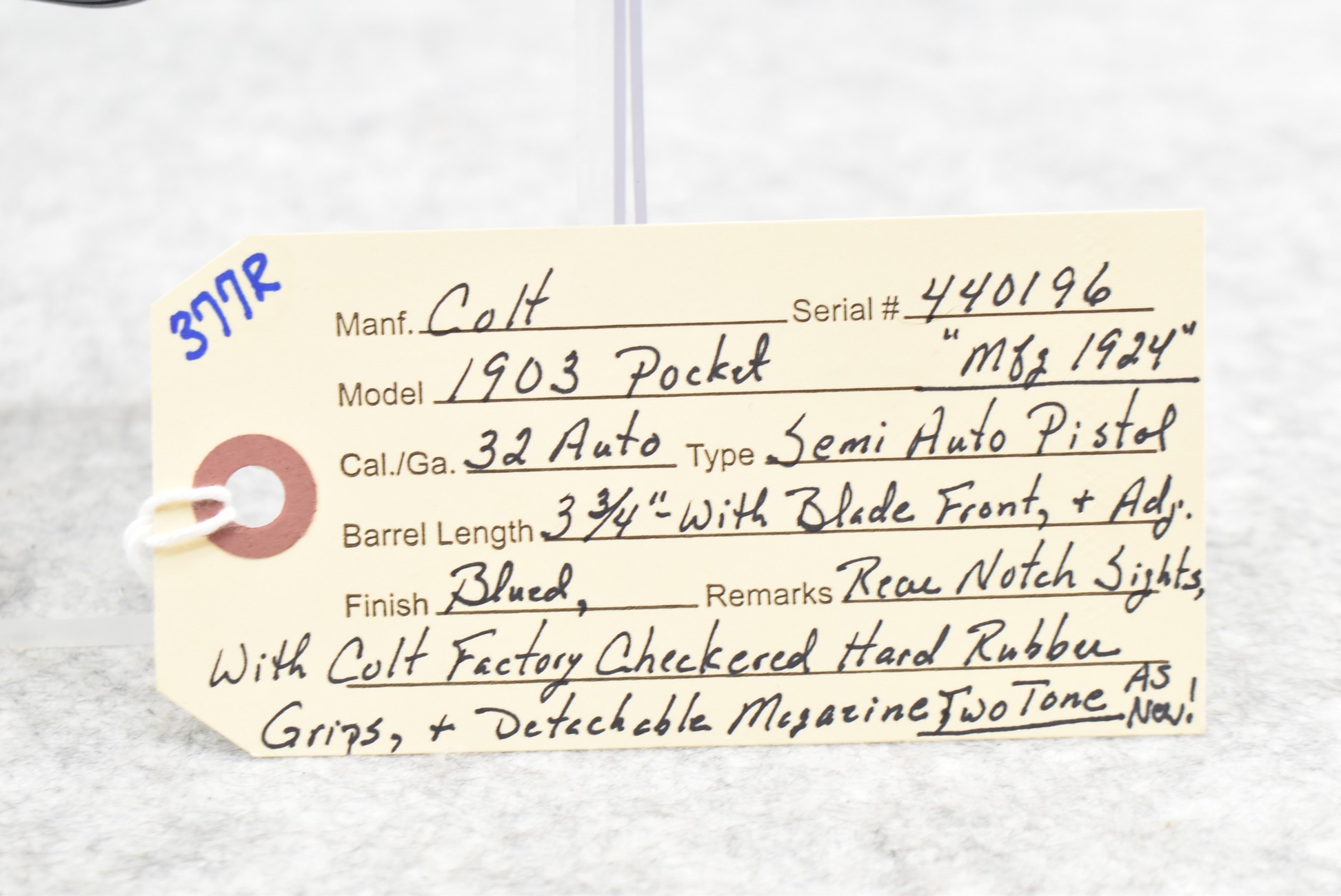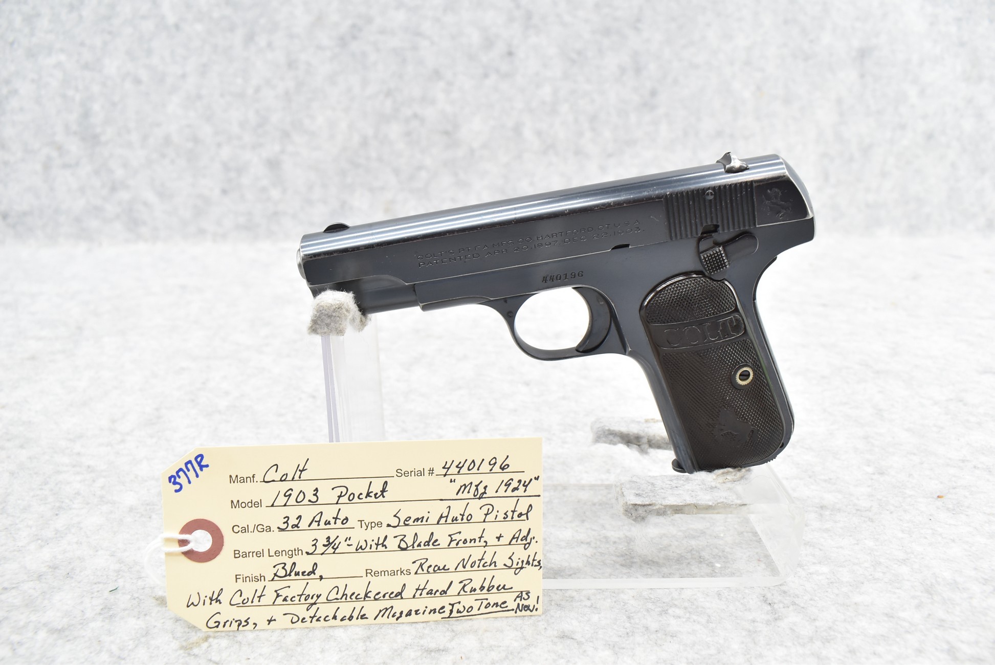 377R. Colt – Mod. 1903 Pocket – 32 Auto Cal. Semi-Auto Pistol – w/3 ¾” Barrel w/Blade Front & Adj. Rear Notch Sights – Blued Finish – w/Colt Factory Checkered Hard Rubber Grips – w/Two-Tone Detachable Magazine – As New – Mfg. 1924