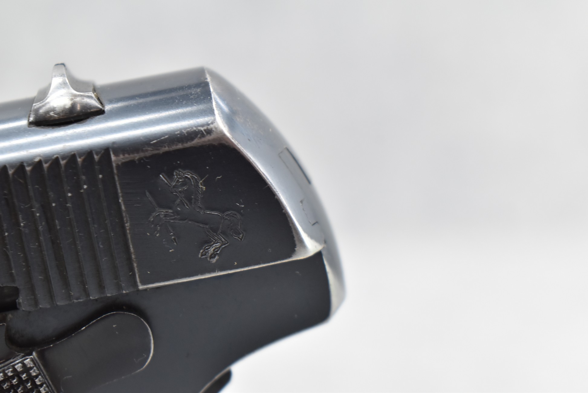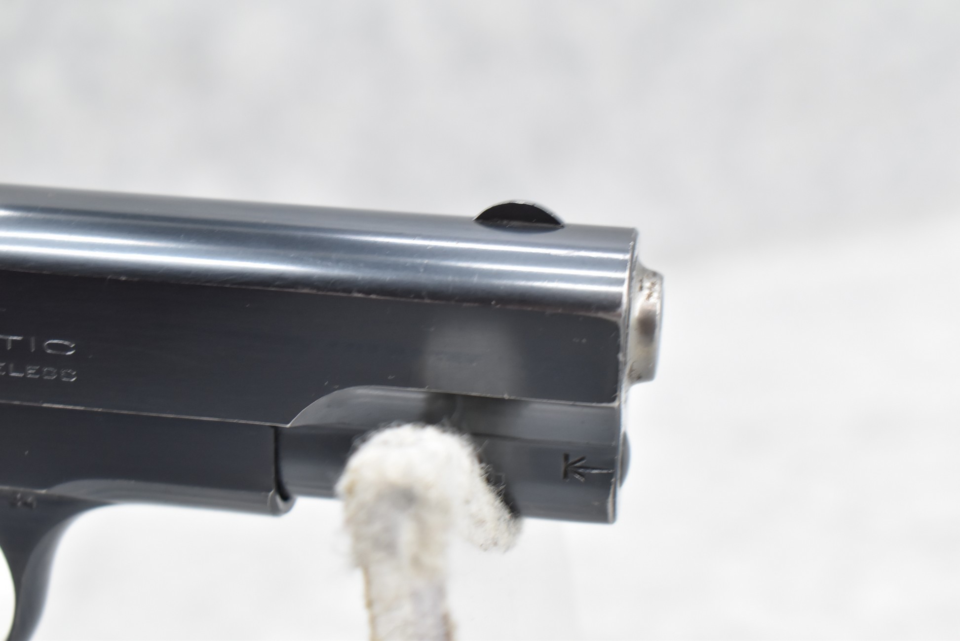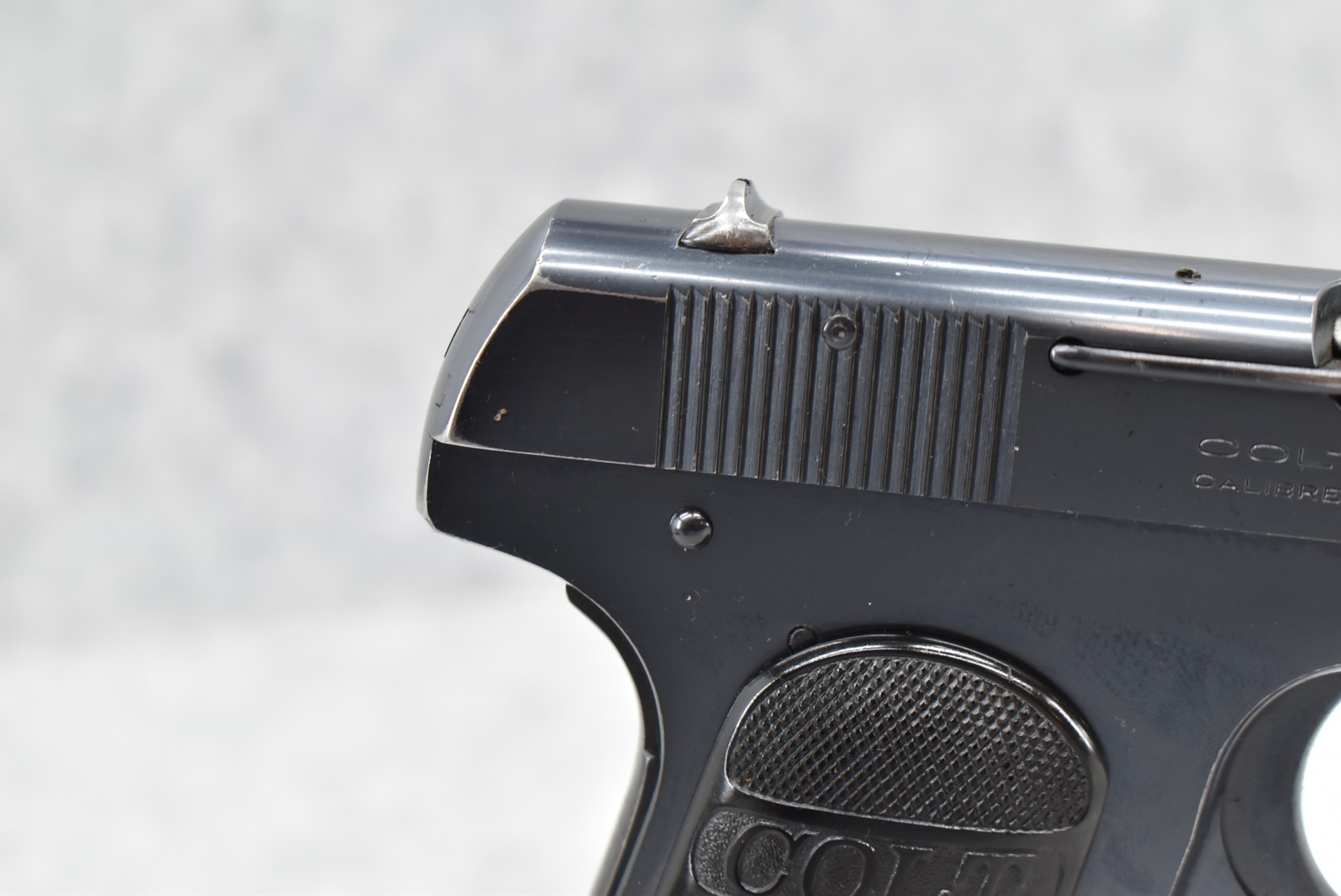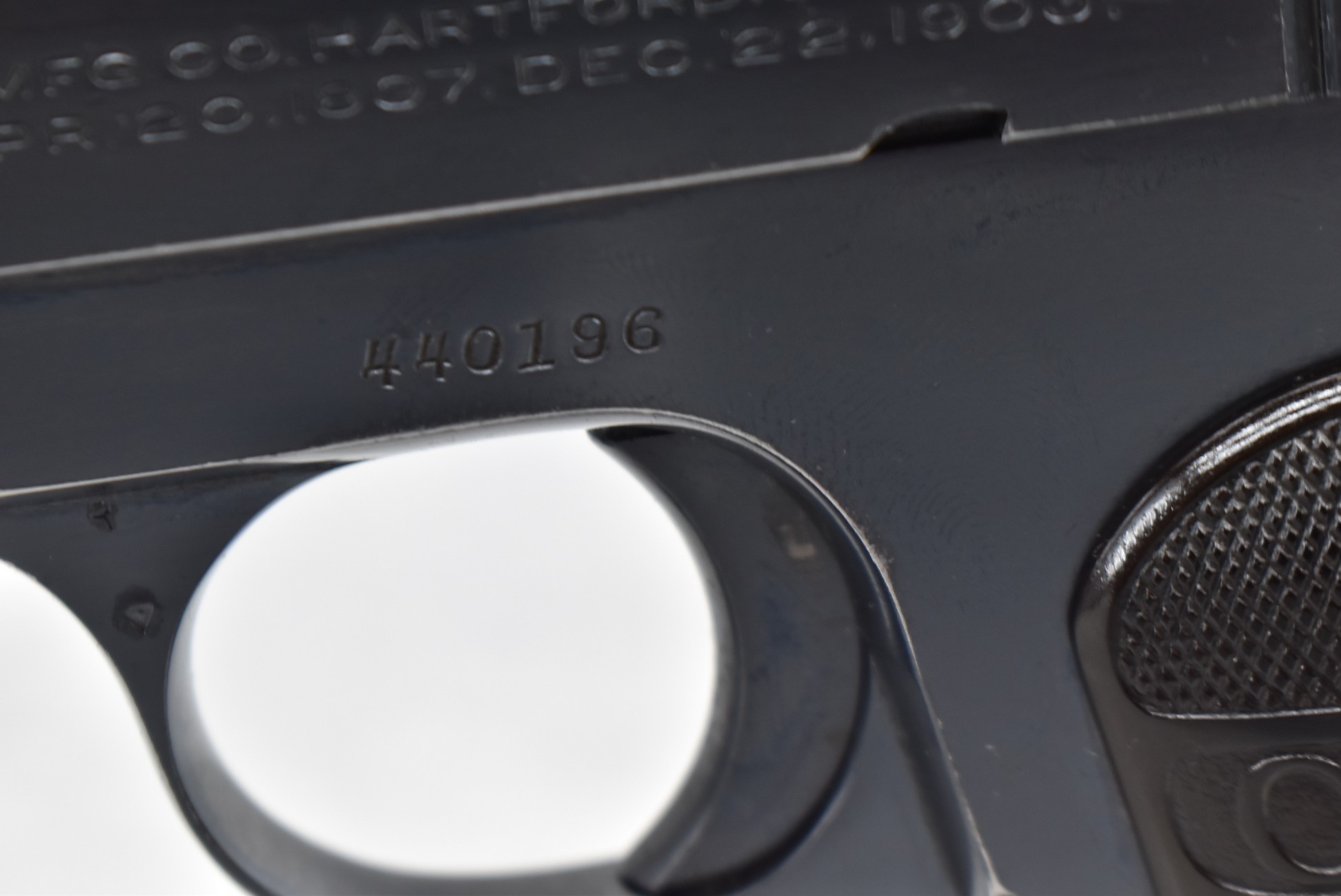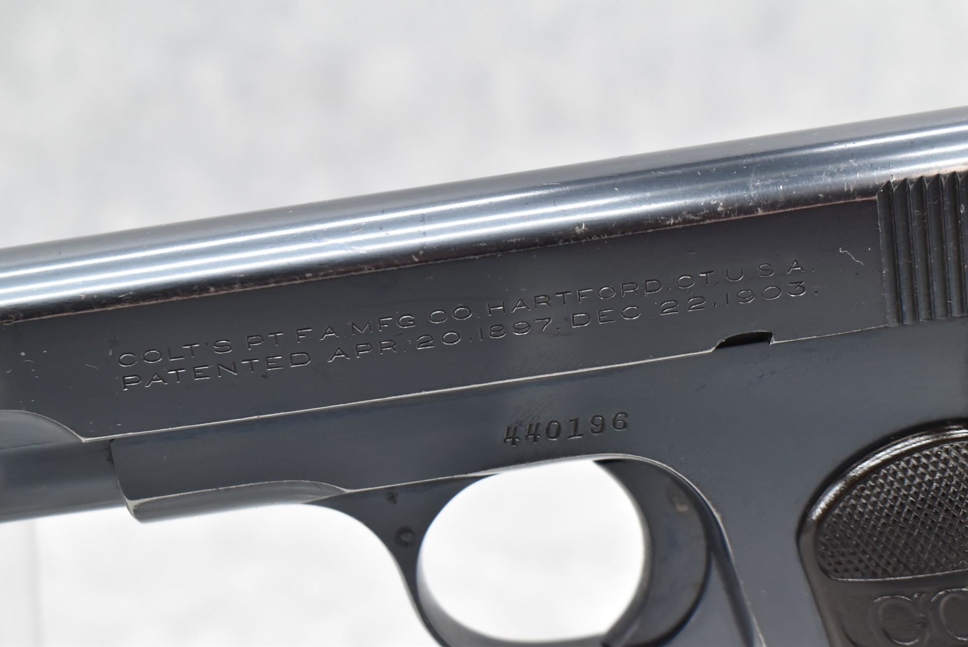 377R. Colt – Mod. 1903 Pocket – 32 Auto Cal. Semi-Auto Pistol – w/3 ¾” Barrel w/Blade Front & Adj. Rear Notch Sights – Blued Finish – w/Colt Factory Checkered Hard Rubber Grips – w/Two-Tone Detachable Magazine – As New – Mfg. 1924