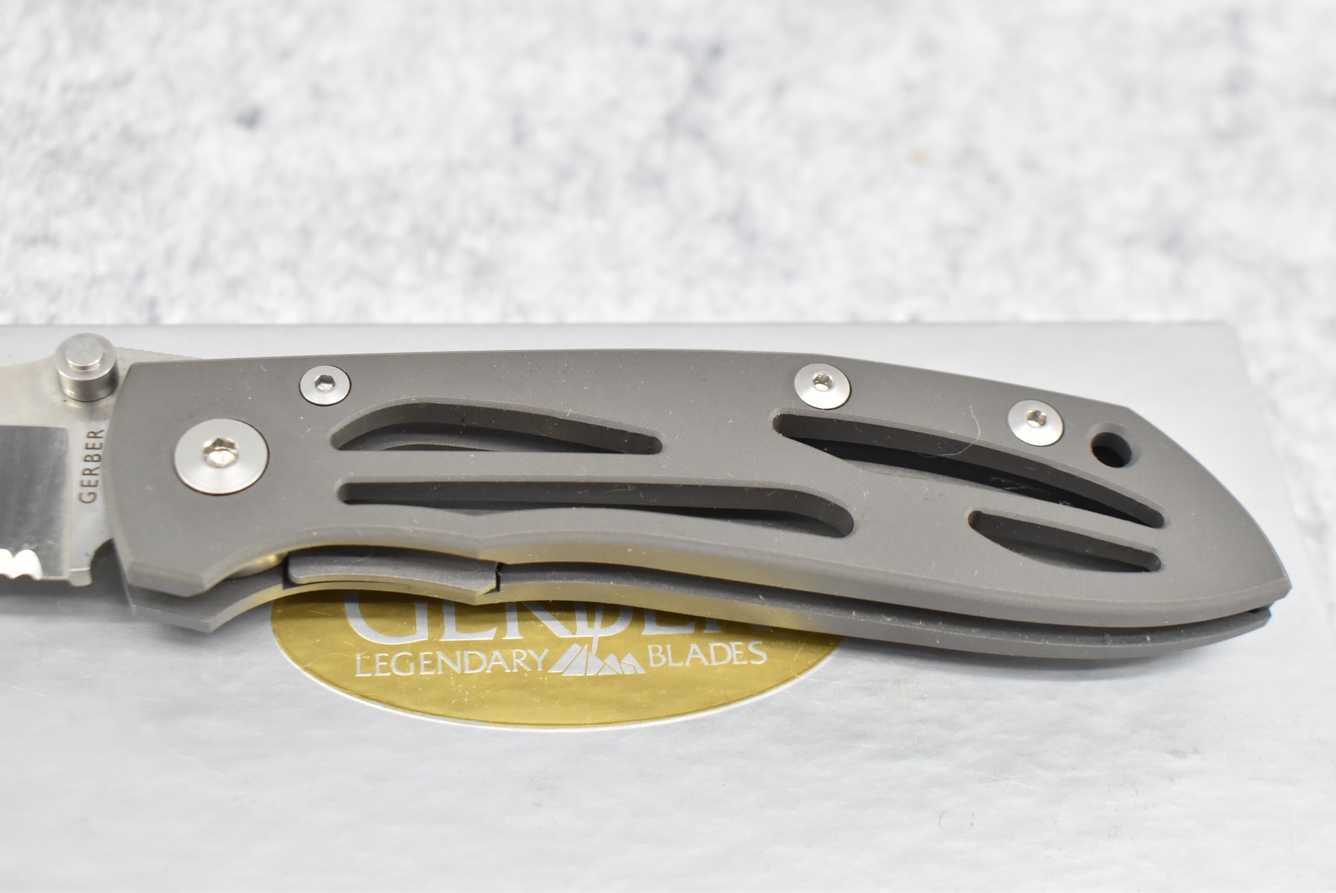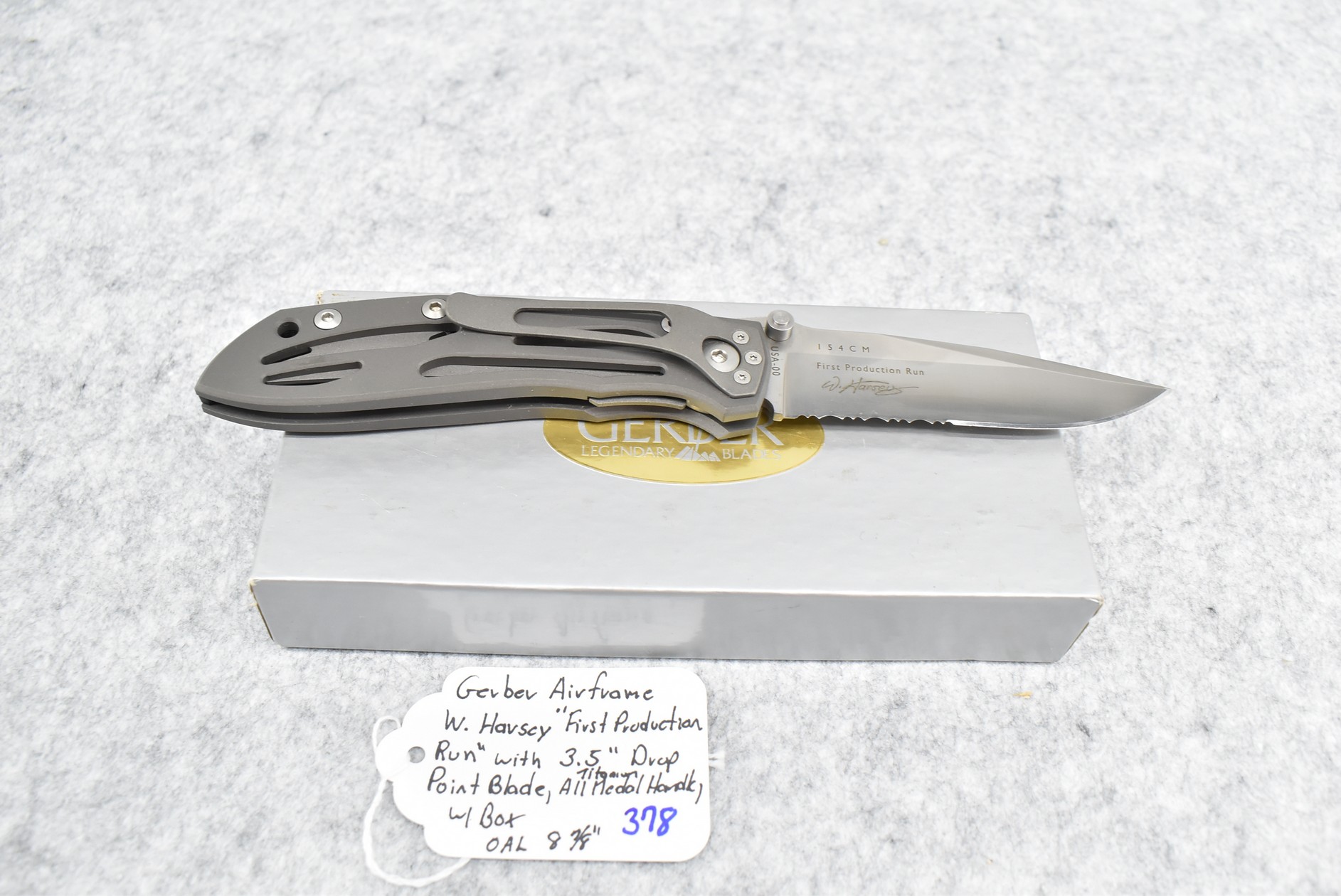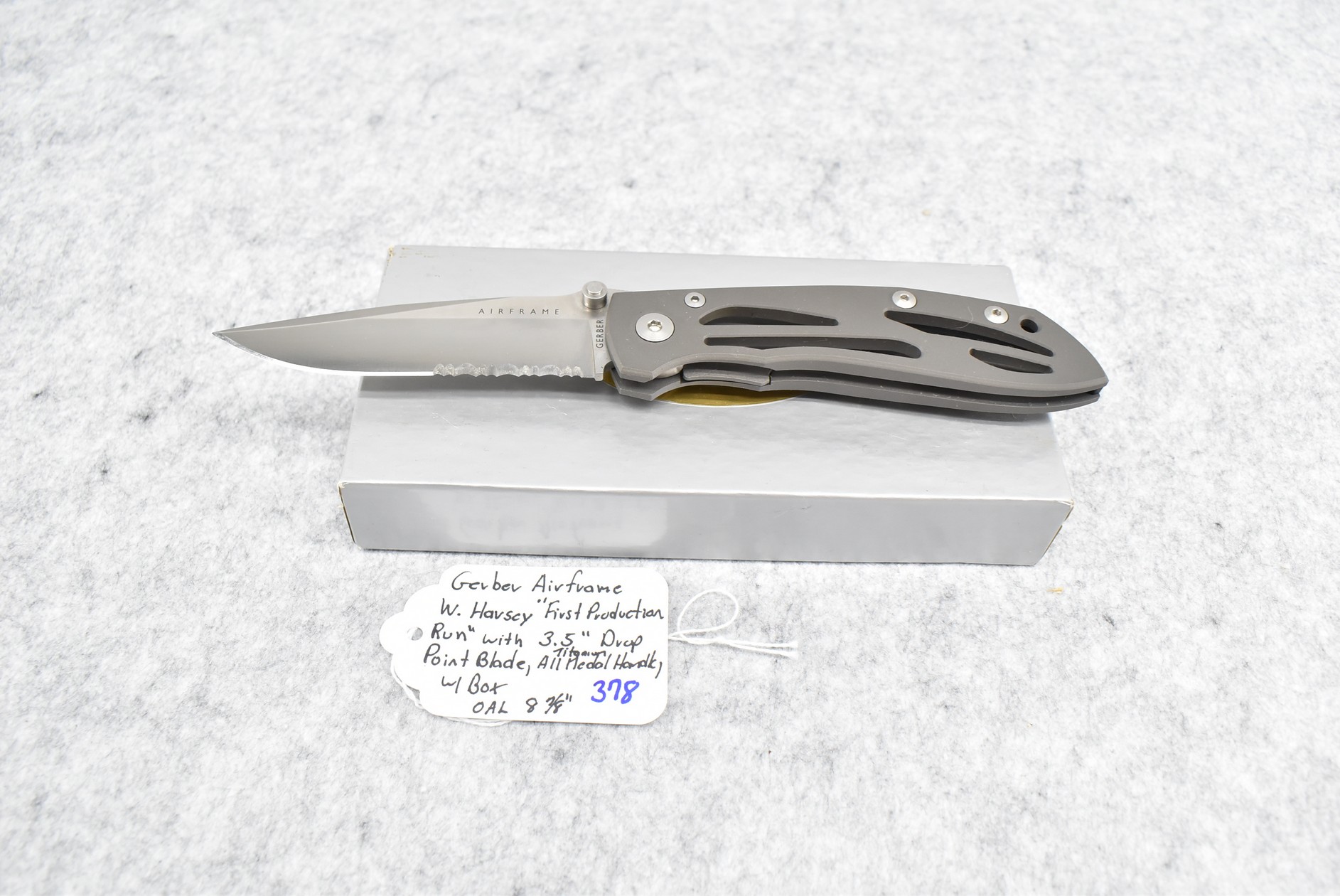 378. Gerber – Airframe W. Harsey “First Production Run” w/3.5” Drop Point Blade – Overall Length 8 7/8” – w/All Titanium Medal Handle – w/Box
