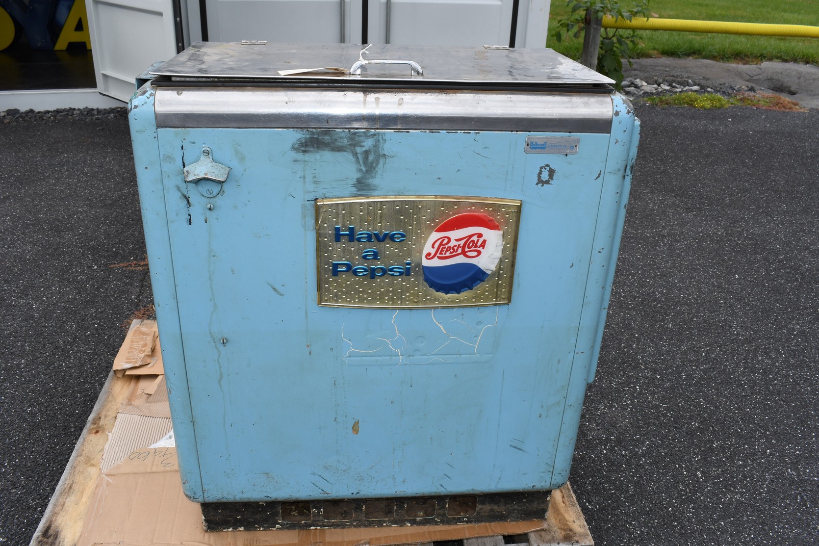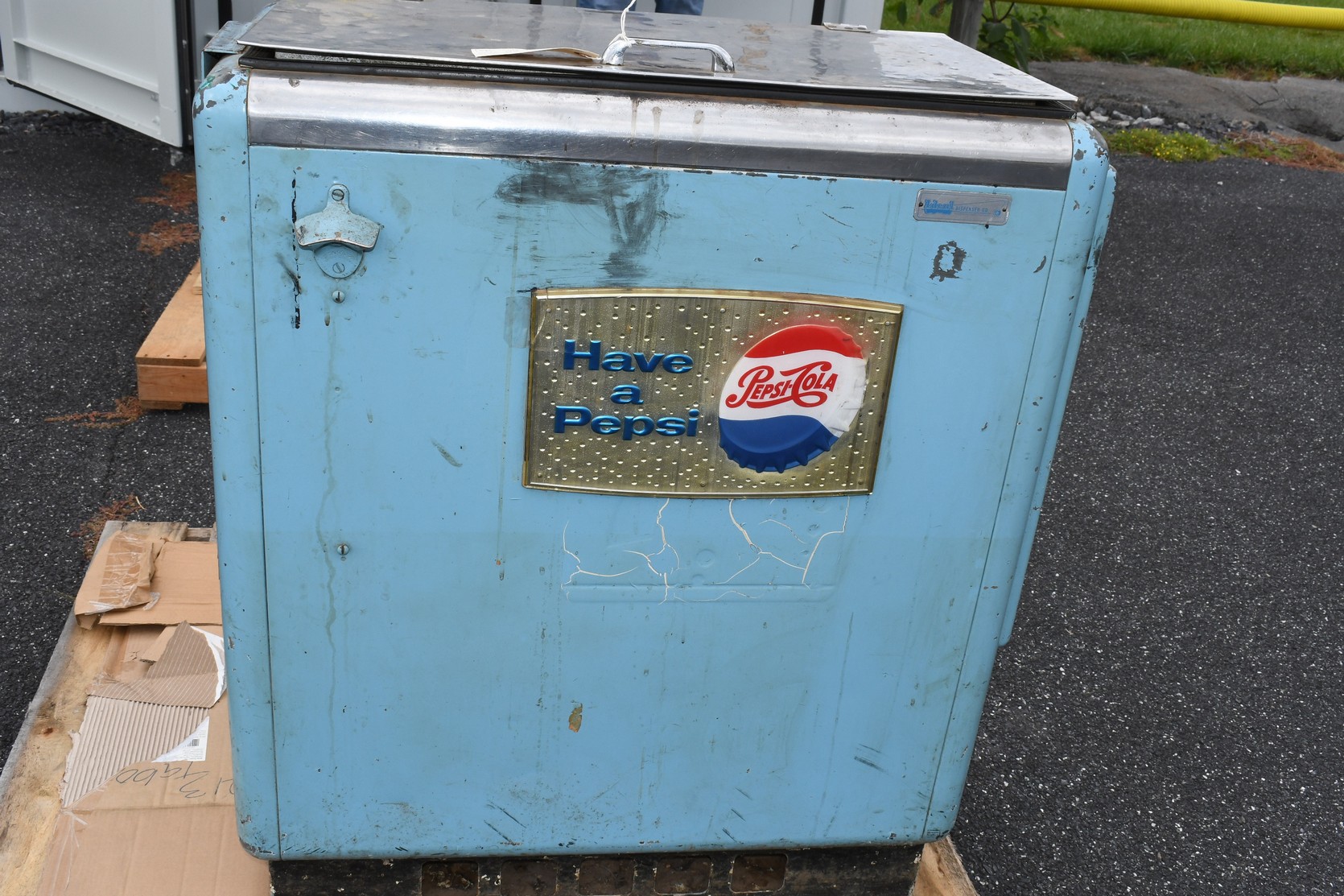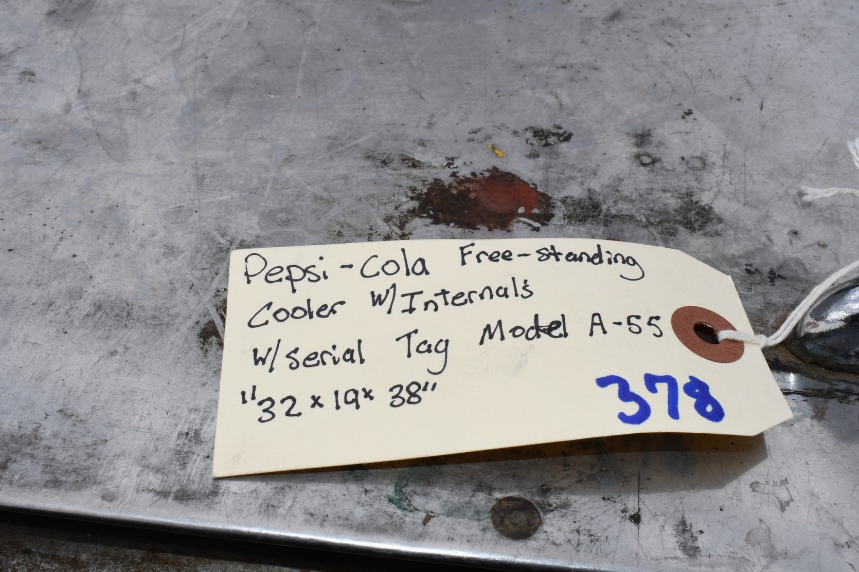 378.   Vintage Pepsi Cola Free Standing Electric Cooler – Cooler is Complete w/Internals – Tag Model is A-55 – Measures 32” x 19” x 38” – Will Not Ship, Pickup Only or You Must Arrange Your Own Shipping!