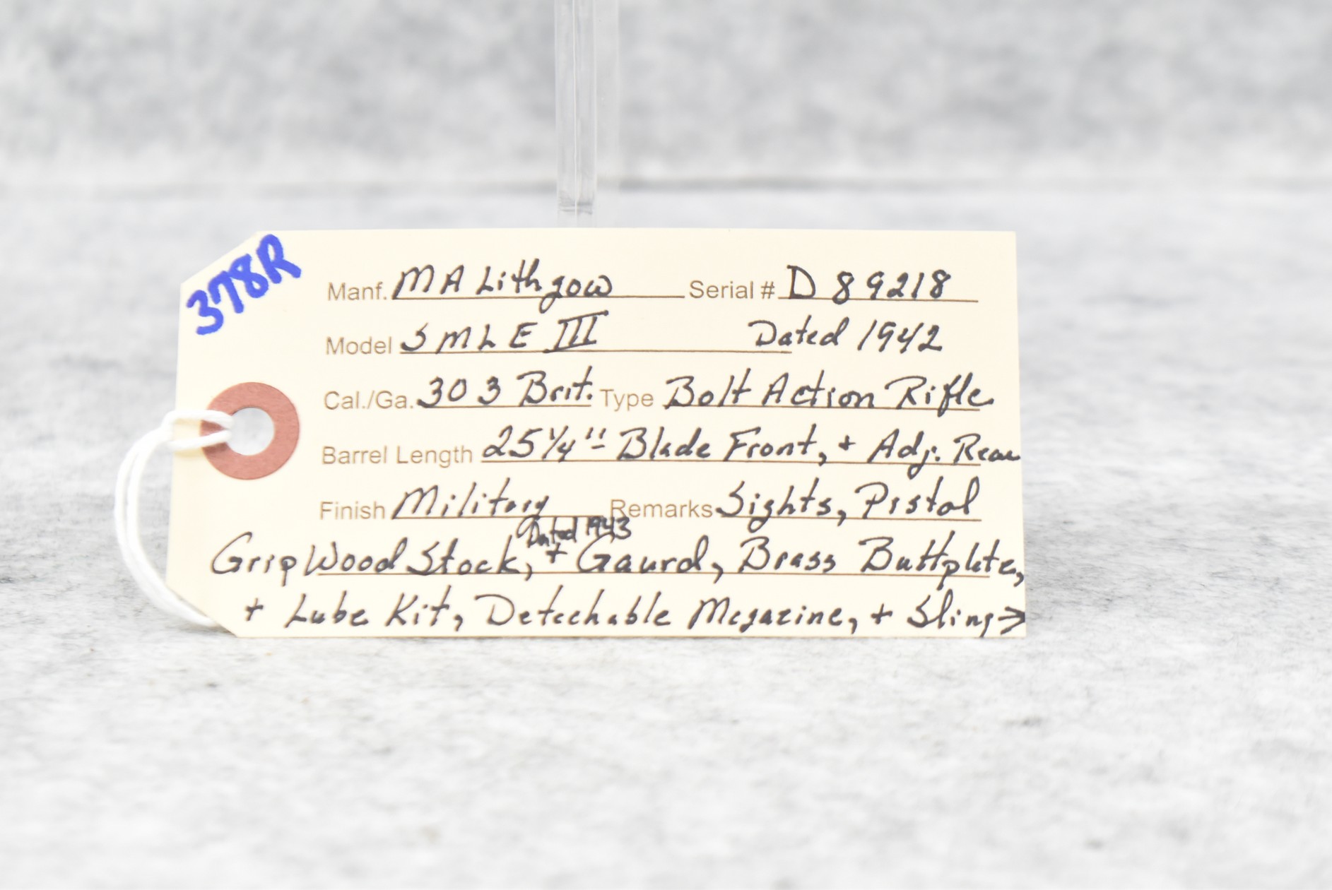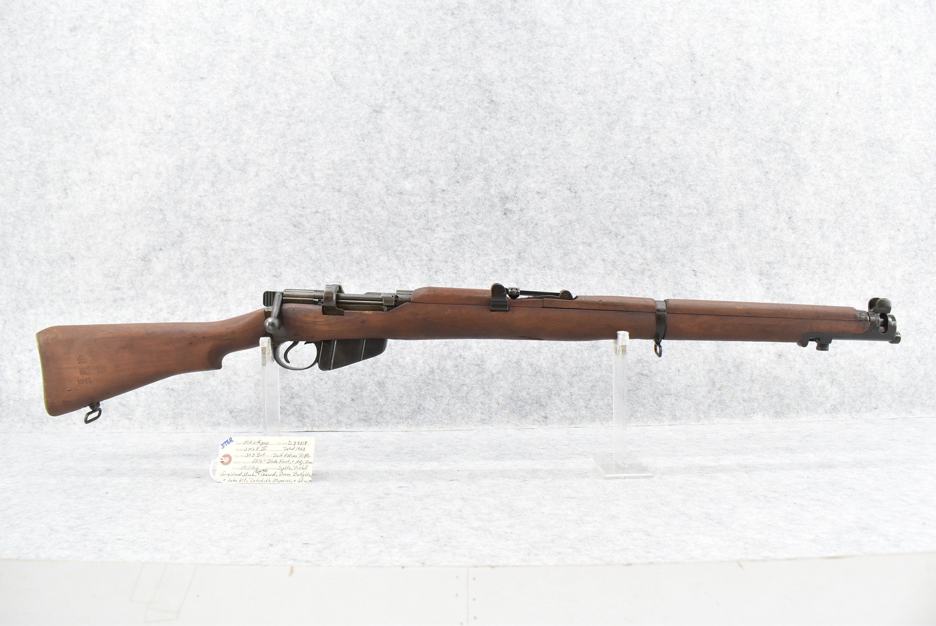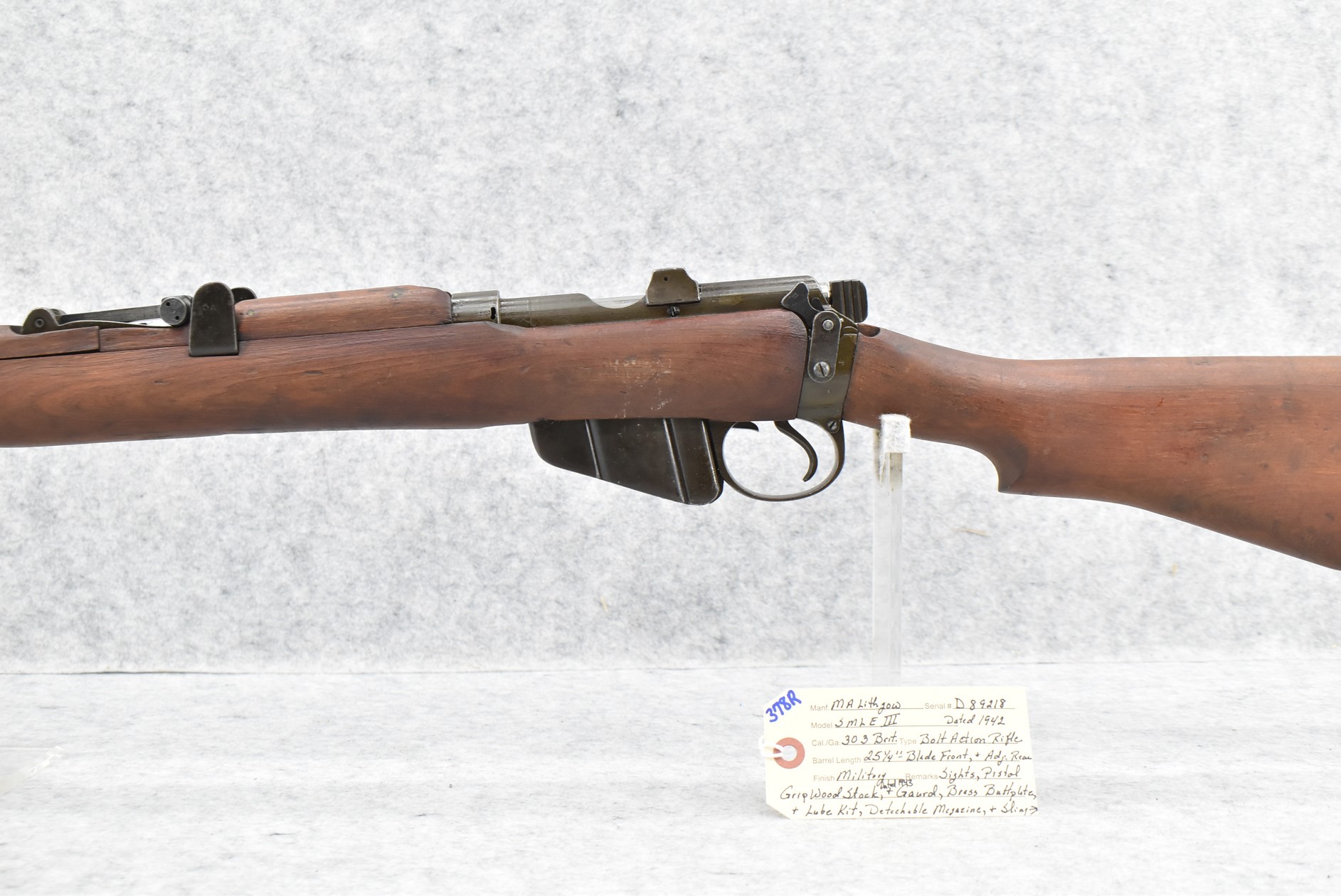 378R. MA Lithgow – Mod. SMLE III – 303 Brit. Cal. Bolt Action Rifle – w/25 ¼” Barrel w/Blade Front & Adj. Rear Sights – Military Finish – w/Pistol Grip Wood Stocks Dated 1943 w/Brass Butt Plate & Lube Kit – w/Detachable Magazine – w/Sling Loops – Dated 1942 – No Visible Import Marks