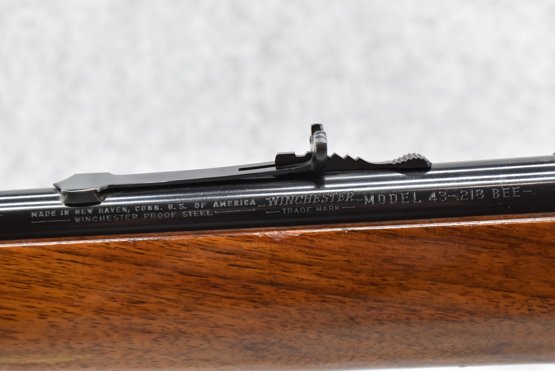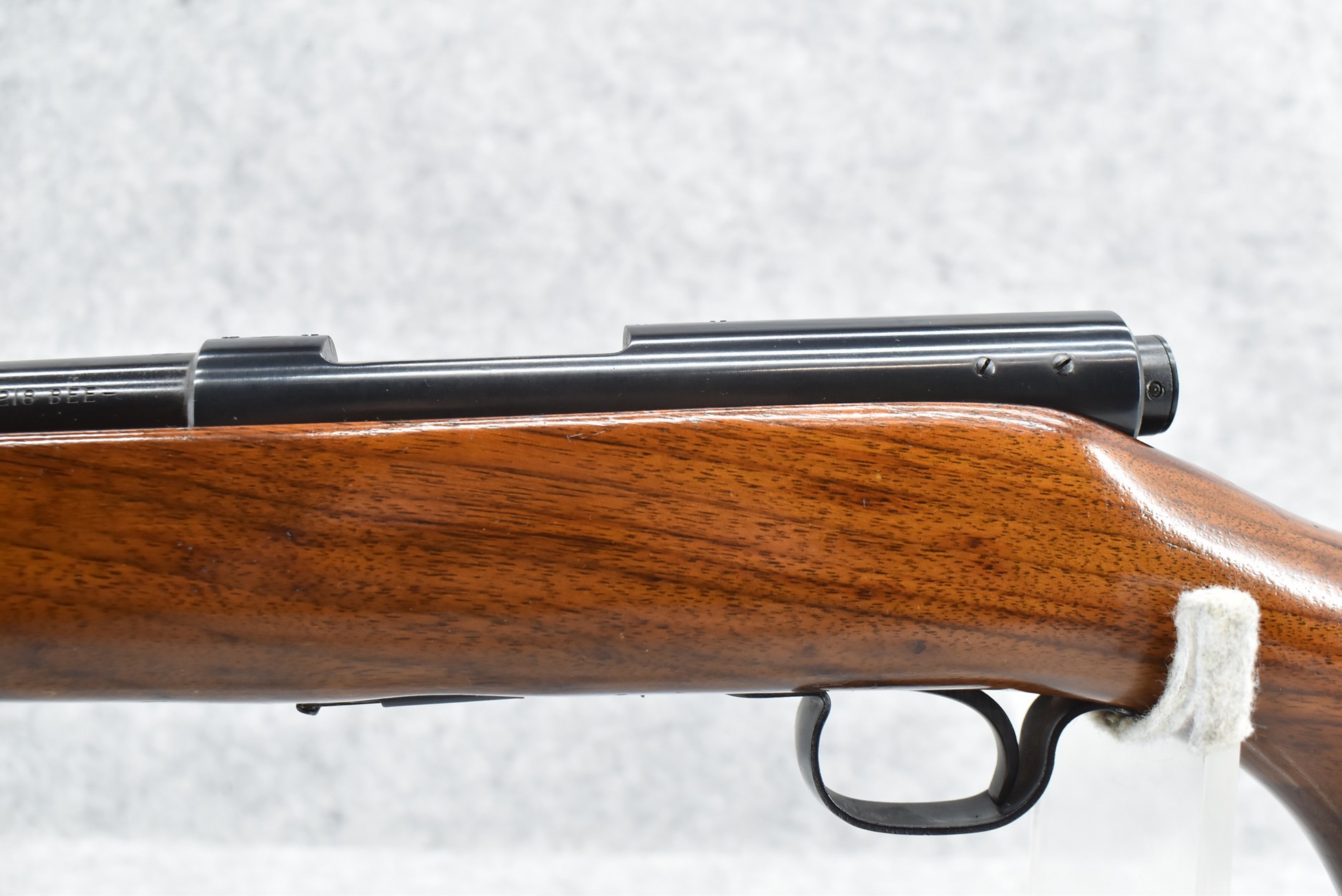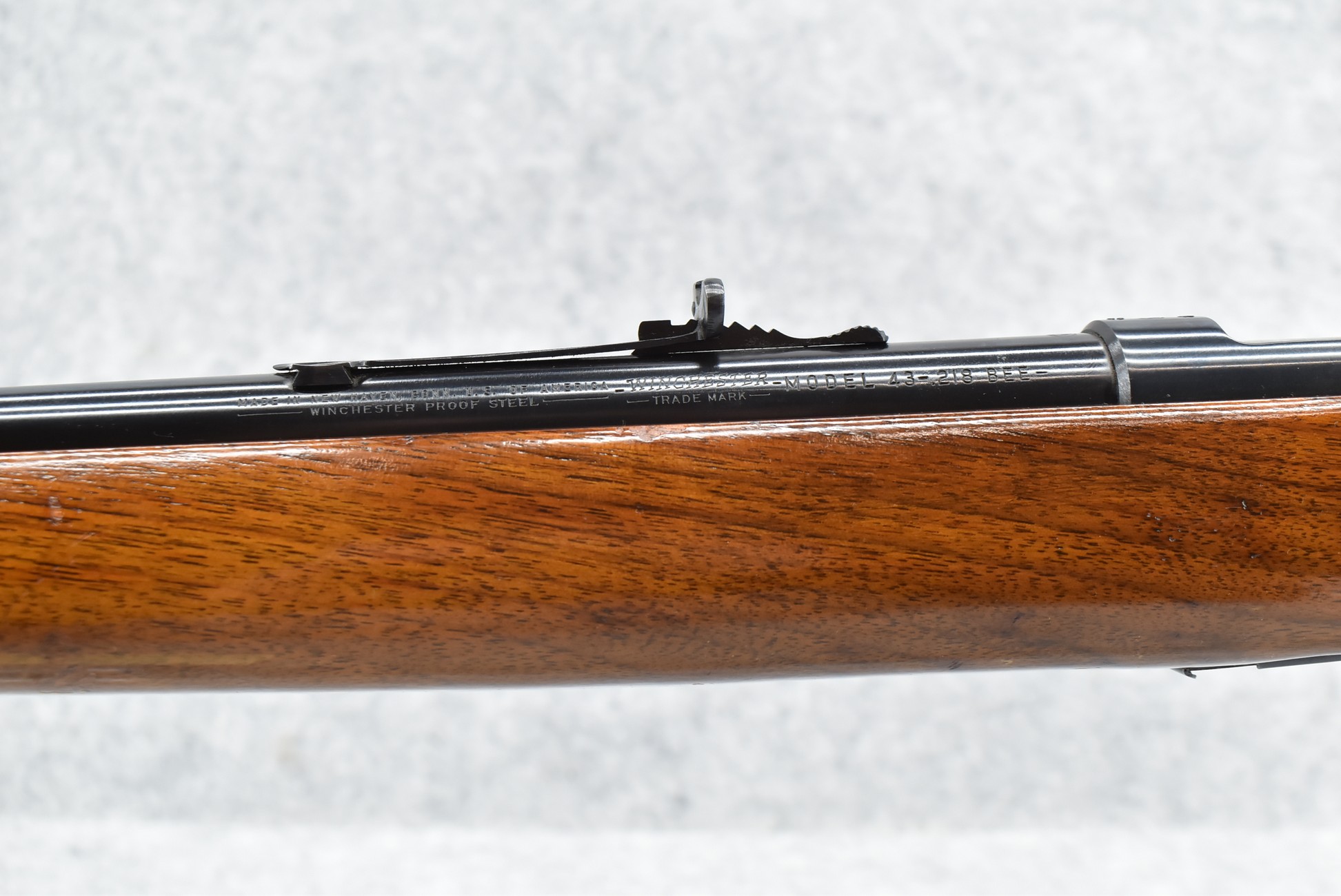 378R. Winchester – Mod. 43 Standard – 218 Bee Cal. Bolt Action Rifle – w/24” Barrel w/Hooded Front & Semi-Buckhorn Rear Sights – Blued Finish – w/Pistol Grip Wood Stock w/Factory Metal Butt Plate – w/Factory Magazine – w/Sling Swivels – Factory Drilled & Tapped – Mfg. 1951