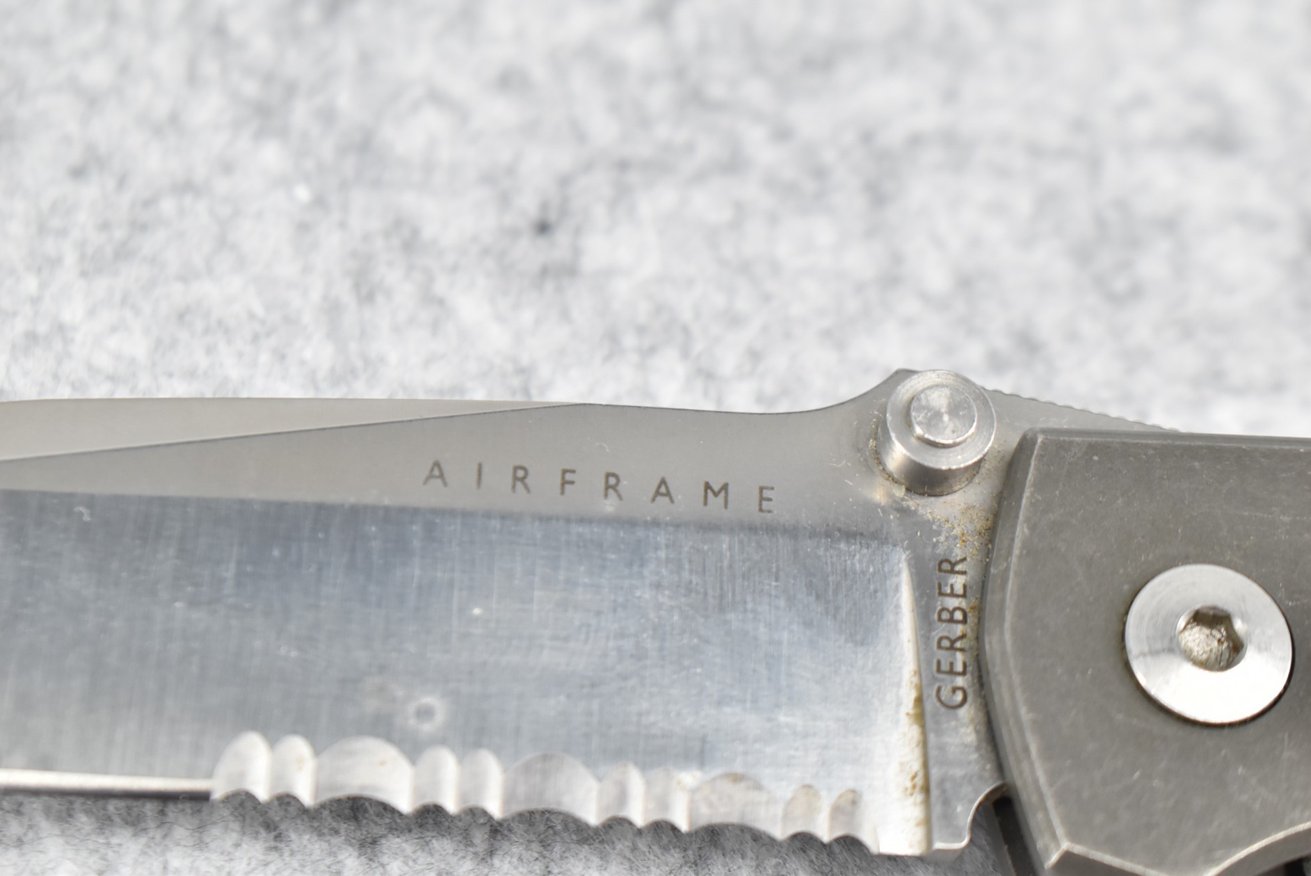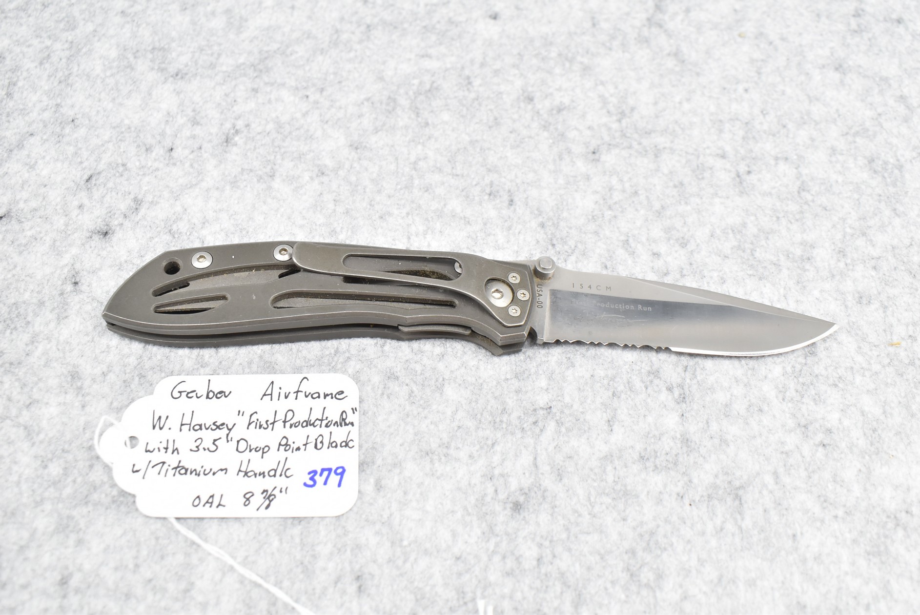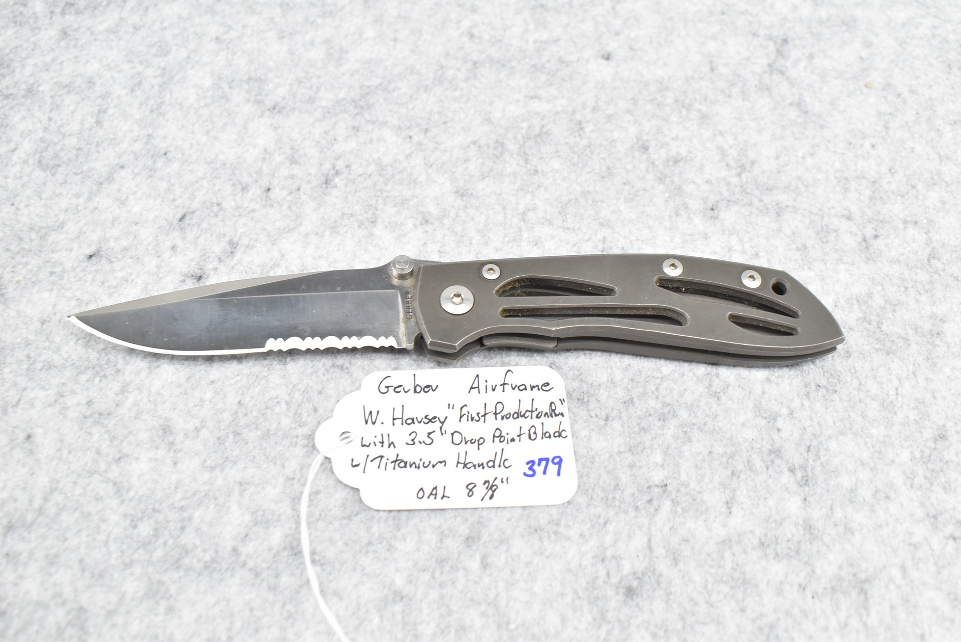 379. Gerber – Airframe W. Harsey “First Production Run” w/3.5” Drop Point Blade – Overall Length 8 7/8” – w/All Titanium Medal Handle