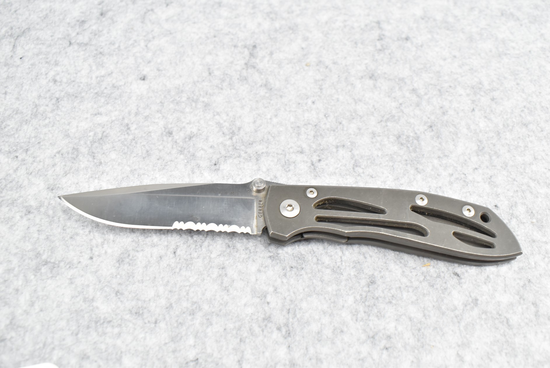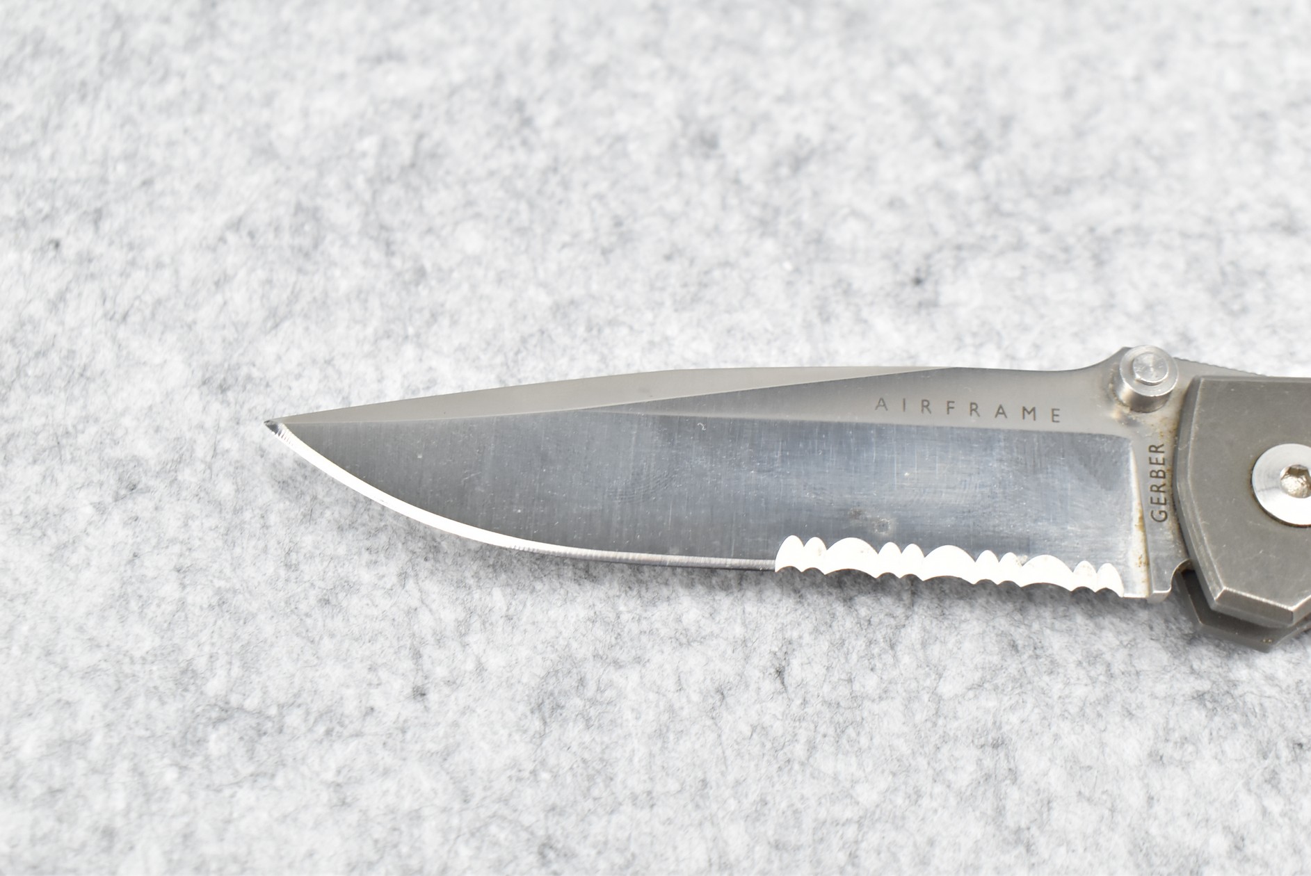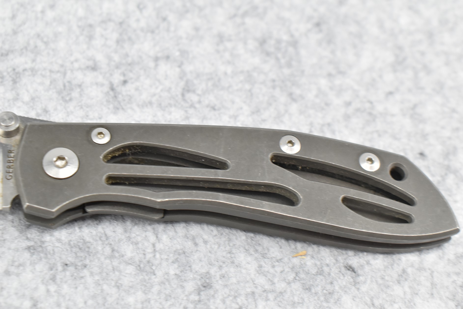 379. Gerber – Airframe W. Harsey “First Production Run” w/3.5” Drop Point Blade – Overall Length 8 7/8” – w/All Titanium Medal Handle
