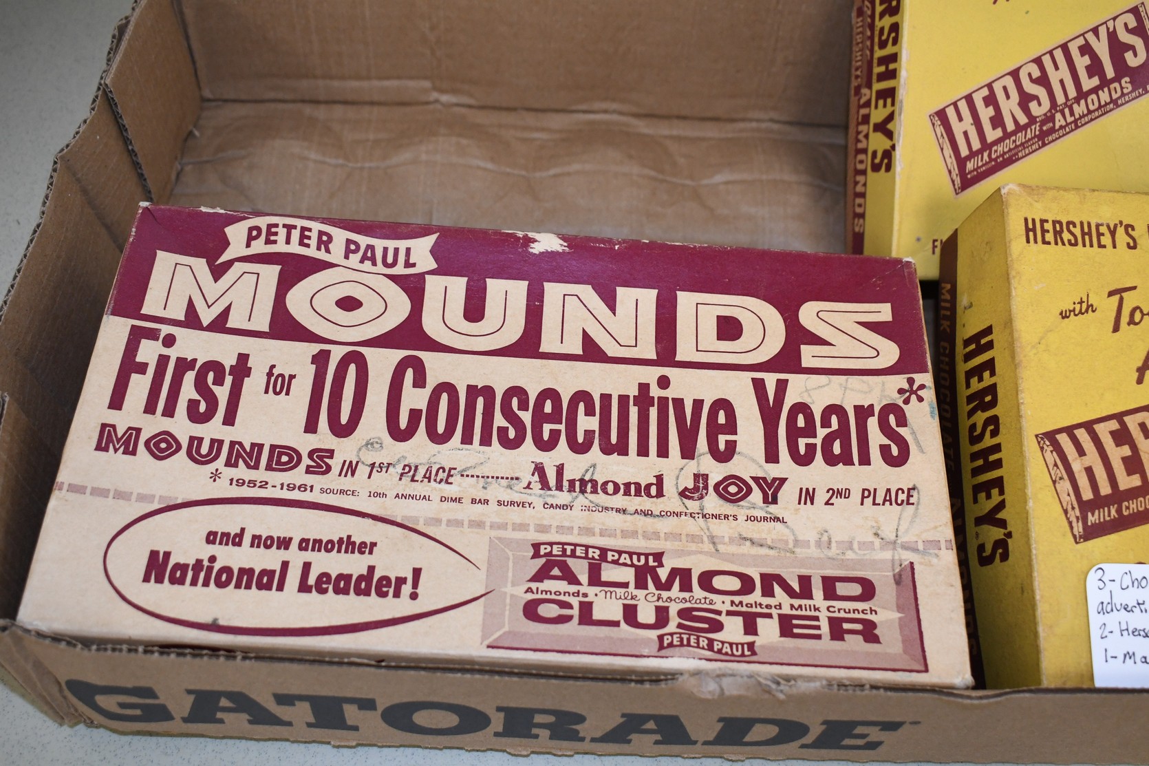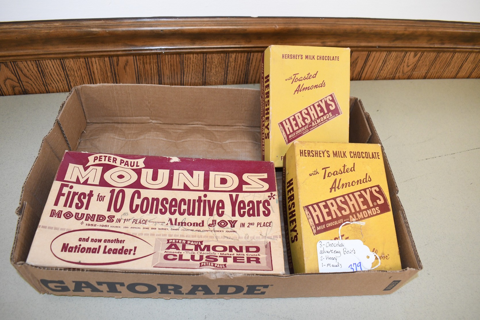 379. Lot of 3 Vintage Candy Boxes Including: 2 Hershey’s Milk Chocolate w/Almonds and Peter Paul Mounds Almond Clusters
