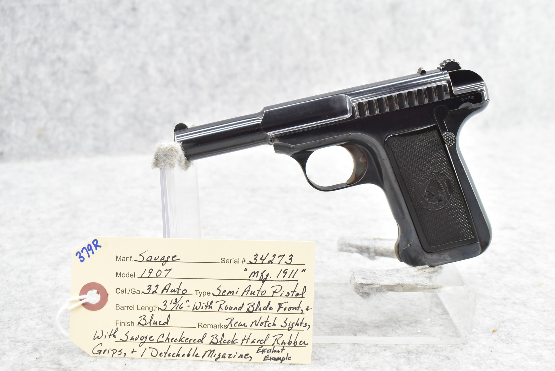 379R. Savage – Mod. 1907 – 32 Auto Cal. Semi-Auto Pistol – w/3 13/16” Barrel w/Round Blade Front & Rear Notch Sights – Blued Finish – w/Savage Checkered Black Hard Rubber Grips – w/Detachable Magazine – Mfg. 1911 – Excellent Example