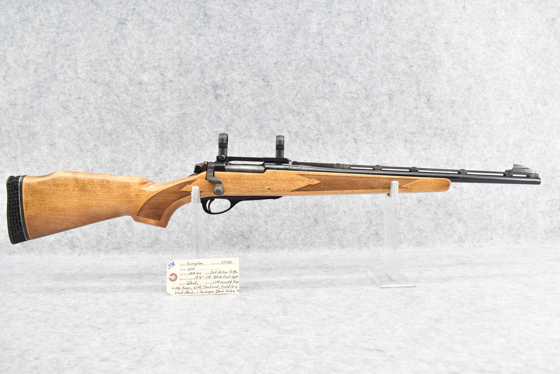 37R. Remington – Mod. 600 – 243 Win. Cal. Bolt Action Rifle – w/18 ½” Vent-Rib Barrel w/Blade Front Sight – Blued Finish – w/Checkered Pistol Grip Wood Stock w/Pachmayr Butt Pad – w/Leupold Rings & Mounting Bases