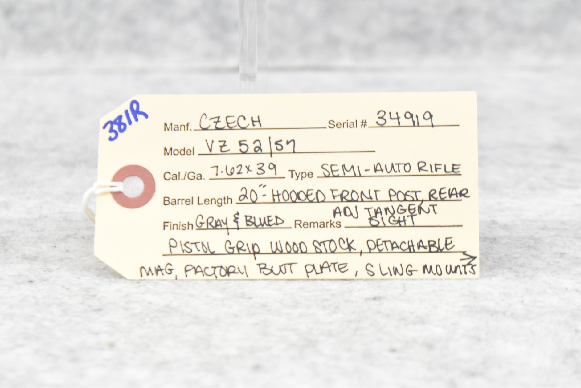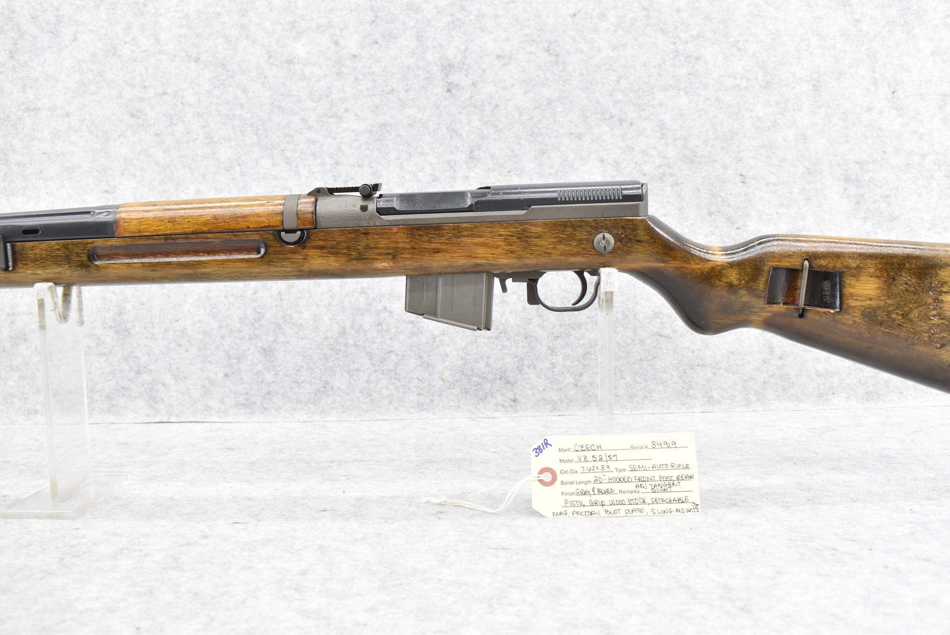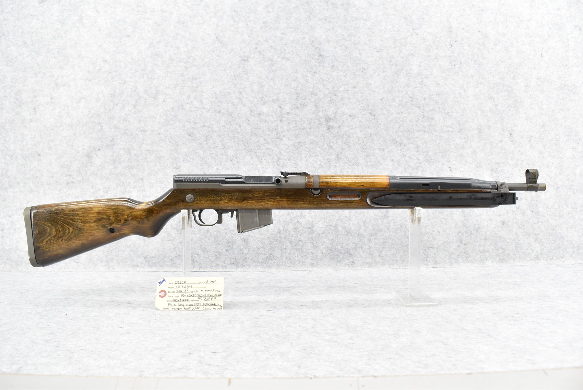 381R. Czech – Mod. VZ 52/57 – 7.62×39 Cal. Semi-Auto Rifle – w/20” Barrel w/Hooded Front Post & Rear Adj. Tangent Sights – Grayed/Blued Finish – w/Pistol Grip Wood Stock w/Factory Butt Plate & Black Polymer Upper – w/Detachable Mag – w/Sling Mounts – w/Side Folding Bayonet – No Visible Import Marks