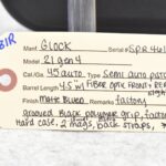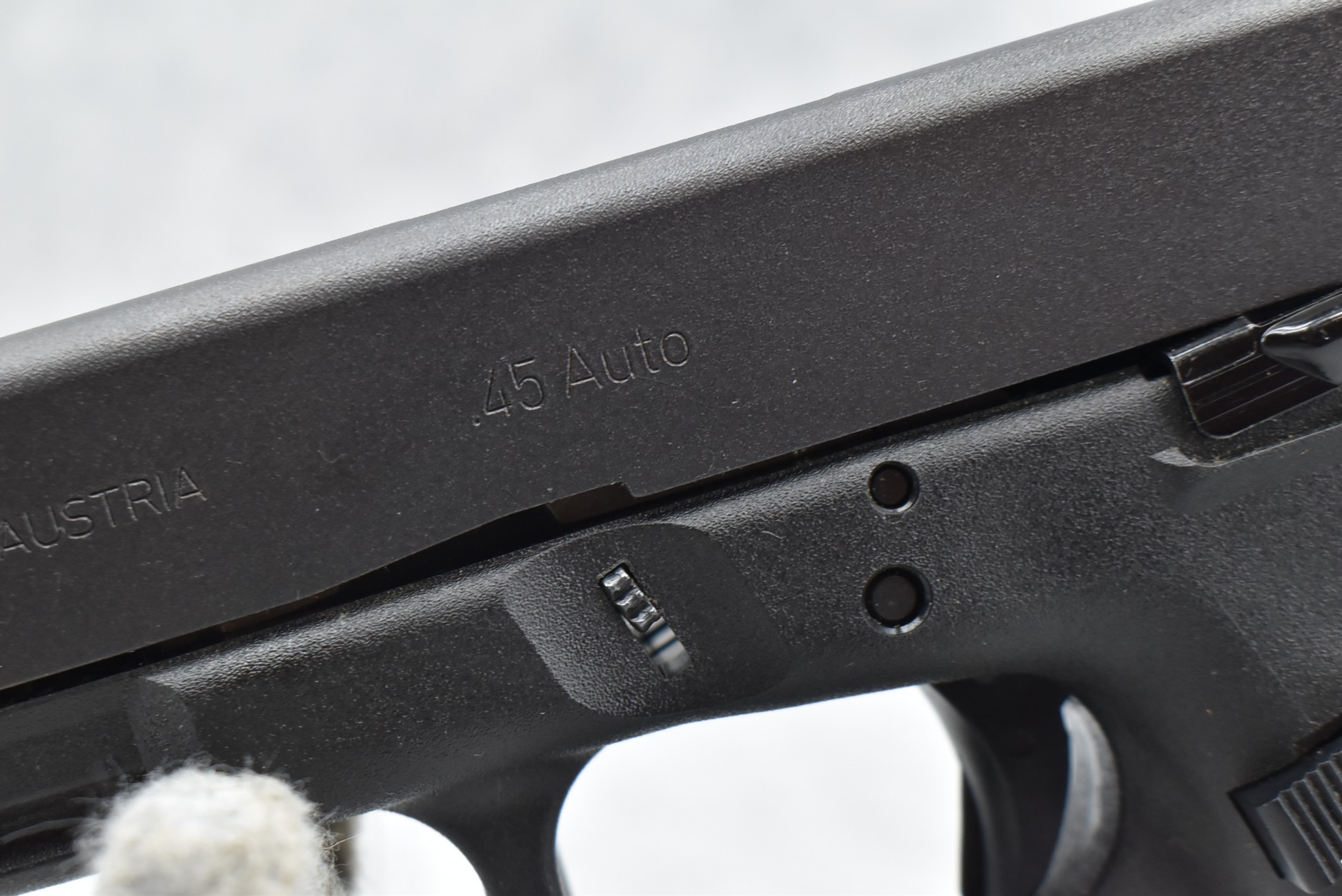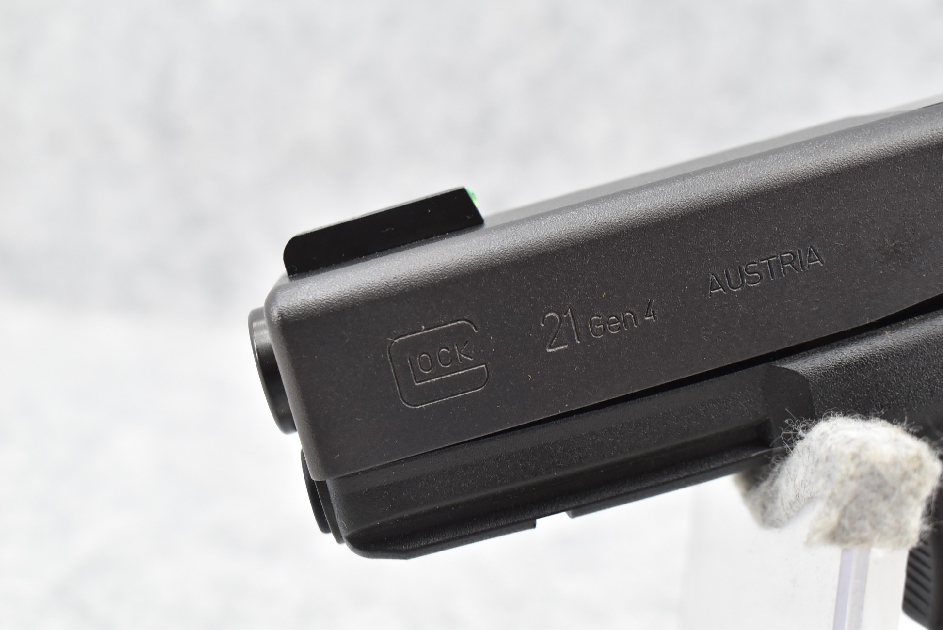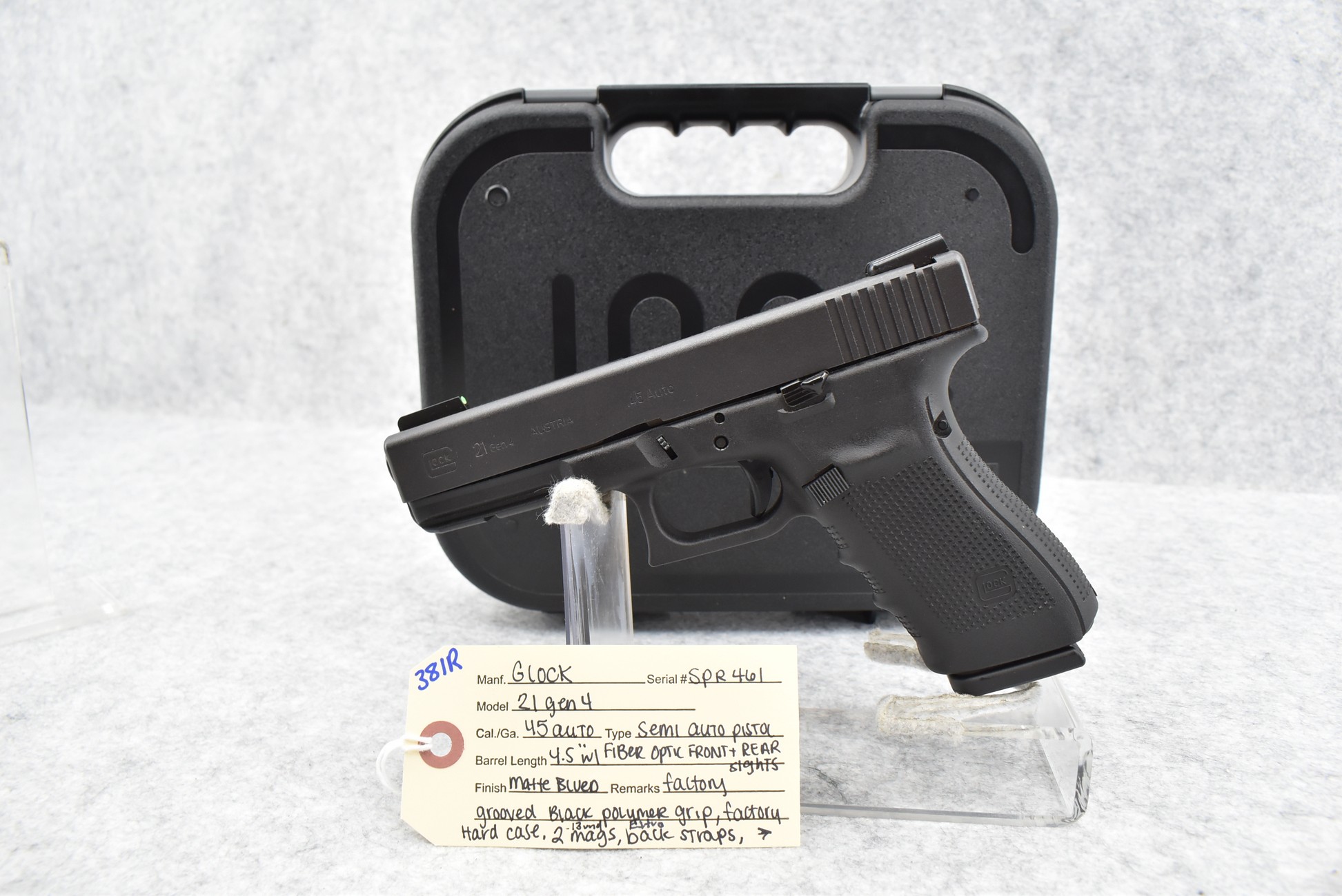 381R. Glock – Mod. 21 Gen. 4 – 45 Auto Cal. Semi-Auto Pistol – w/4.5” Barrel w/Fiber Optic Front & Rear Sights – Matte Blued Finish – w/Factory Grooved Black Polymer Grip – w/Factory Hard Case, Two 13Rd Mags, Extra Grip Straps & Manual