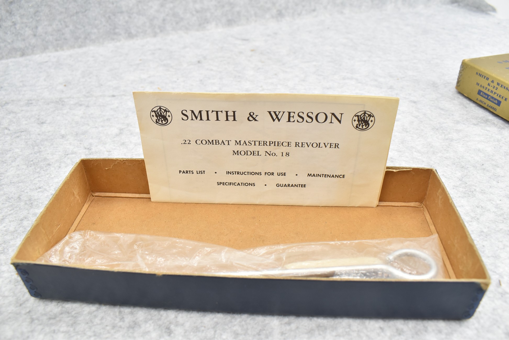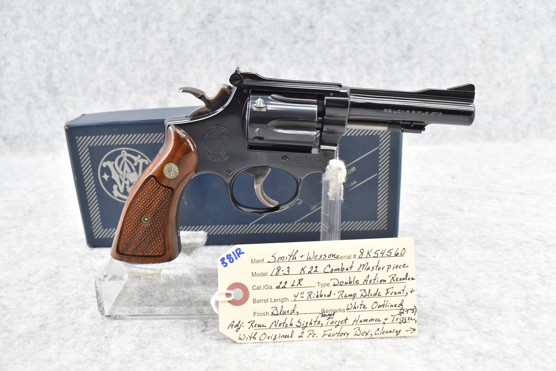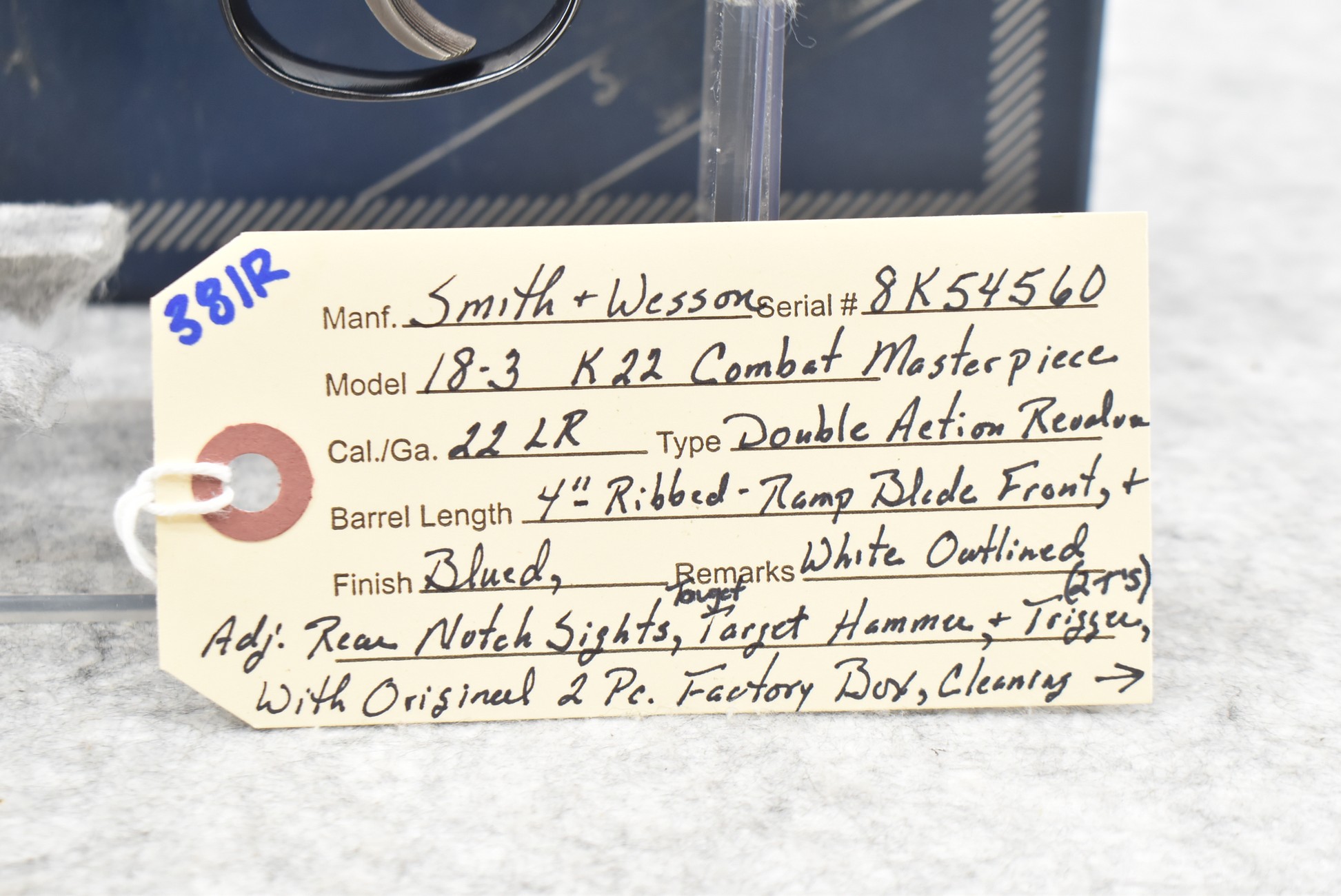 381R. Smith & Wesson – Mod. 18-3 K22 Combat Masterpiece – 22LR Cal. Double Action Revolver – w/4” Ribbed Barrel w/Ramp Blade Front & White Outlined Adj. Rear Notch Sights – Blued Finish – w/Target Hammer & Target Trigger – 2 T’s – w/Original 2pc. Factory Box, Cleaning Tools, Screwdriver & Pamphlets – Mfg. 1975