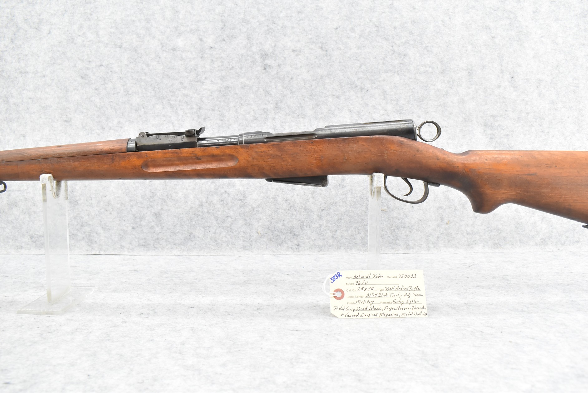 383R. Schmidt-Rubin – Mod. 96/11 – 7.5×55 Cal. Bolt Action Rifle – w/31” Barrel w/Blade Front & Adj. Rear Factory Sights w/Brass Muzzle Cap – Military Finish – w/Pistol Grip Full Wood Stocks w/Metal Butt Plate & Sling Loops – w/Original Magazine – No Visible Import Marks