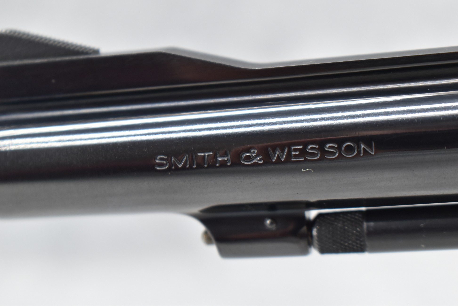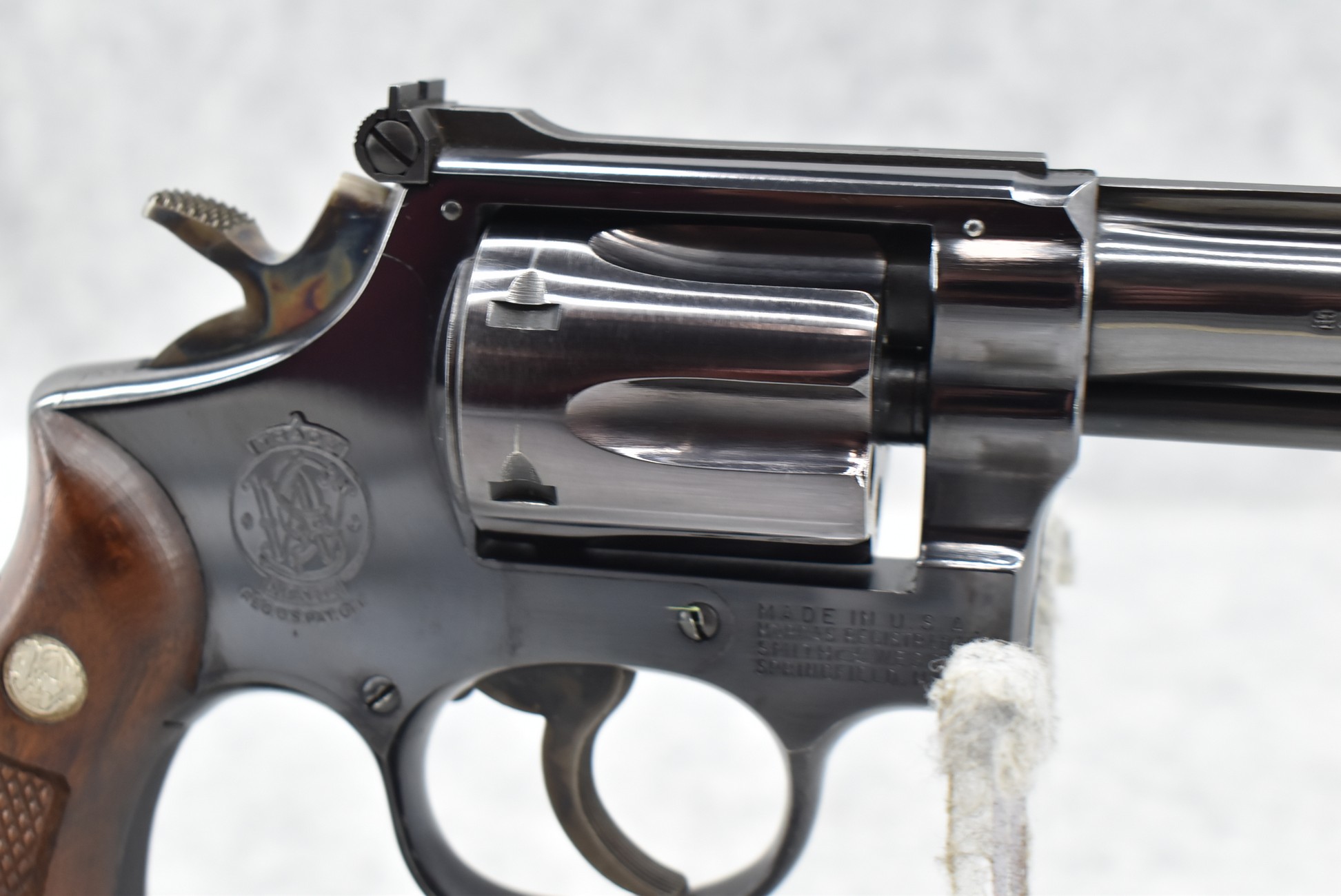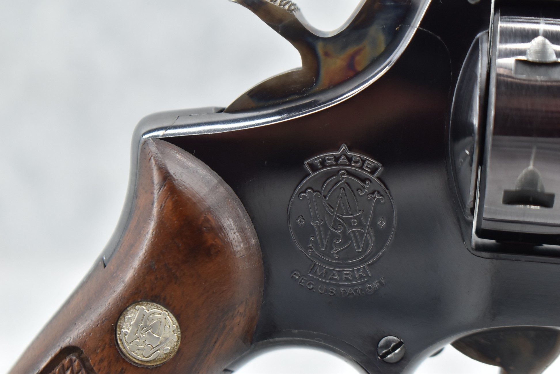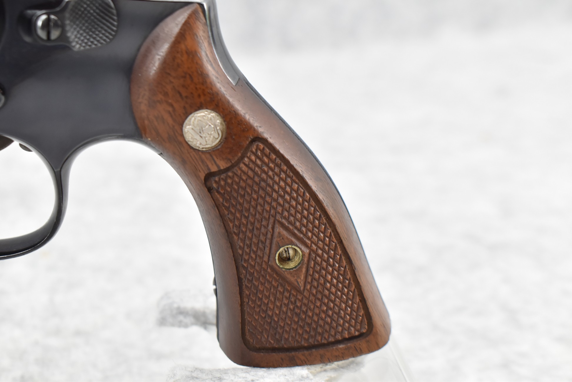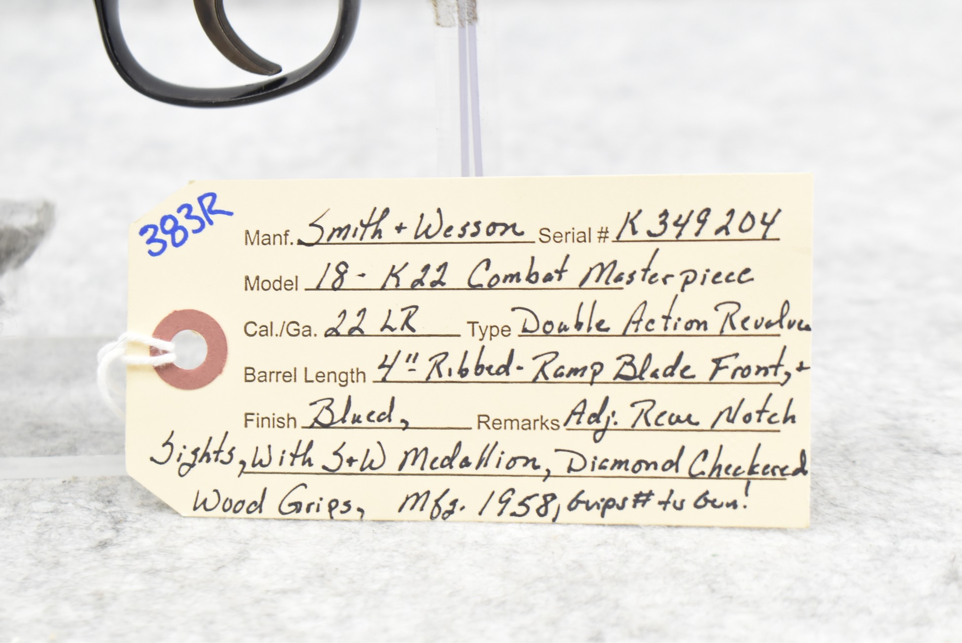 383R. Smith & Wesson – Mod. 18 K22 Combat Masterpiece – 22LR Cal. Double Action Revolver – w/4” Ribbed Barrel w/Ramp Blade Front & Adj. Rear Notch Sights w/S&W Medallion – Blued Finish – w/Diamond Checkered Wood Grips That Number to the Gun! – Mfg. 1958