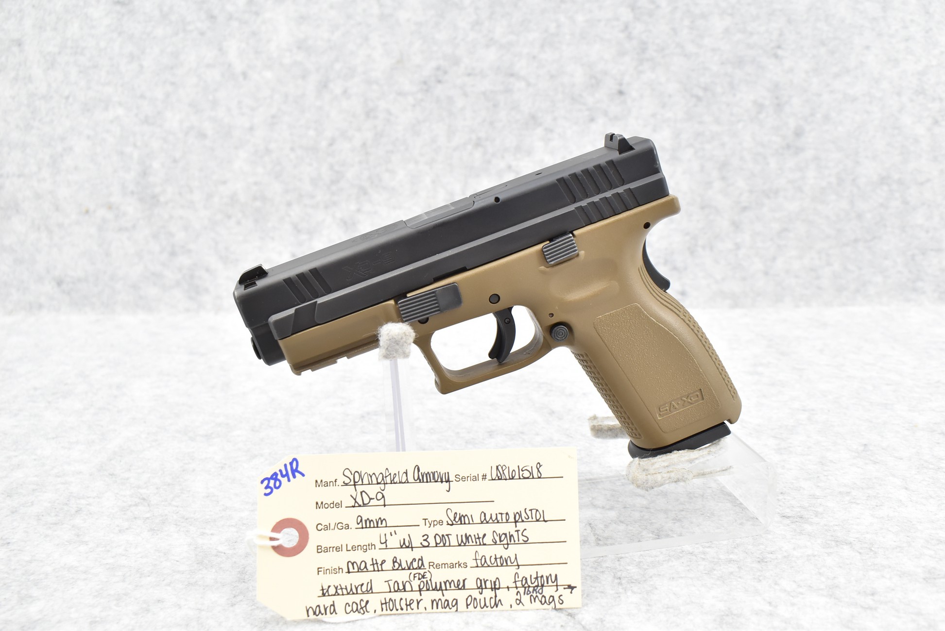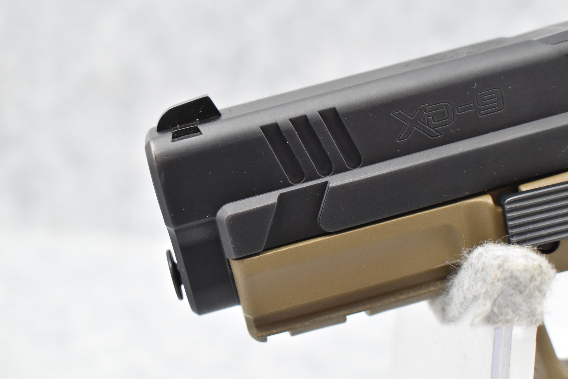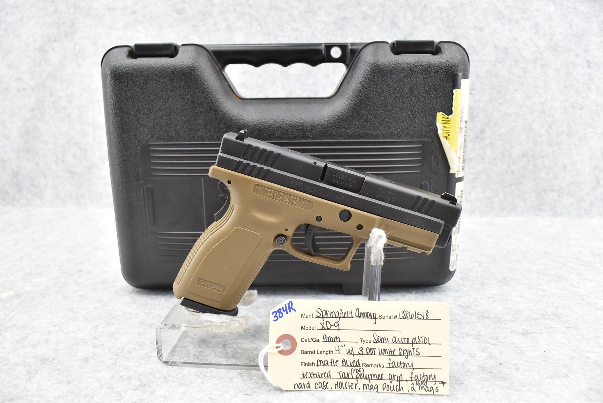384R. Springfield Armory – Mod. XD-9 – 9mm Cal. Semi-Auto Pistol – w/4” Barrel w/3-Dot White Sights – Matte Blued Finish – w/Factory FDE Polymer Grip – w/Factory Hard Case, Holster, Mag Pouch, Two 16Rd Mags, Mag Loader & Manual