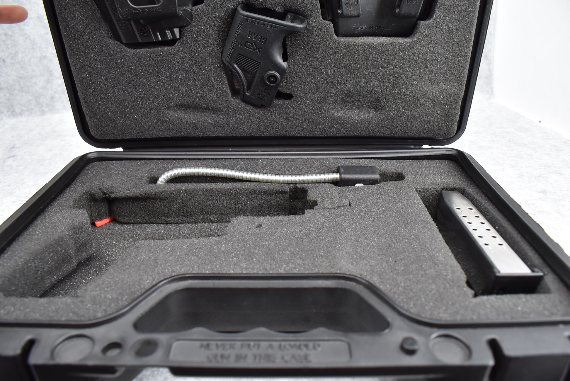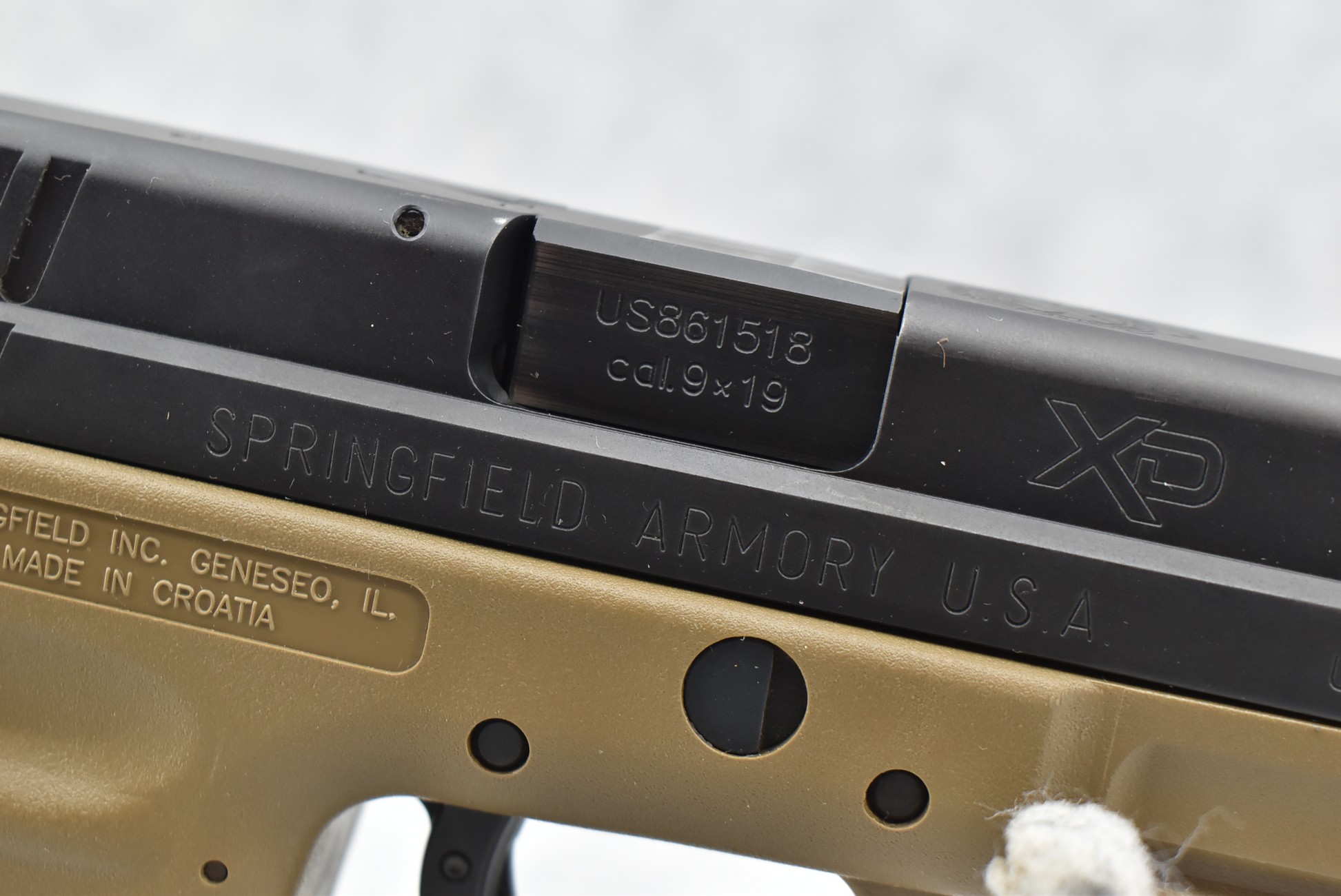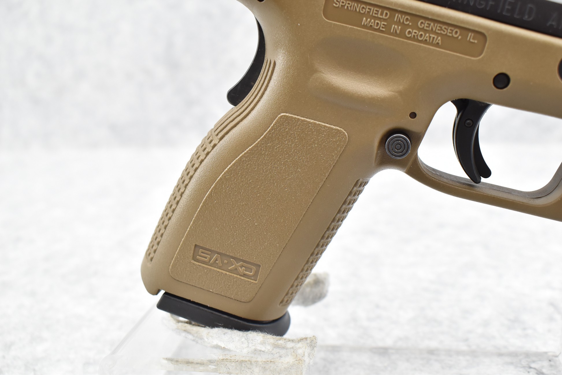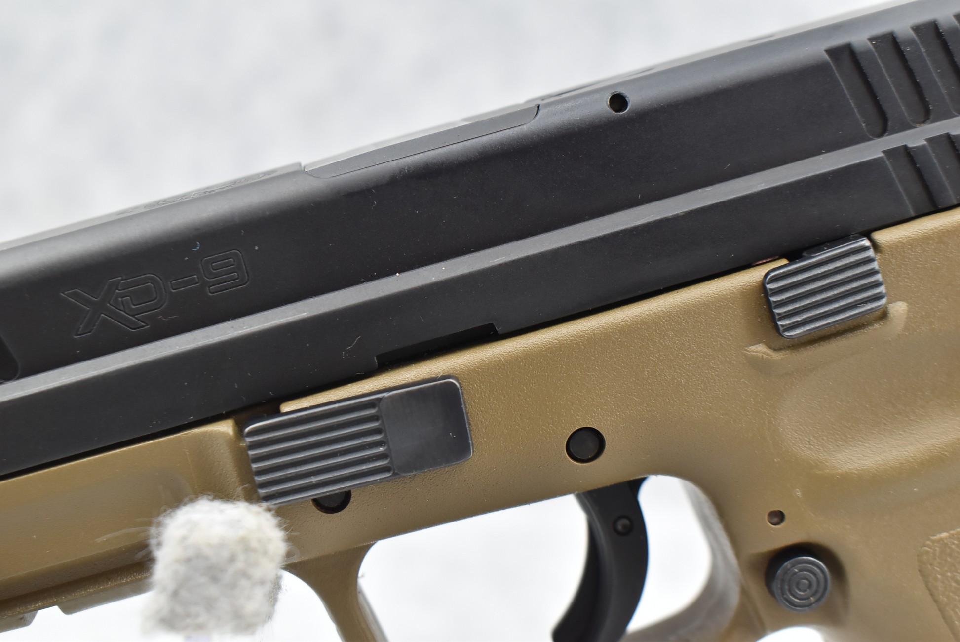 384R. Springfield Armory – Mod. XD-9 – 9mm Cal. Semi-Auto Pistol – w/4” Barrel w/3-Dot White Sights – Matte Blued Finish – w/Factory FDE Polymer Grip – w/Factory Hard Case, Holster, Mag Pouch, Two 16Rd Mags, Mag Loader & Manual