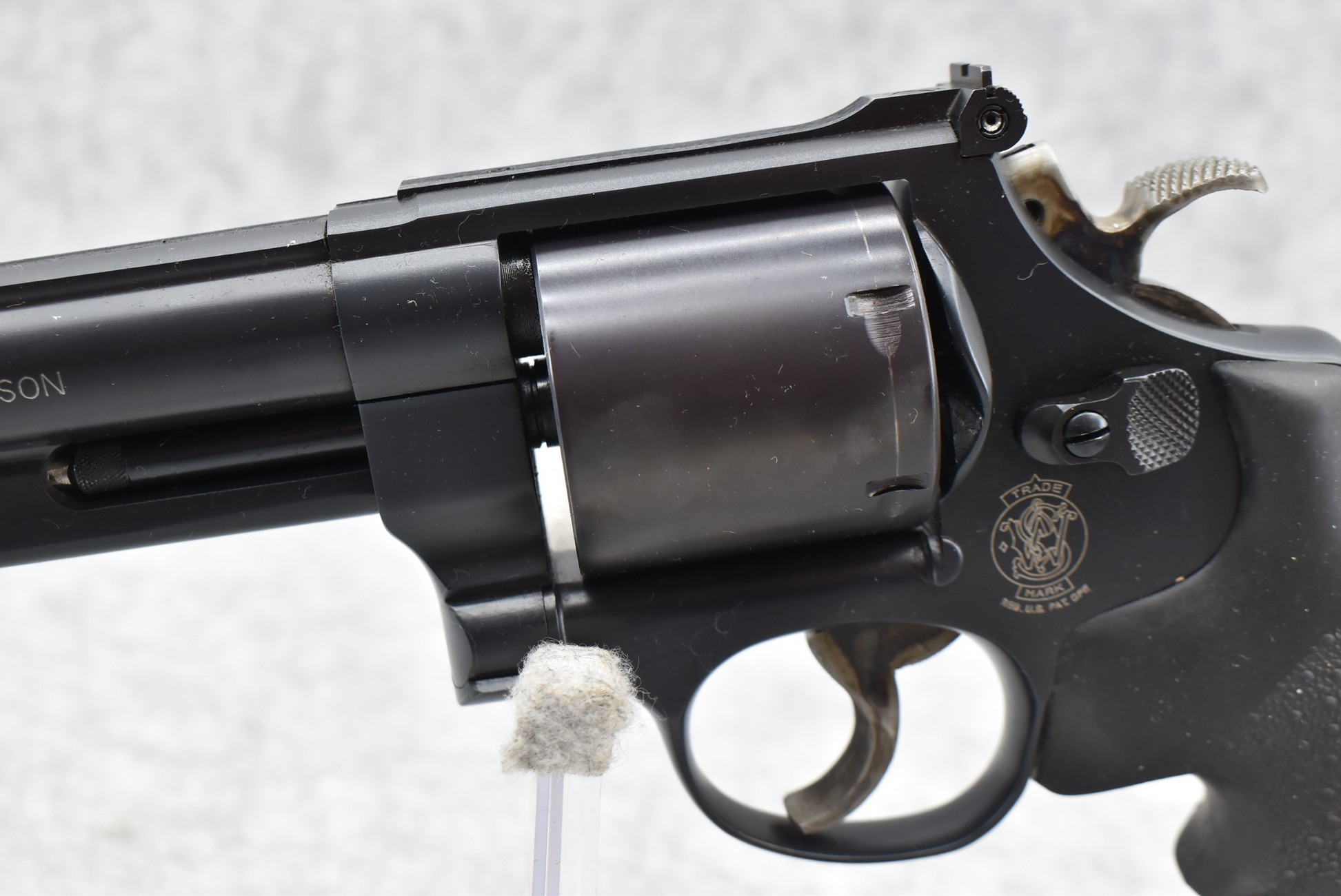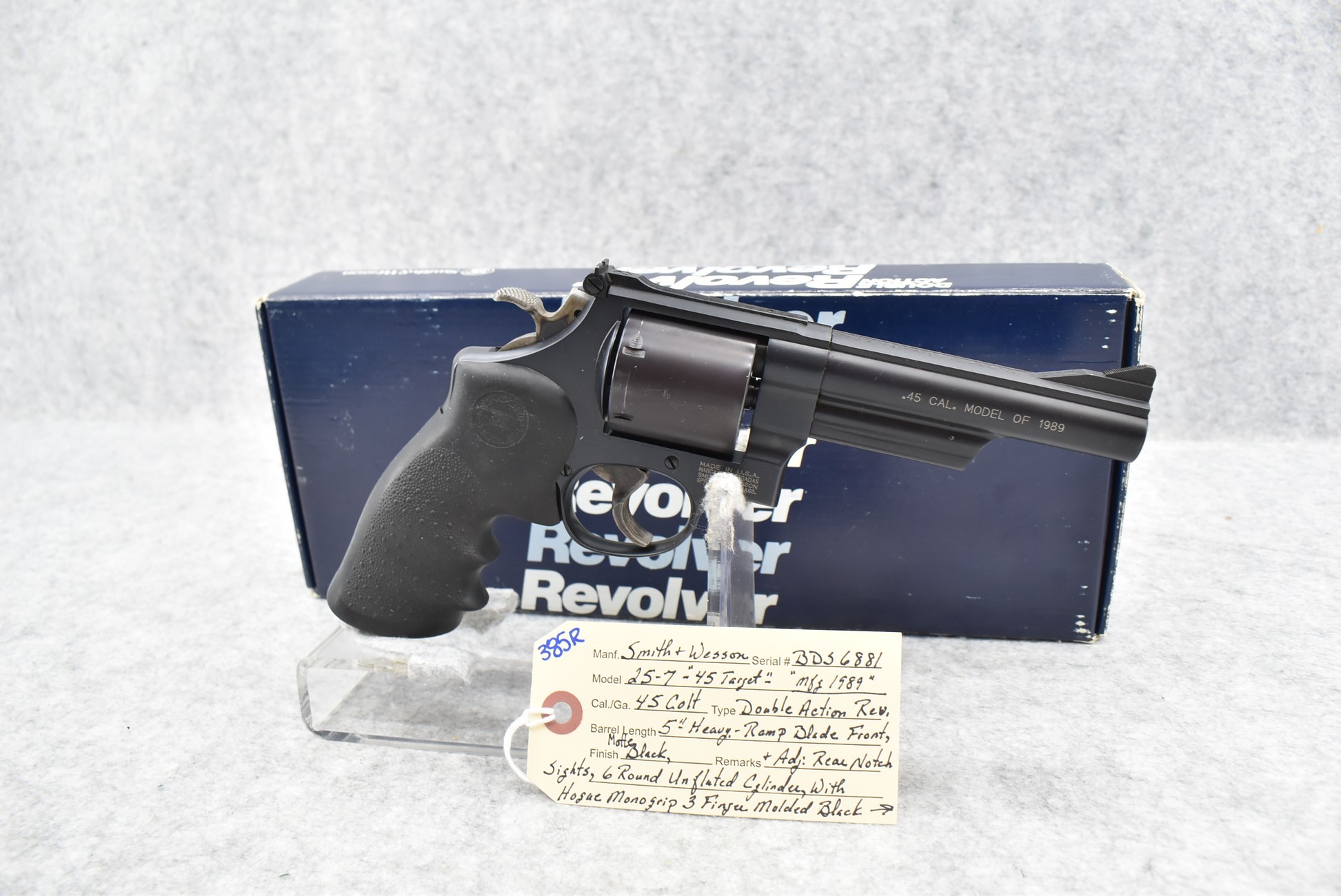 385R. Smith & Wesson – Mod. 25-7 “45 Target” – 45 Colt Cal. Double Action Revolver – w/5” Heavy Barrel w/Ramp Blade Front & Adj. Rear Notch Sights – Matte Black Finish – w/6Rd Unfluted Cylinder – w/Hogue Monogrip 3-Finger Molded Black Rubber Grips – w/S&W Factory Box, Pamphlets & Cleaning Tools – Mfg. 1989 w/Limited Quantities Mfg. This Model Was a Dealer Exclusive Mfg. Only. Could be as Little as 2,000 Mfg