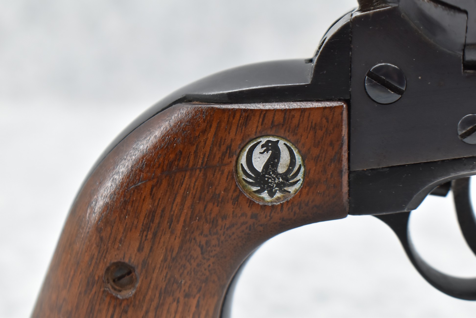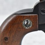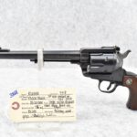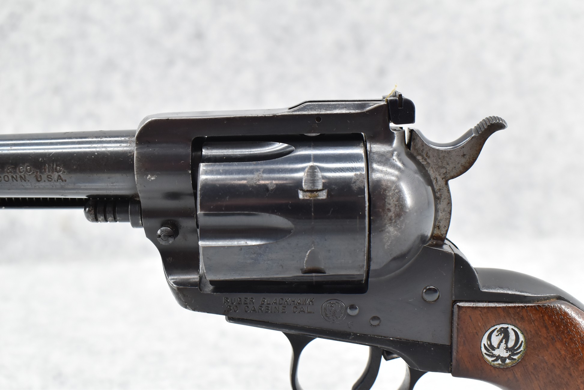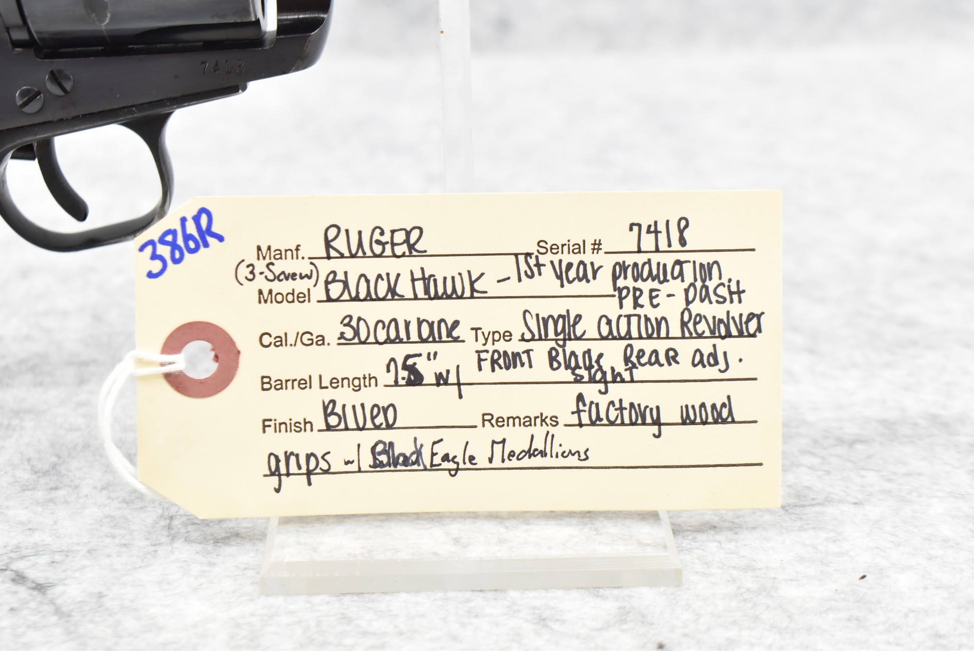386R. Ruger – Mod. Black Hawk (3-Screw) – 30 Carbine Cal. Single Action Revolver – w/7.5” Barrel w/Front Blade & Rear Adj. Sights – Blued Finish – w/Factory Wood Grips w/Black Eagle Medallions – 1st Year Production, Note Pre-Dash Serial #7418
