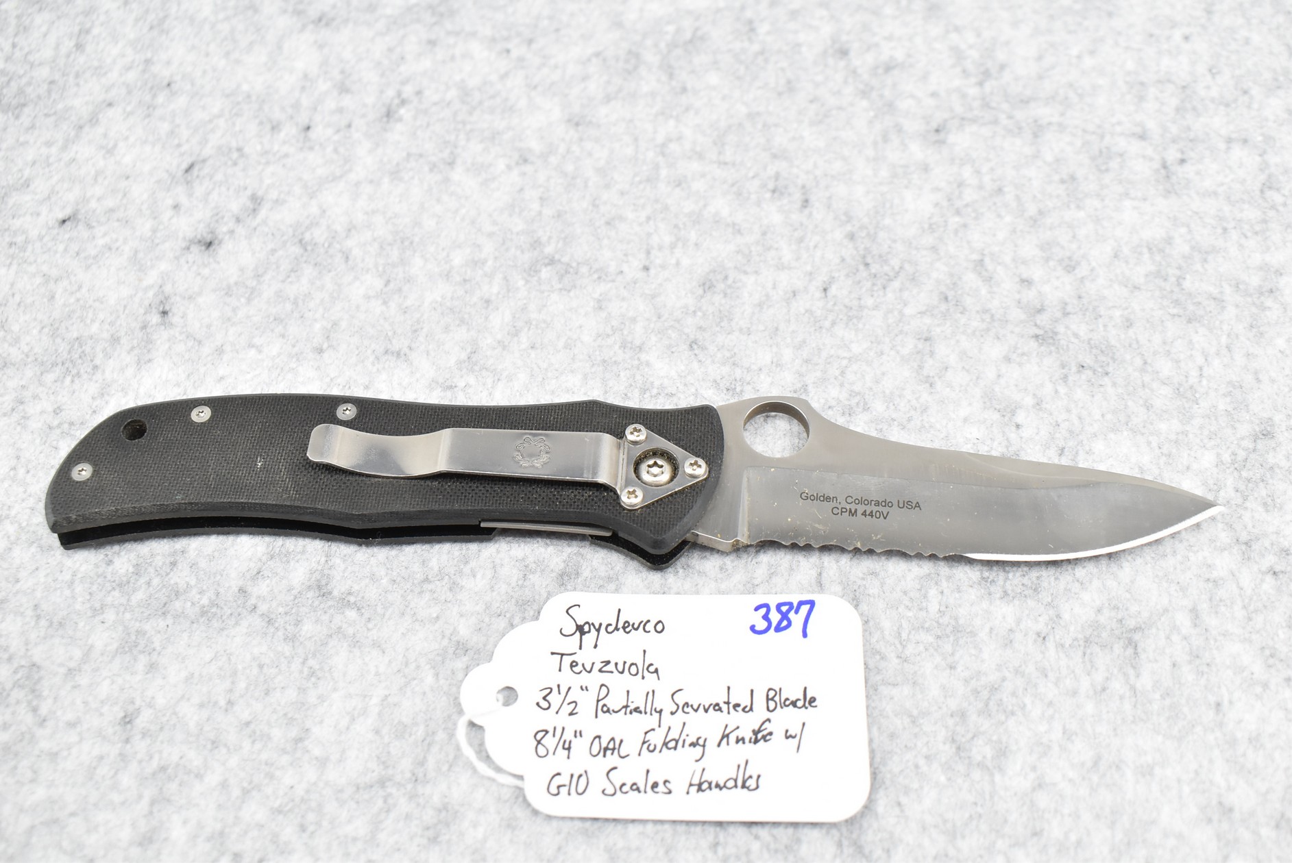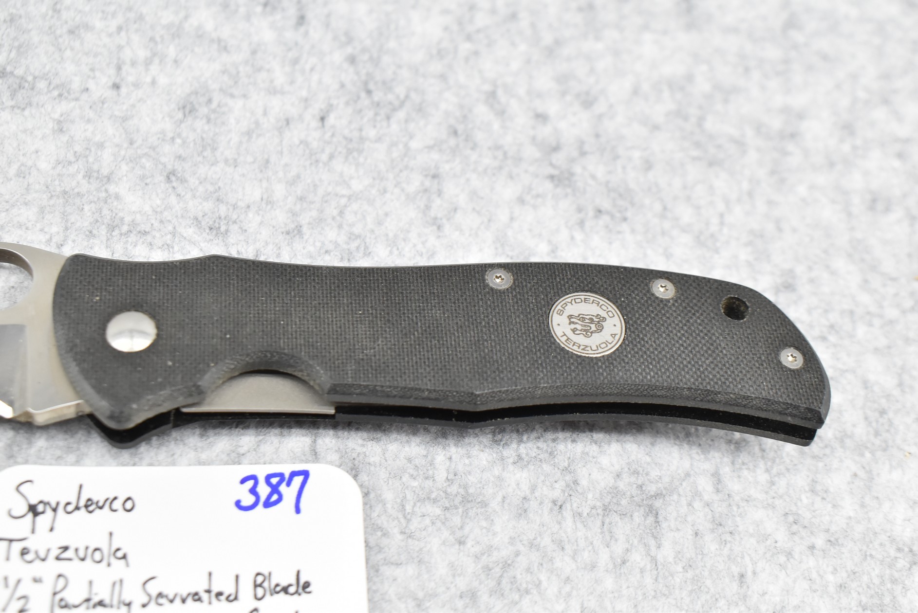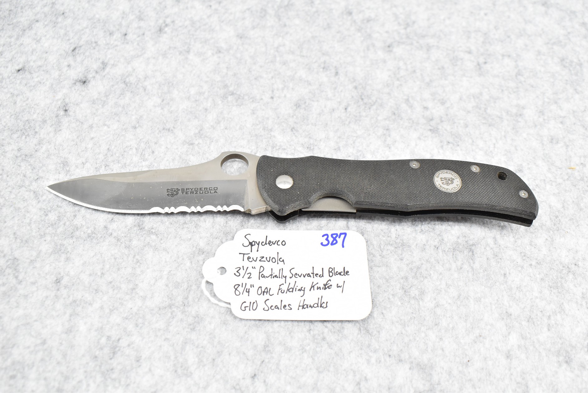 387. Spyderco – Terzuola Folding Knife – w/3 ½” Partially Serrated Blade – 8 ¼” Overall Length – w/G10 Scales Handles