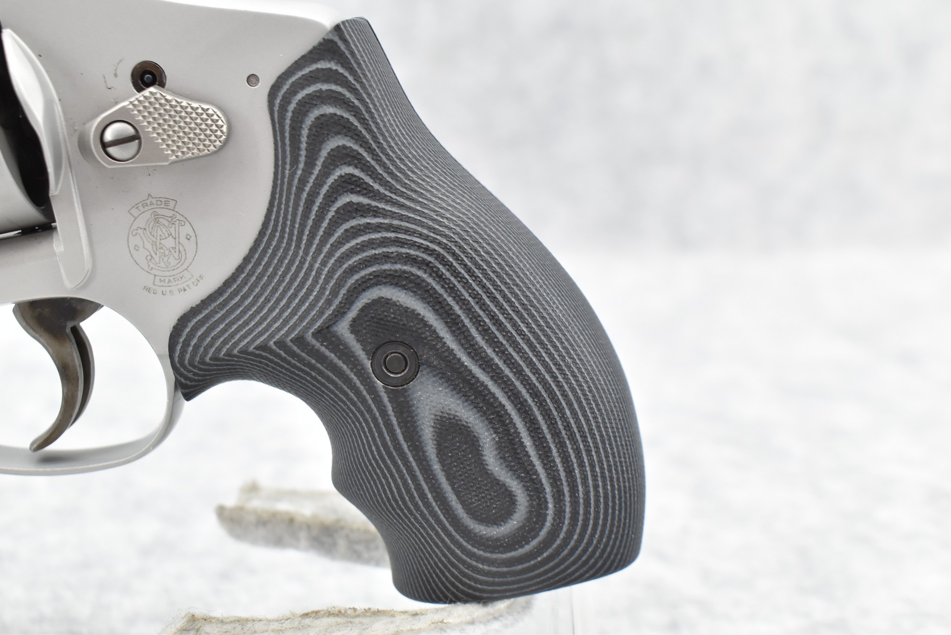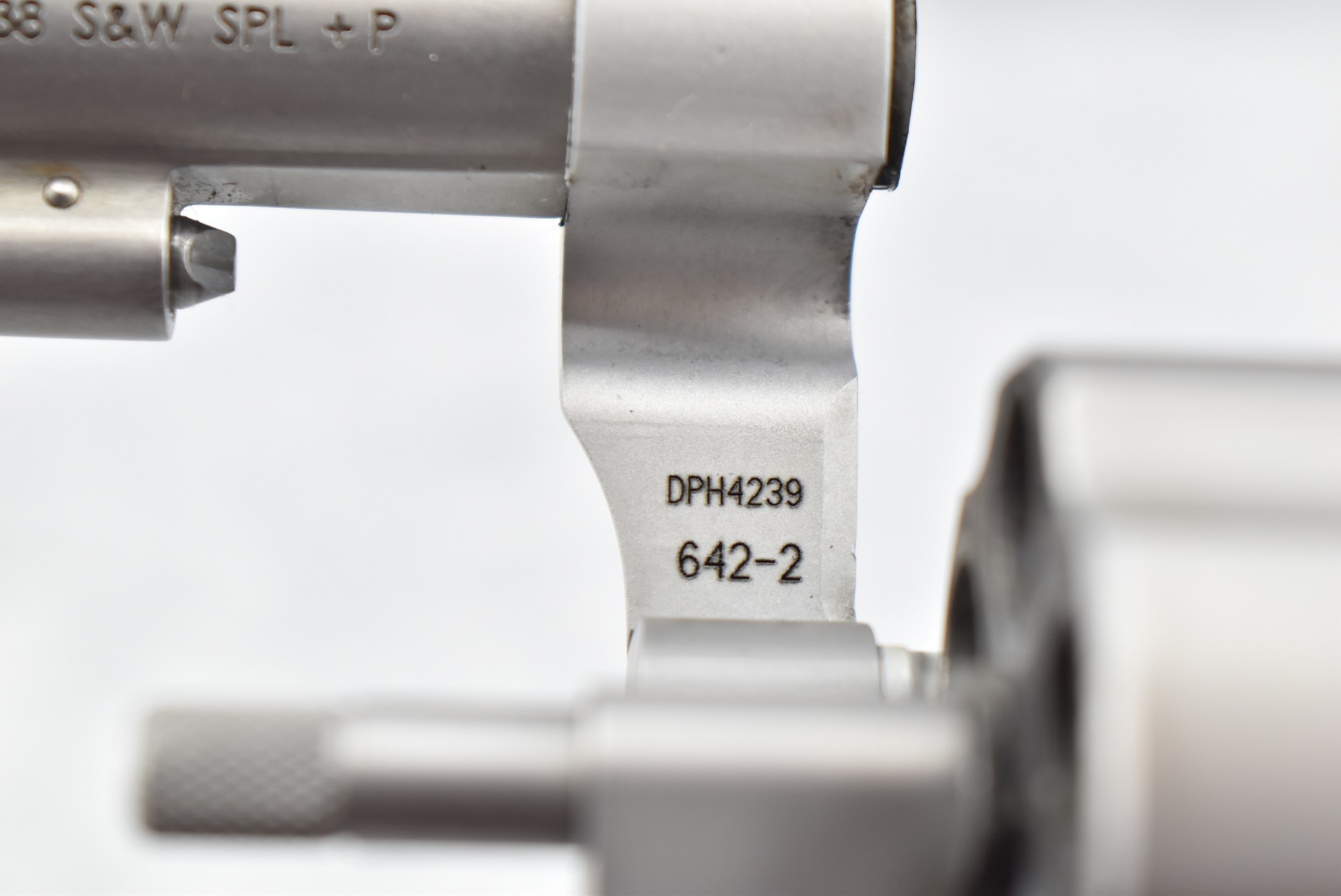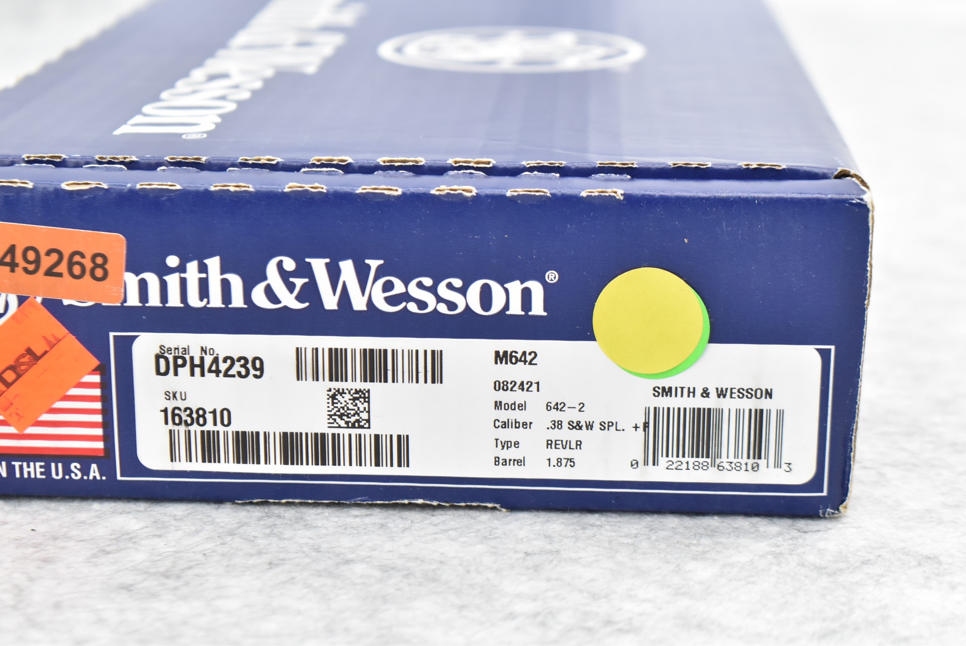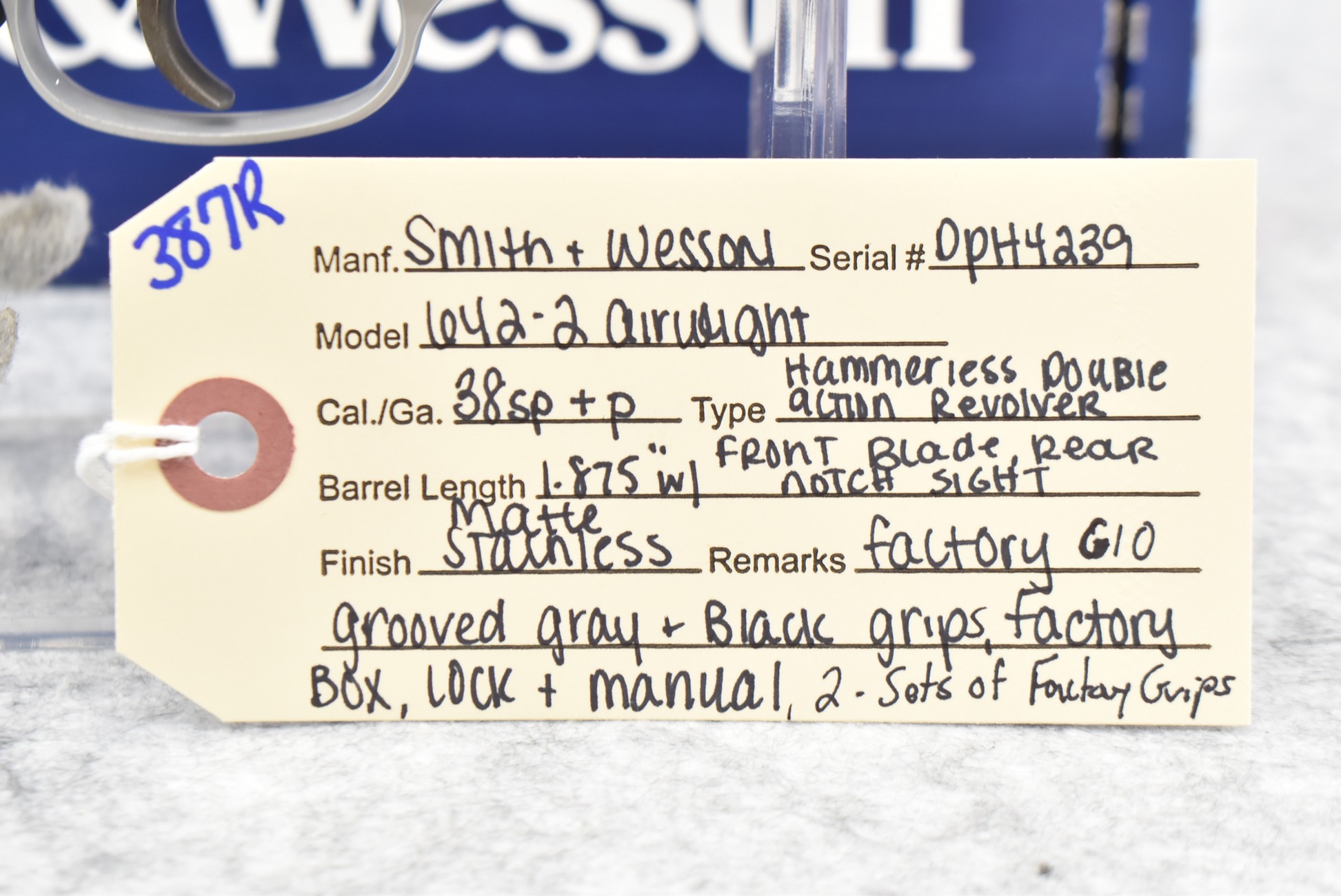 387R. Smith & Wesson – Mod. 642-2 Airweight – 38 Spl +P Hammerless Double Action Revolver – w/1.875” Barrel w/Front Blade & Rear Notch Sights – Matte Stainless Finish – w/Factory G10 Grooved Gray & Black Grips – w/Factory Box, Manual & 2 Extra Sets of Factory Grips