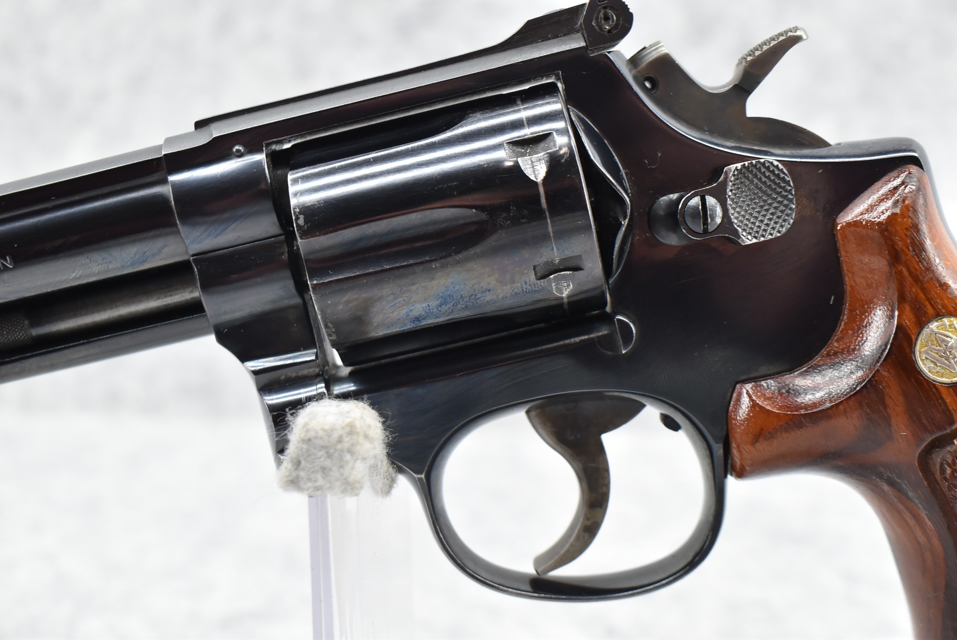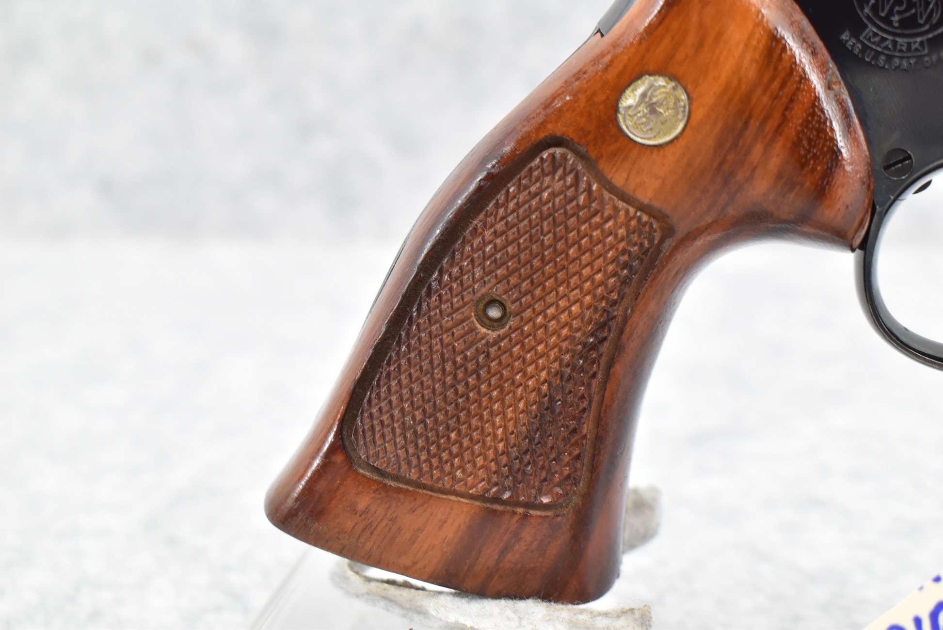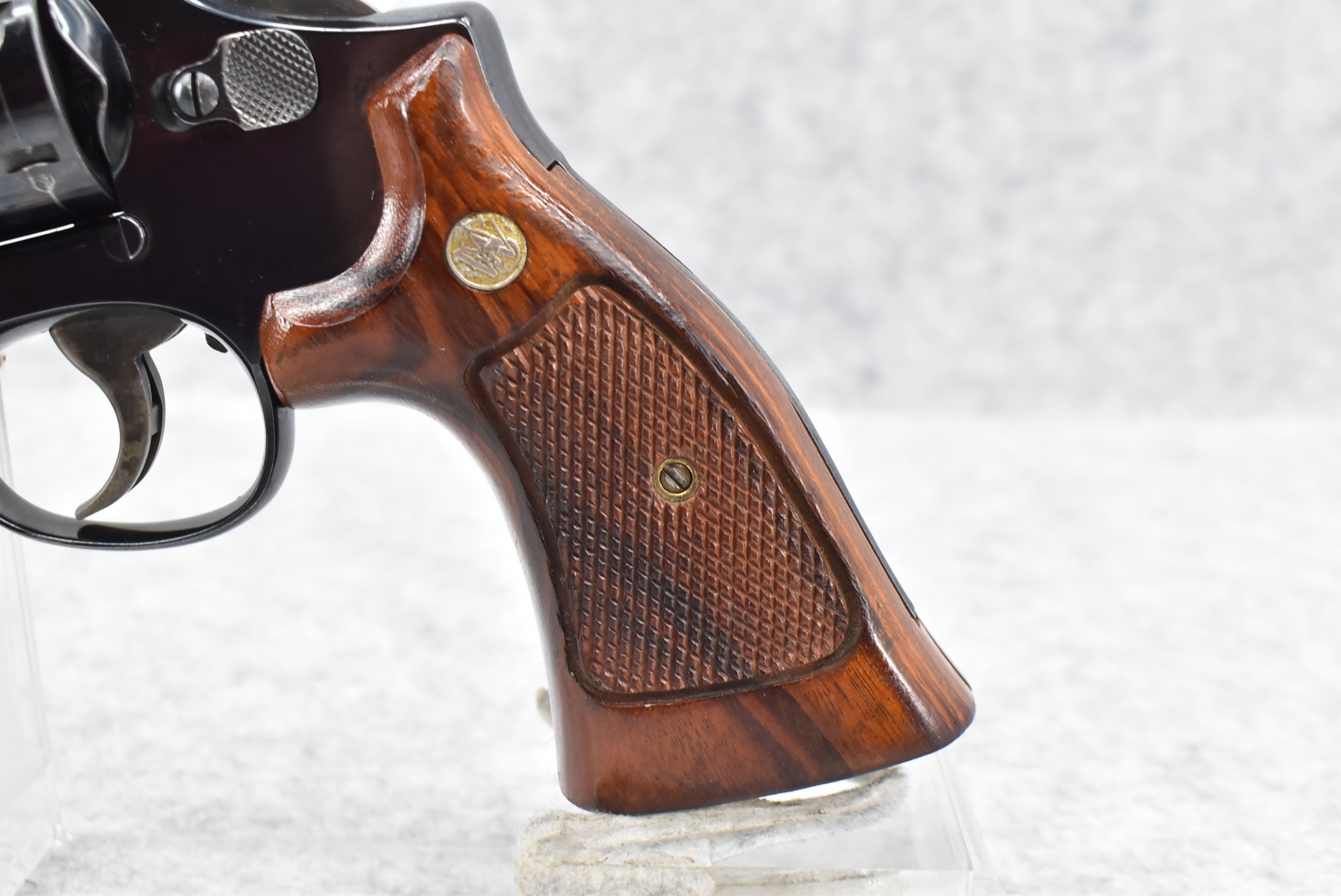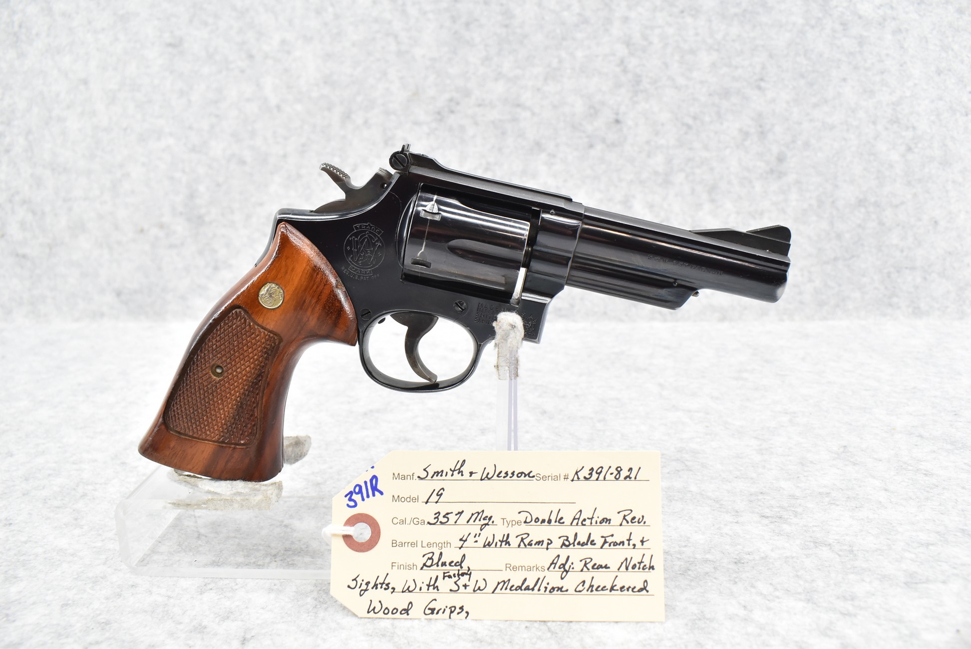 391R. Smith & Wesson – Mod. 19 – 357 Mag. Cal. Double Action Revolver – w/4” Barrel w/Ramp Blade Front & Adj. Rear Notch Sights – Blued Finish – w/Factory S&W Medallion Checkered Target Wood Grips