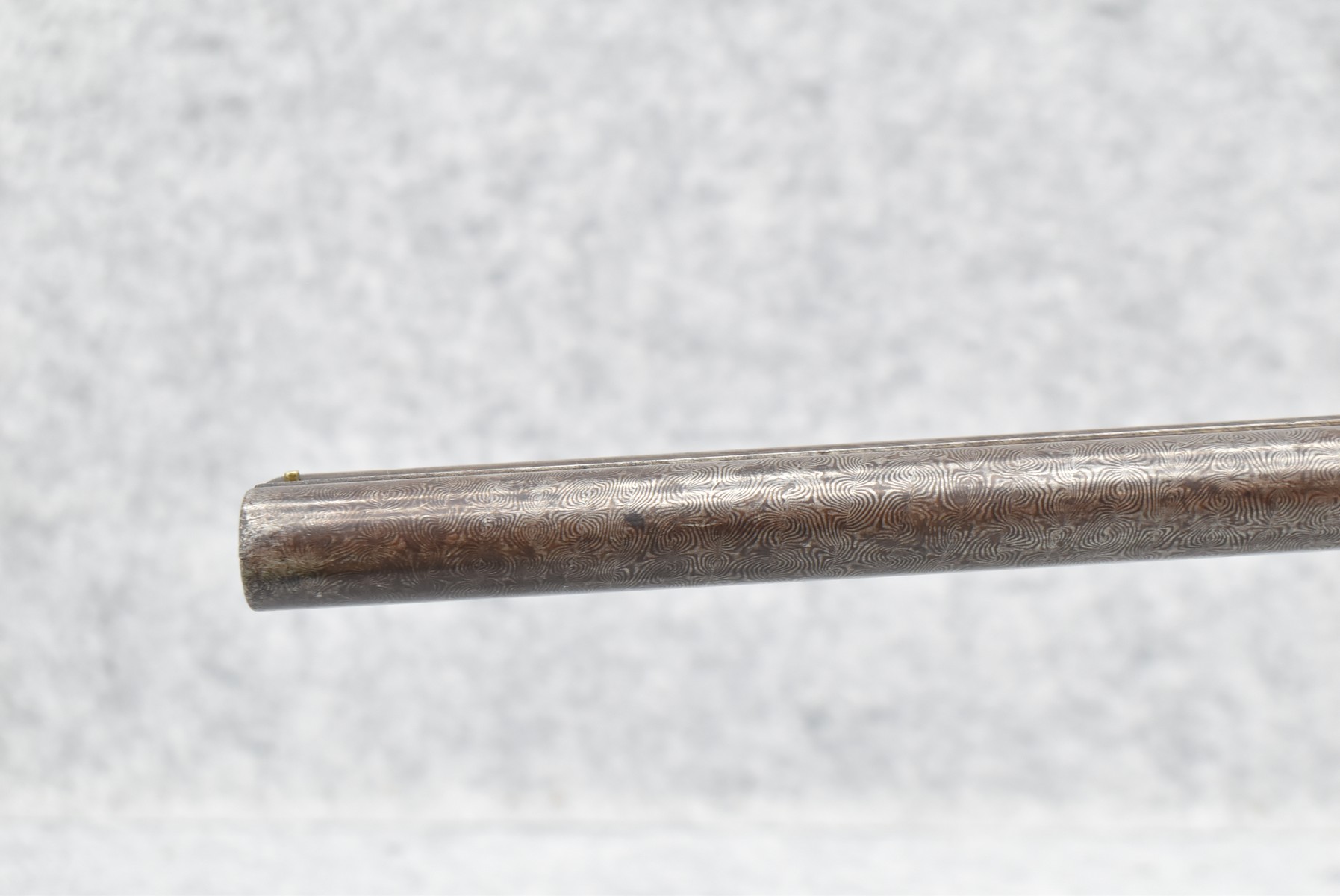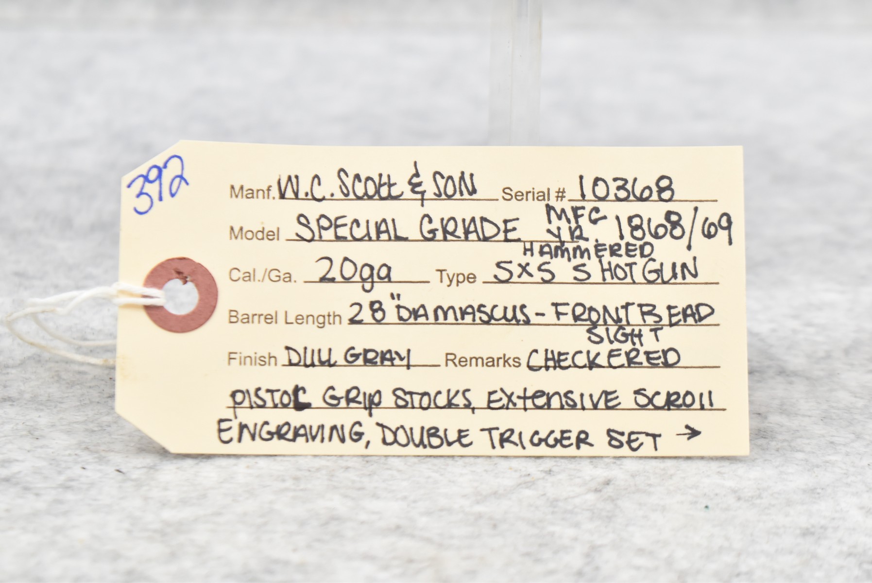 392. W.C. Scott & Son – Mod. Special Grade – 20ga. Hammered Double Barrel Shotgun – w/28” Damascus Barrels w/Front Bead Sight – Dull Grayed Finish – w/Extensive Scroll Engraving – w/Checked Pistol Grip Stock w/Metal Butt Plate w/Silver Oval on Stock – w/Double Trigger Set – All Matching Numbers – Mfg. 1868-1869