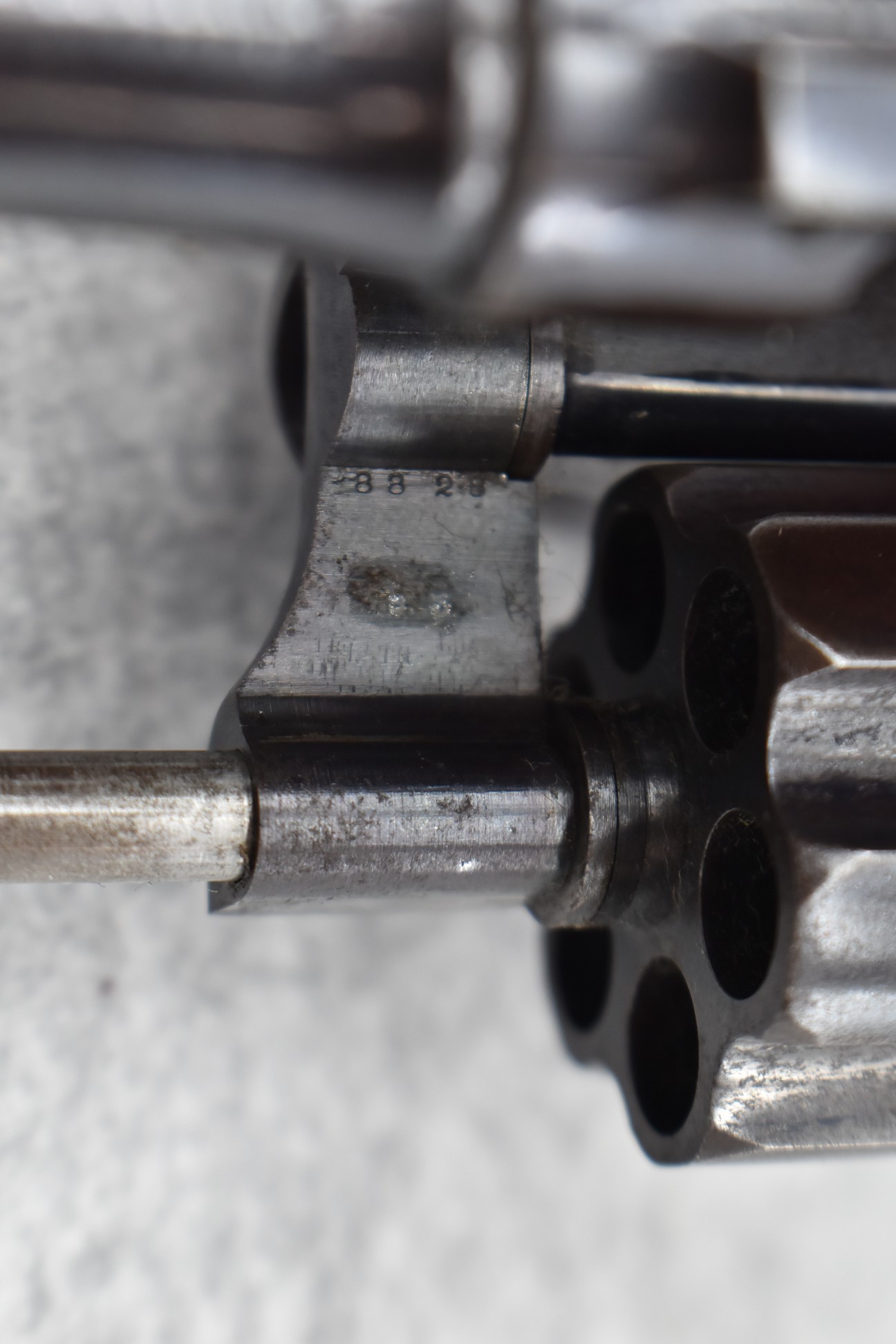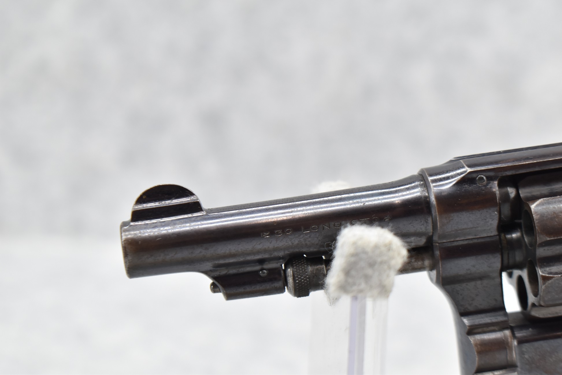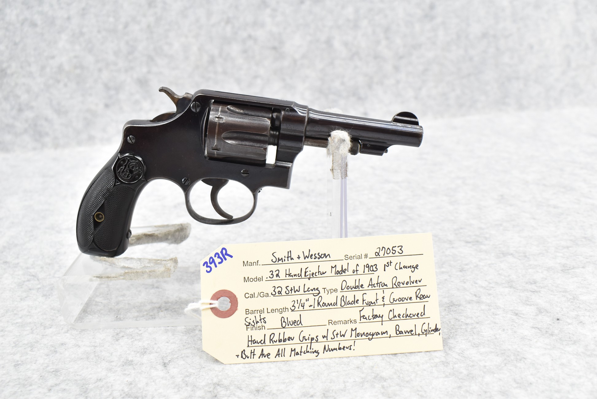 393R. Smith & Wesson – Mod. .32 Hand Ejector Model of 1903 1st Change – 32 S&W Long Cal. Double Action Revolver – w/3 ¼” Barrel w/Round Blade Front & Groove Rear Sights – Blued Finish – w/Factory Checkered Hard Rubber Grips w/S&W Monogram – Barrel, Cylinder & Butt Are All Matching Numbers!