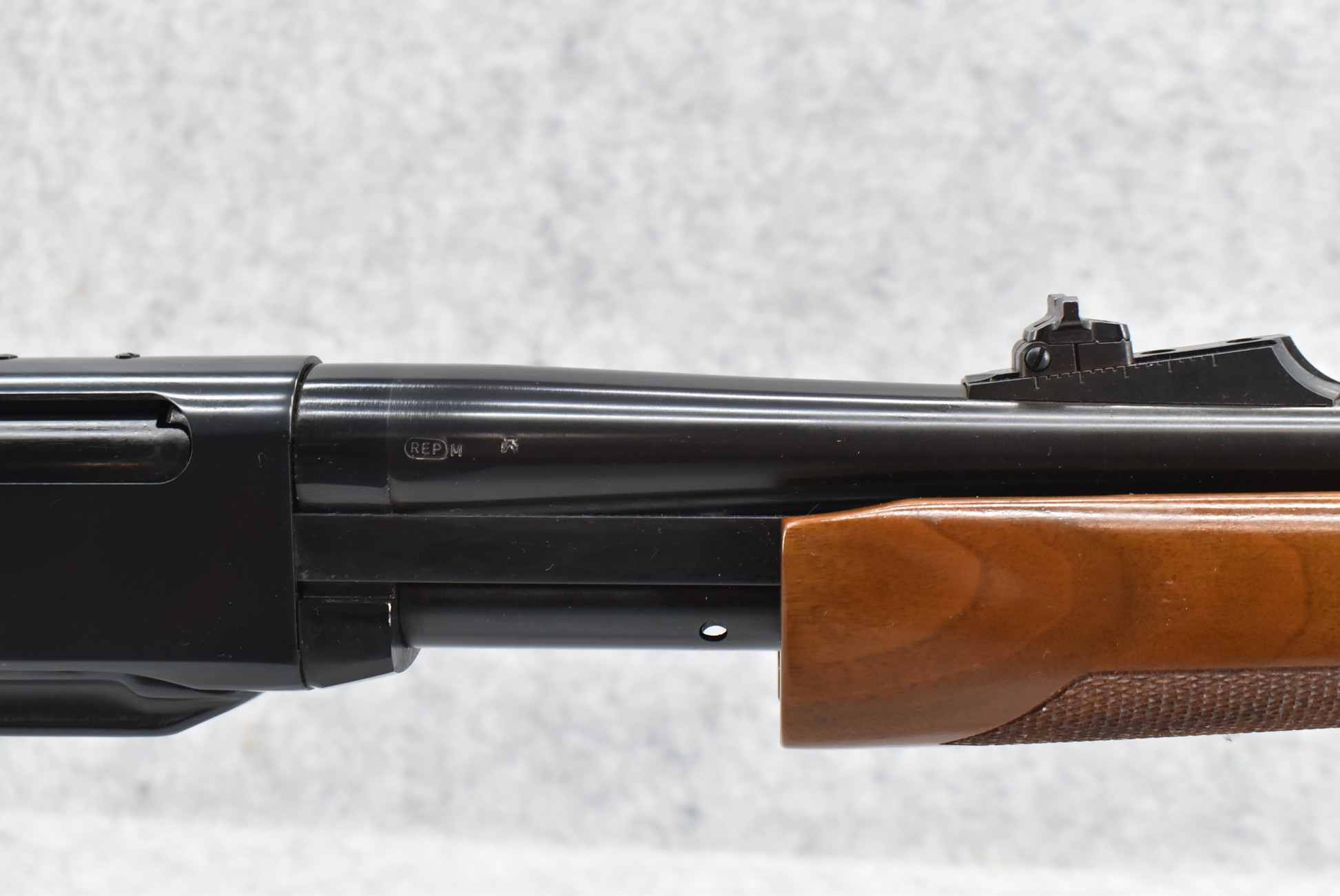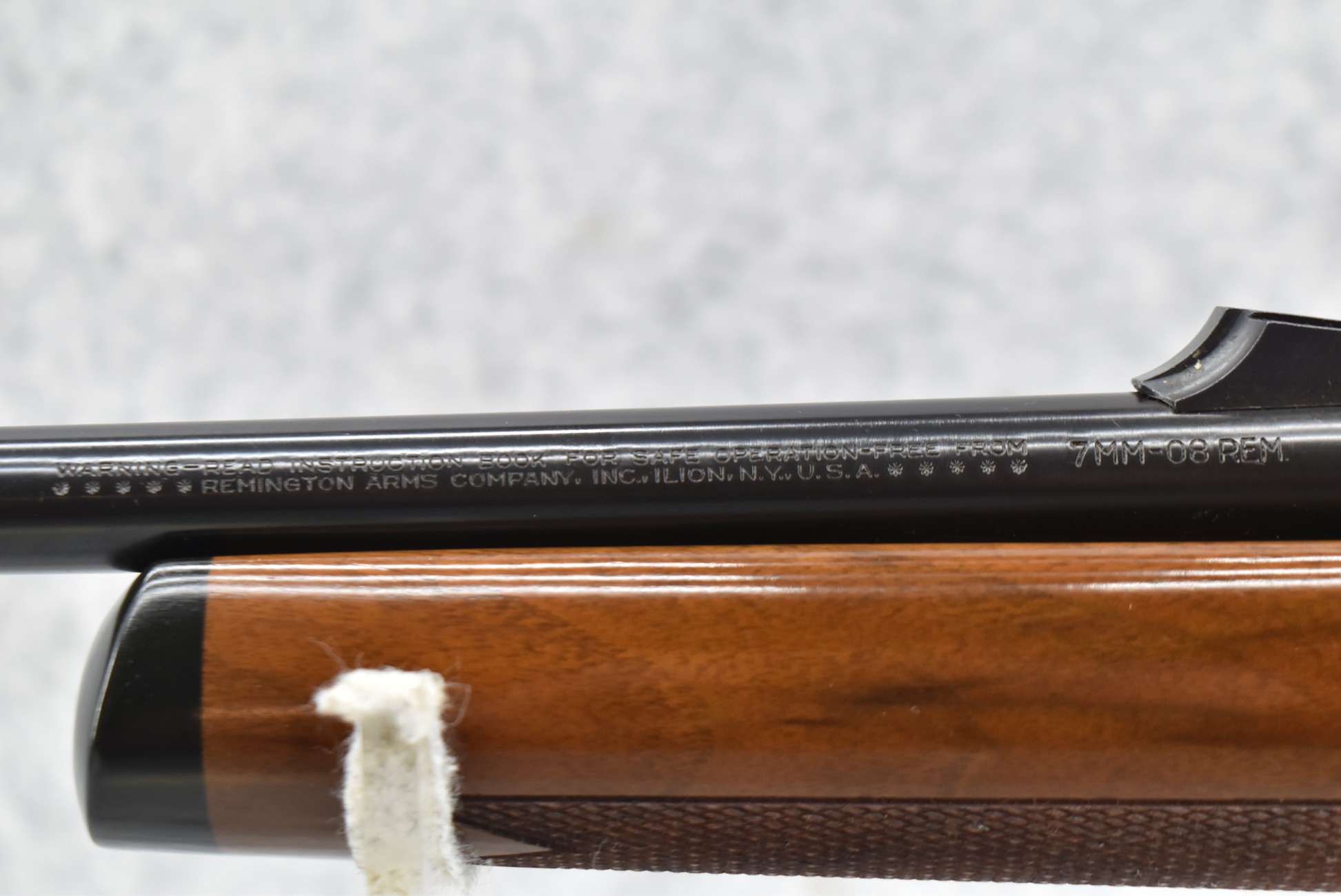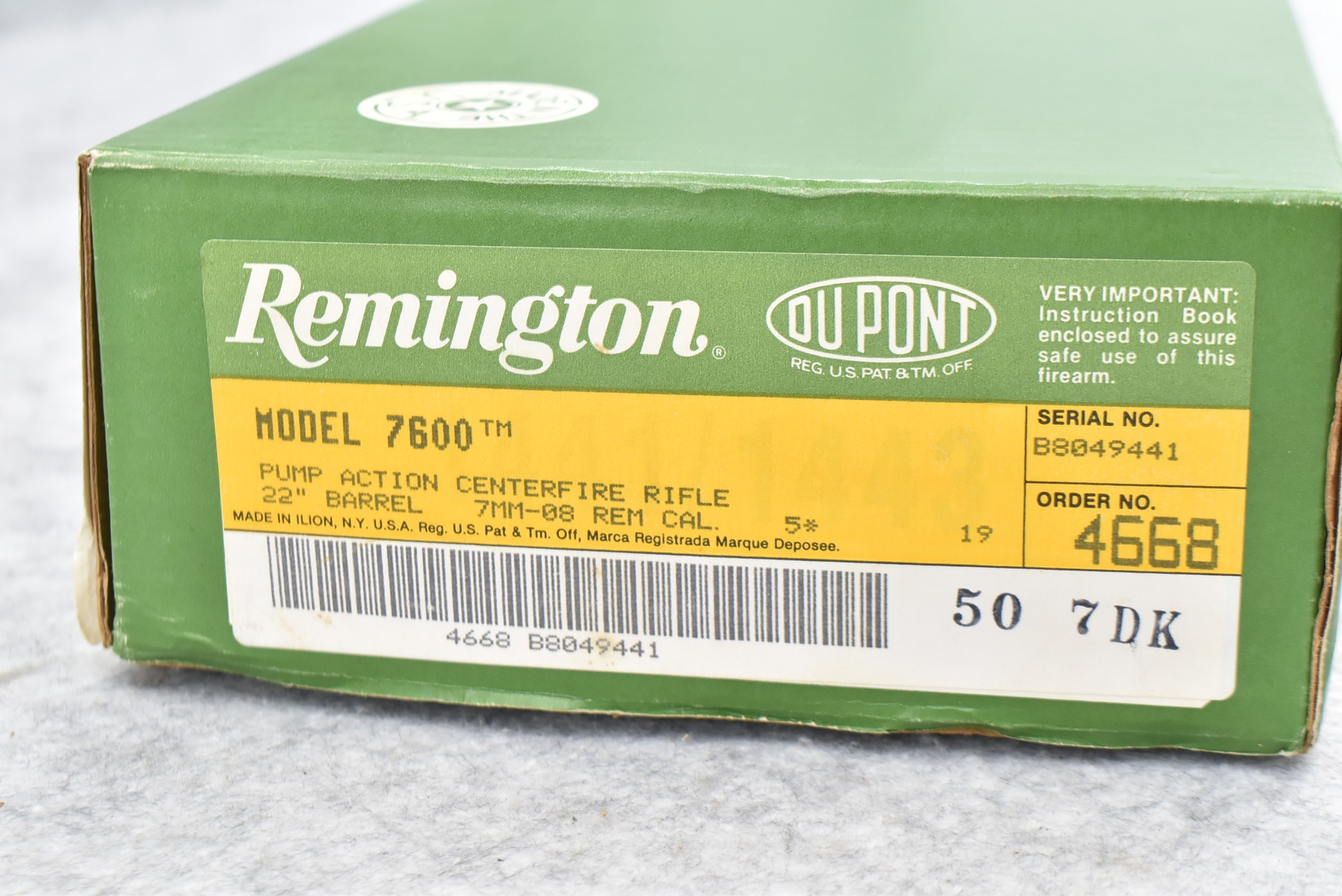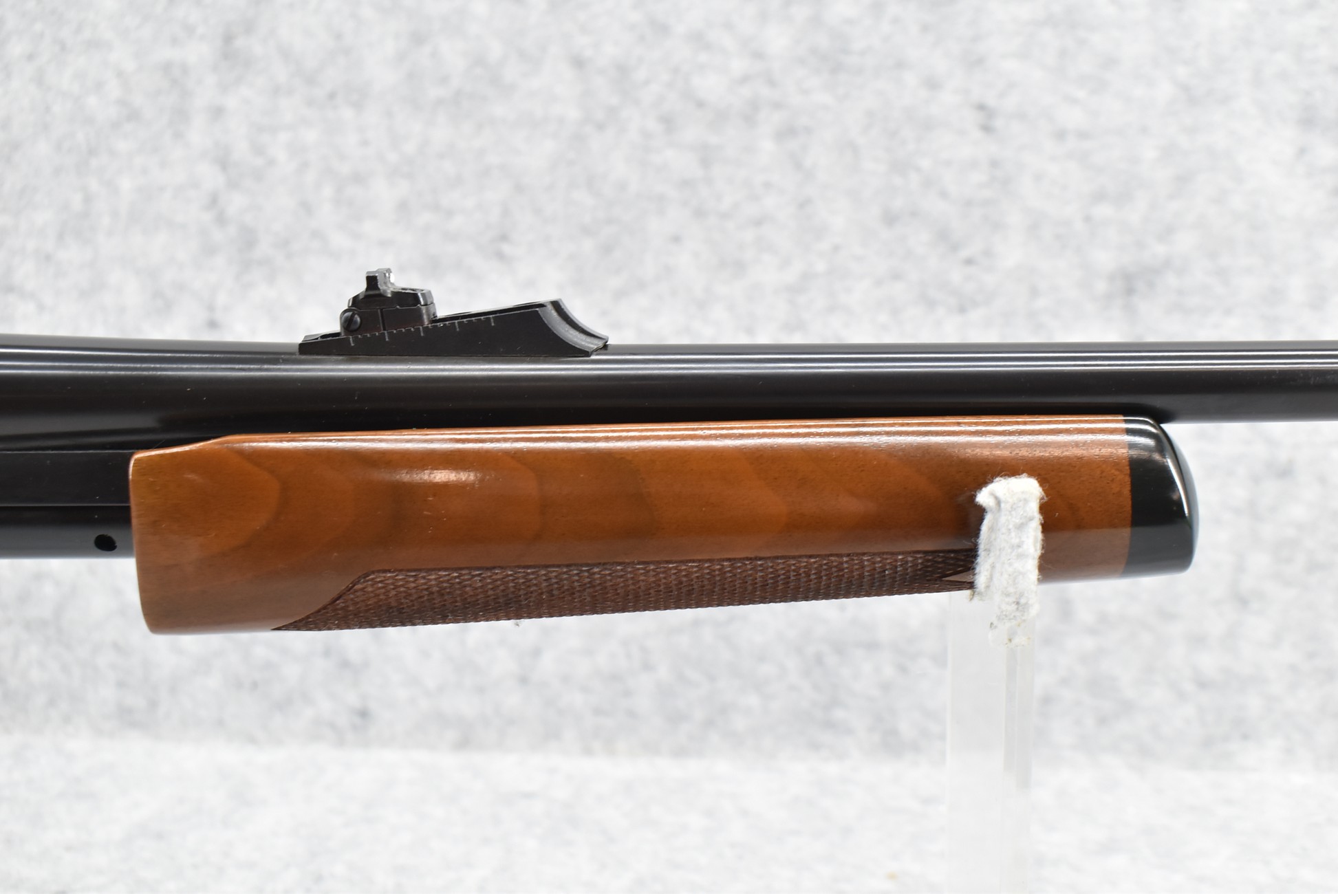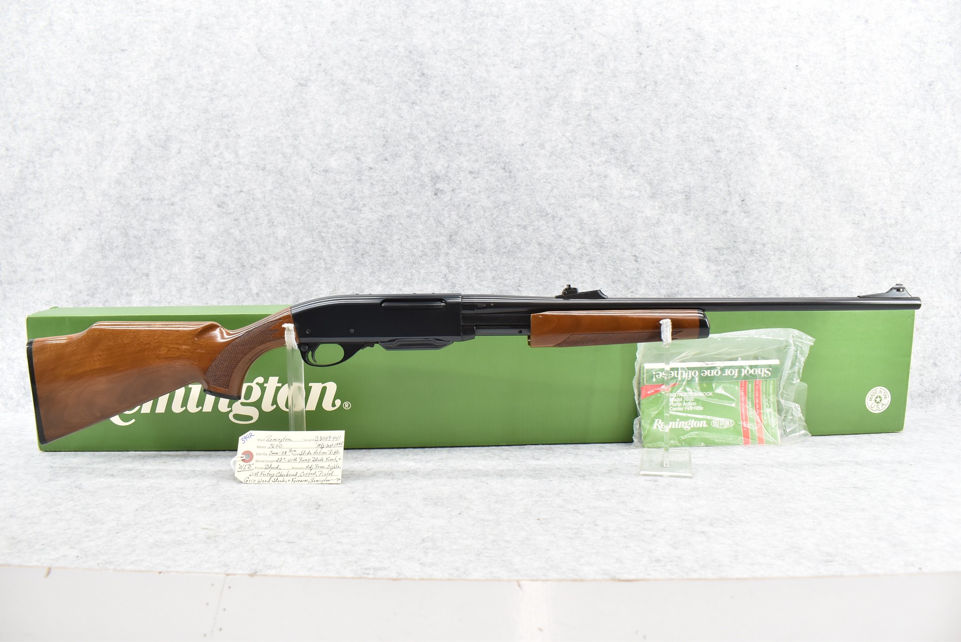 394R. Remington – Mod. 7600 – 7mm-08 Rem. Cal. Pump Action Rifle – w/22” Barrel w/Ramp Blade Front & Adj. Rear Sights – Blued Finish – w/Factory Checkered Capped Pistol Grip Wood Stocks w/Factory Butt Plate – w/Detachable Magazine – New w/Factory Box & Manual – Mfg. Sept. 1990 – One of the First 500 Rifles Mfg. w/High Gloss Walnut Stocks