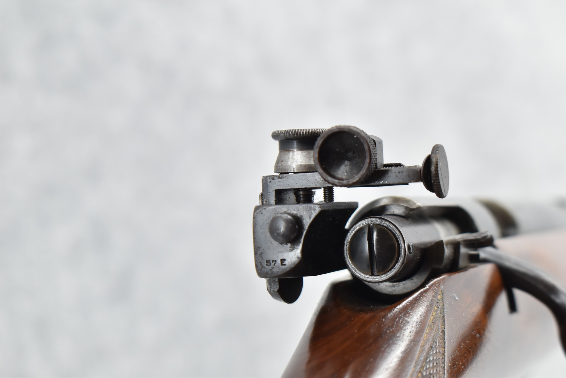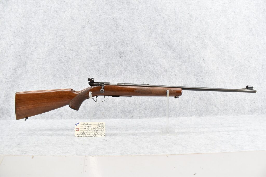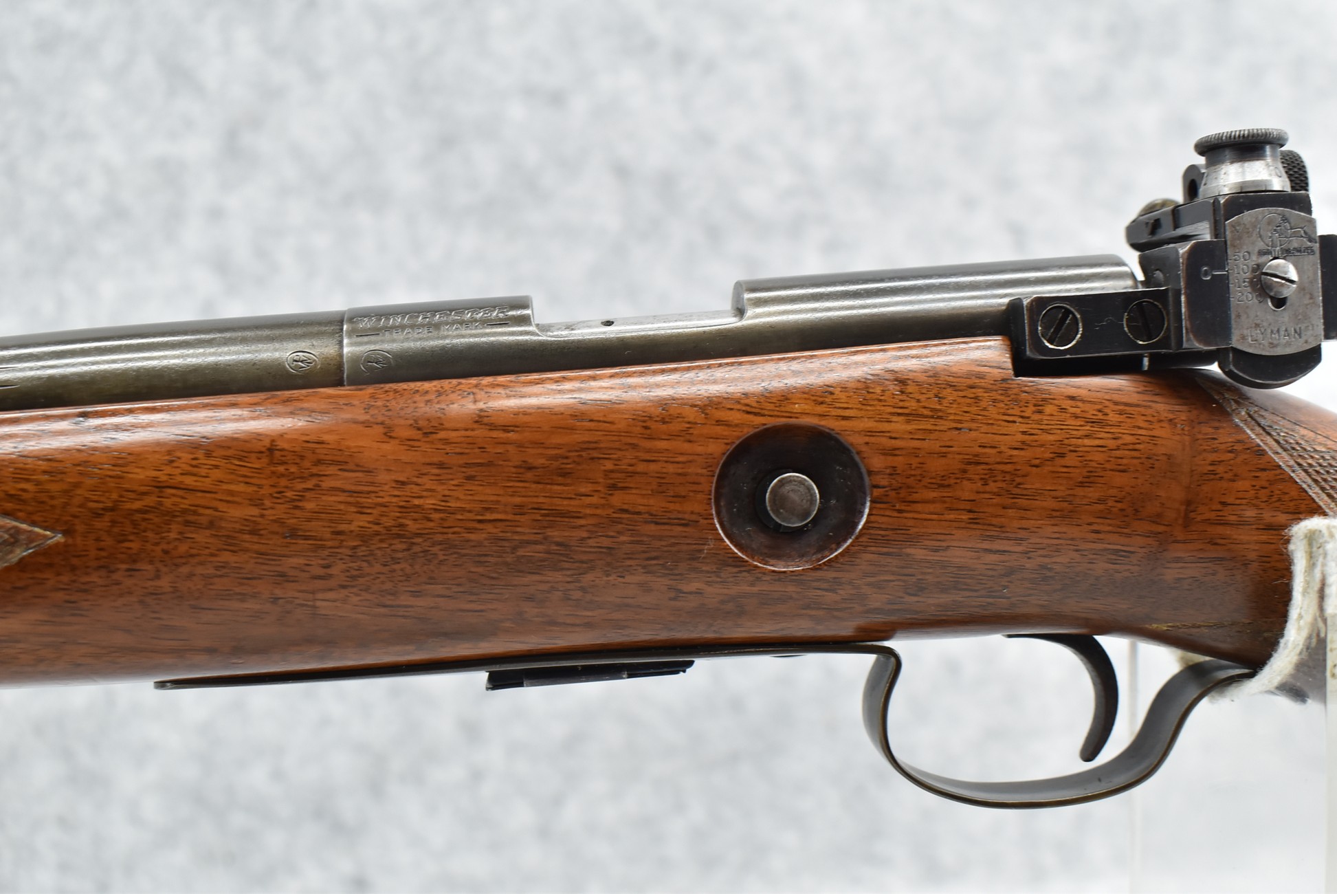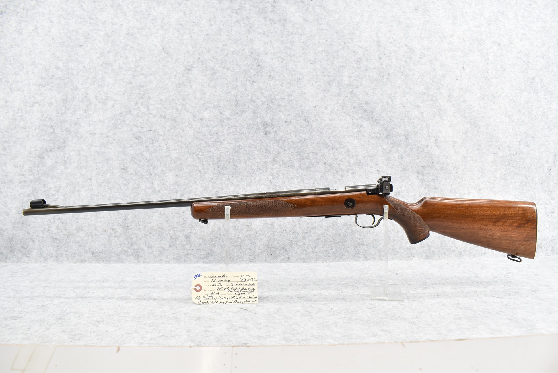 394R. Winchester – Mod. 75 Sporting – 22LR Cal. Bolt Action Rifle – w/24” Barrel w/Hooded Blade Front (Rear Barrel Dovetail Blank) & Lyman 57E Adj. Rear Receiver Peep Sights – Blued Finish – w/Deluxe Checkered Capped Pistol Grip Wood Stock w/Factory Metal Butt Plate & Sling Loops – w/Factory 5Rd Detachable Magazine – Mfg. 1942