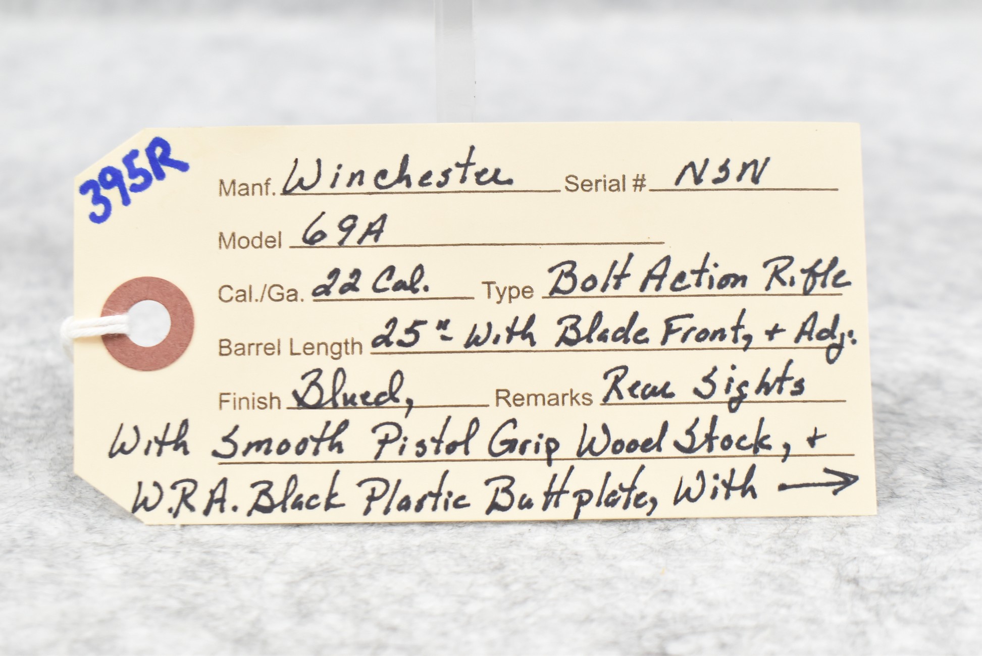 395R. Winchester – Mod. 69A – 22 Cal. Bolt Action Rifle – w/25” Barrel w/Blade Front & Adj. Rear Sights – Blued Finish – w/Smooth Pistol Grip Wood Stock w/Factory Butt Plate – w/Factory 5Rd Detachable Magazine