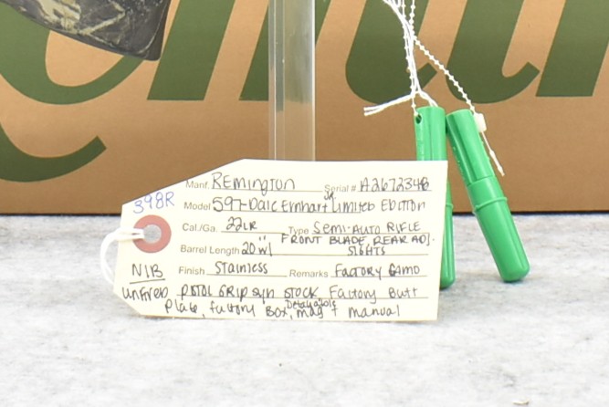 398R. Remington – Mod. 597 Dale Ernhart Jr. Limited Edition – 22LR Cal. Semi-Auto Rifle – w/20” Barrel w/Blade Front and Adjustable Rear Sights – Stainless Finish – w/Factory Camouflage Pistol Grip Synthetic Stock w/Factory Butt Plate – w/Factory Detachable Magazine – New in Factory Box w/Manual