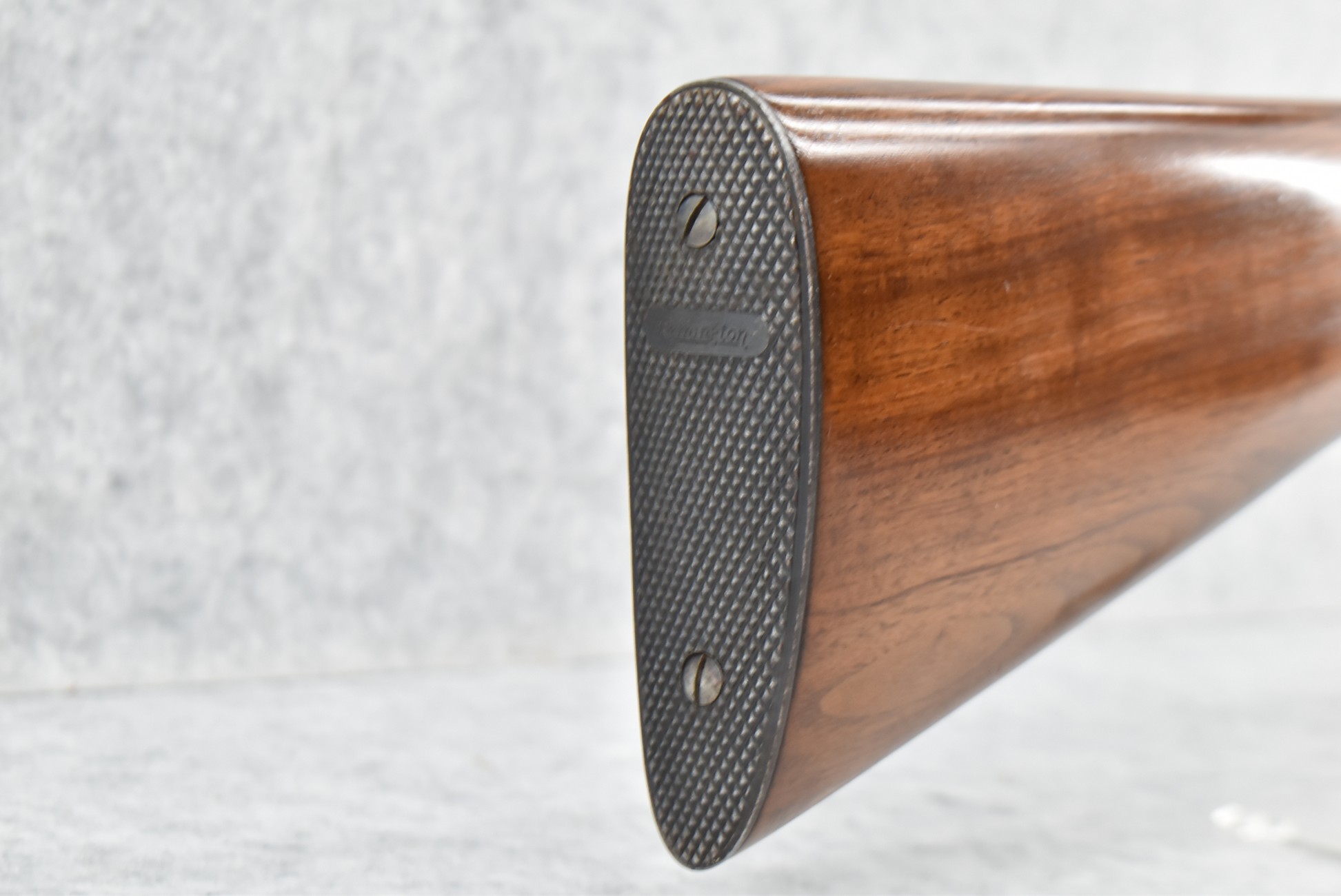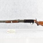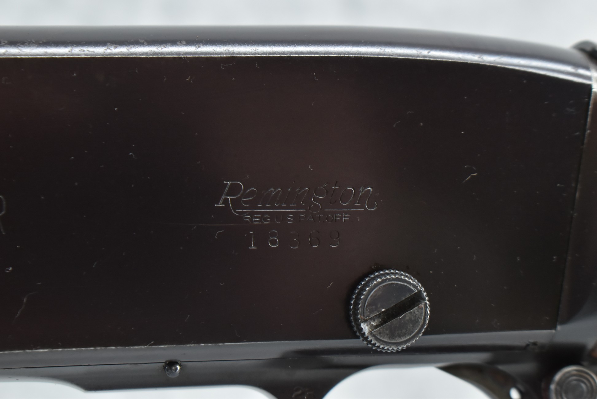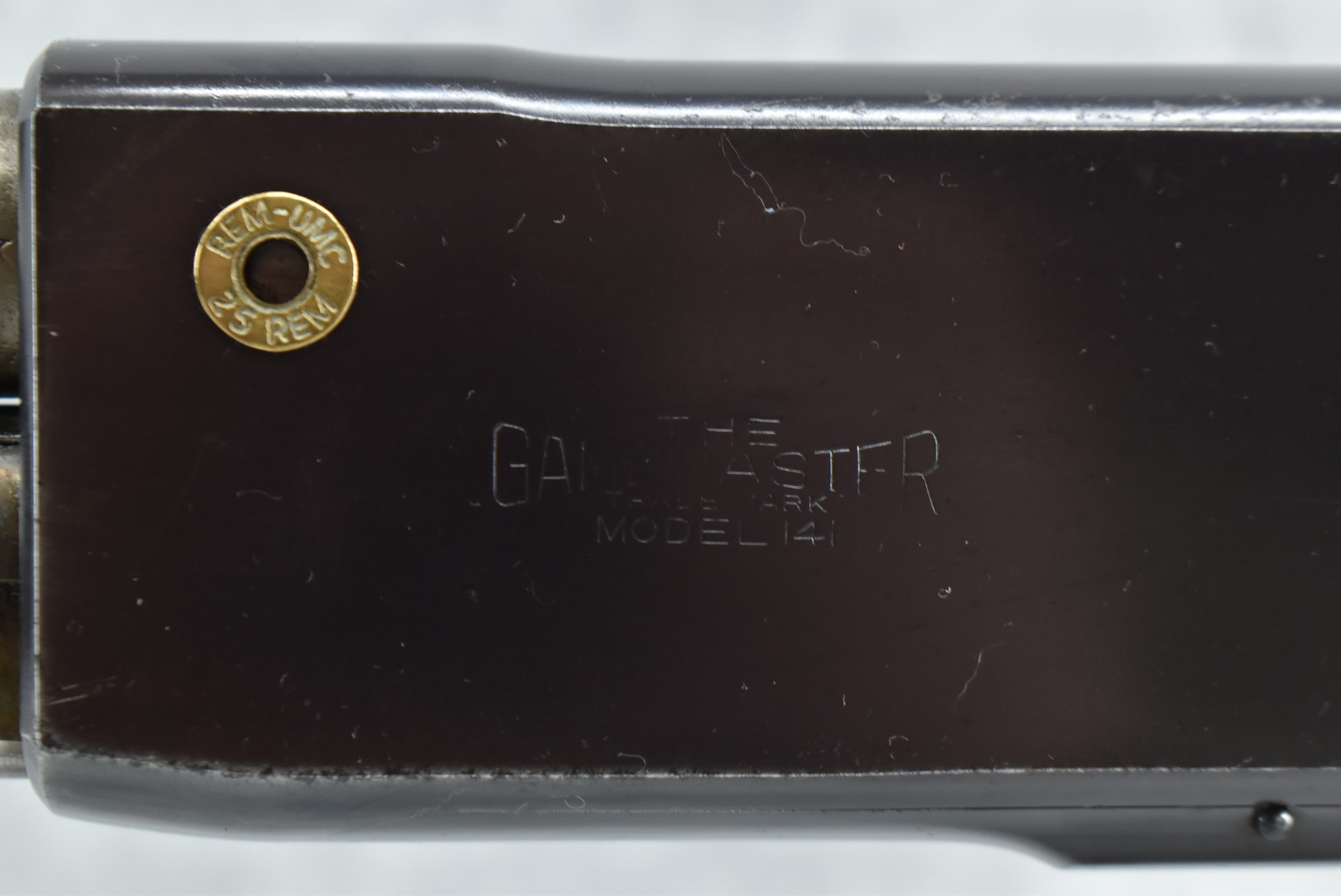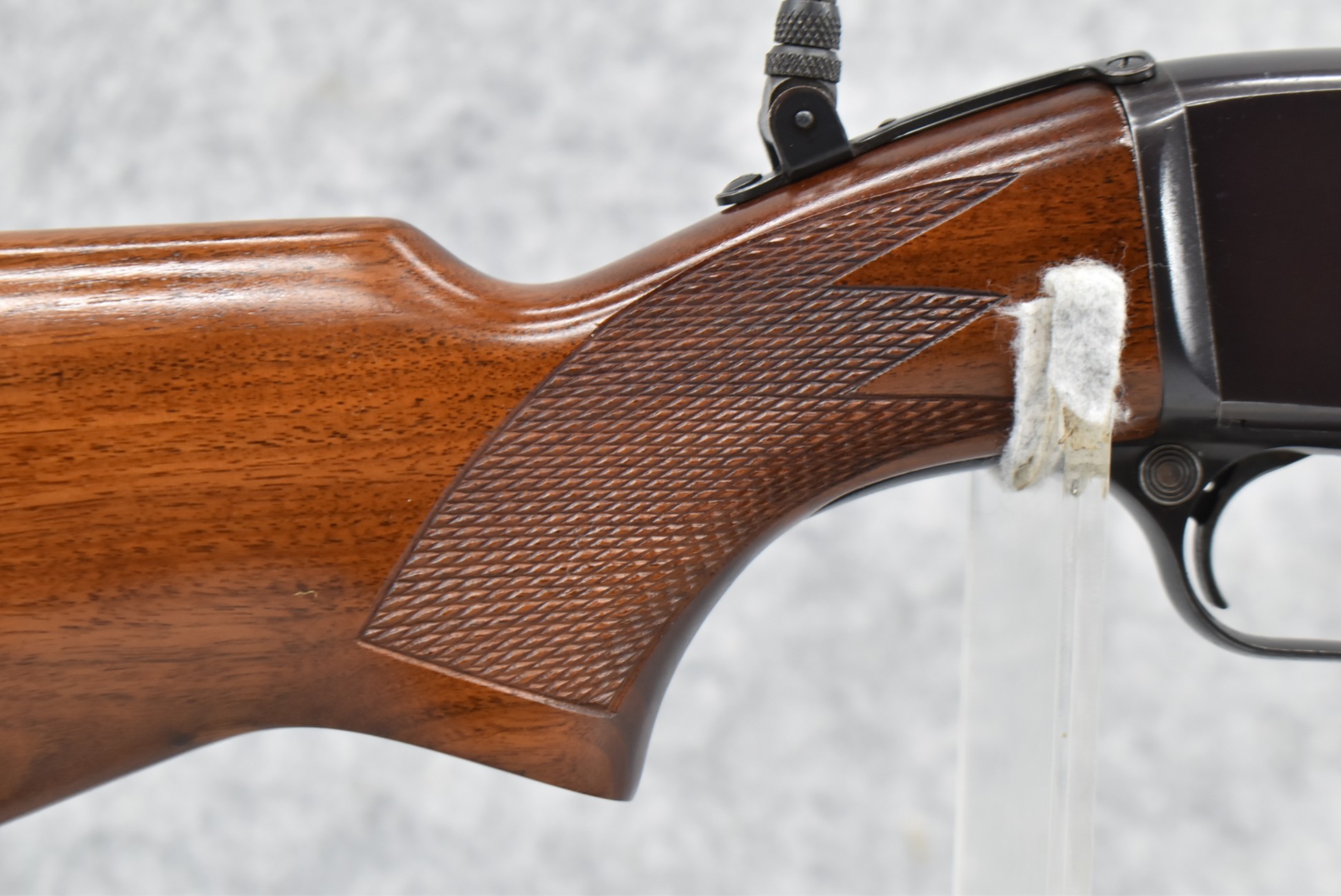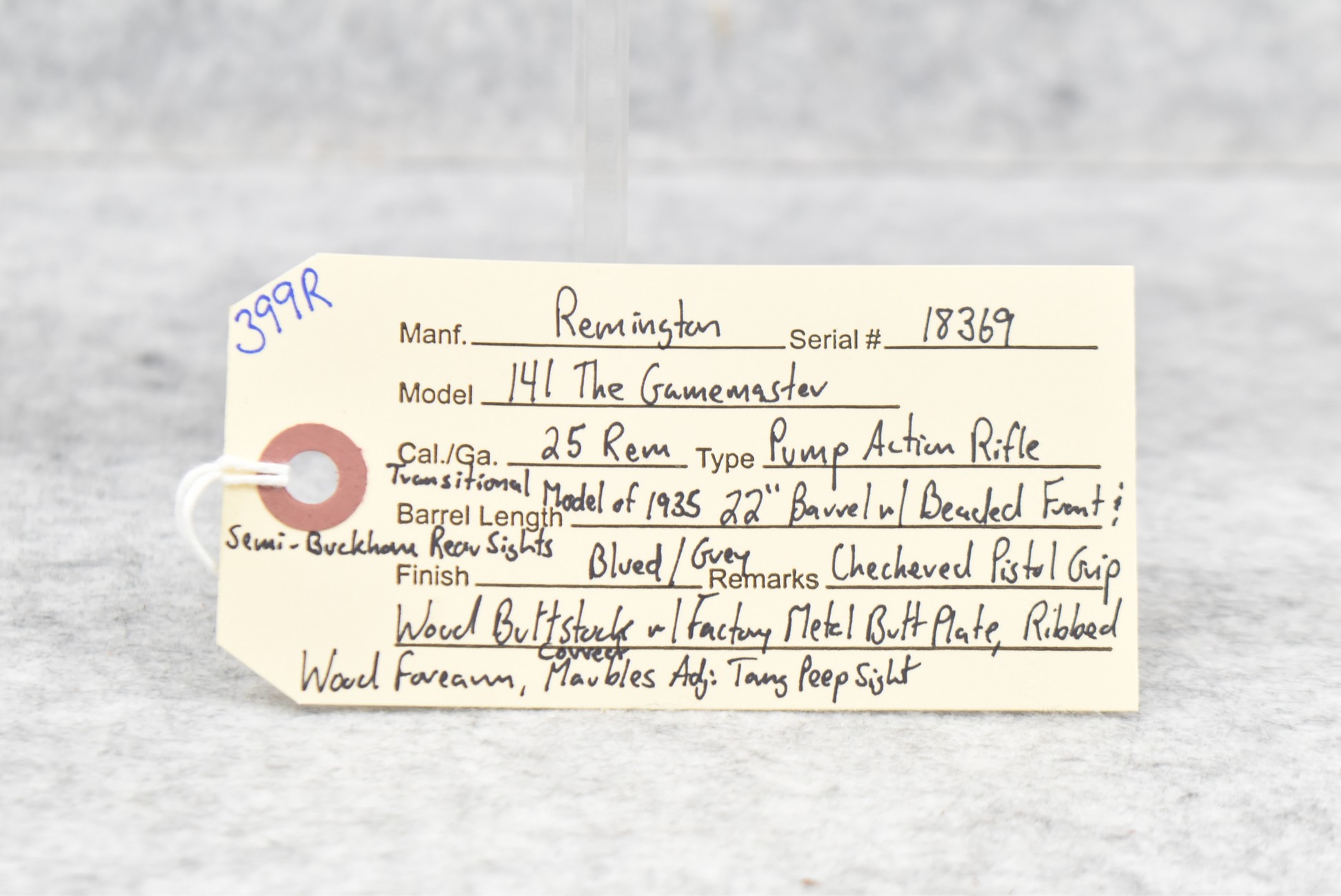 399R. Remington – Mod. 141 The Gamemaster – 25 Rem. Cal. Pump Action Rifle – w/Transitional Model of 1935, 22” Barrel w/Beaded Front & Semi-Buckhorn Rear Sights w/Correct Marbles Adj. Tang Peep Sight – Blued/Gray Finish – w/Checkered Pistol Grip Wood Butt Stock w/Factory Metal Butt Plate & Ribbed Wood Forearm