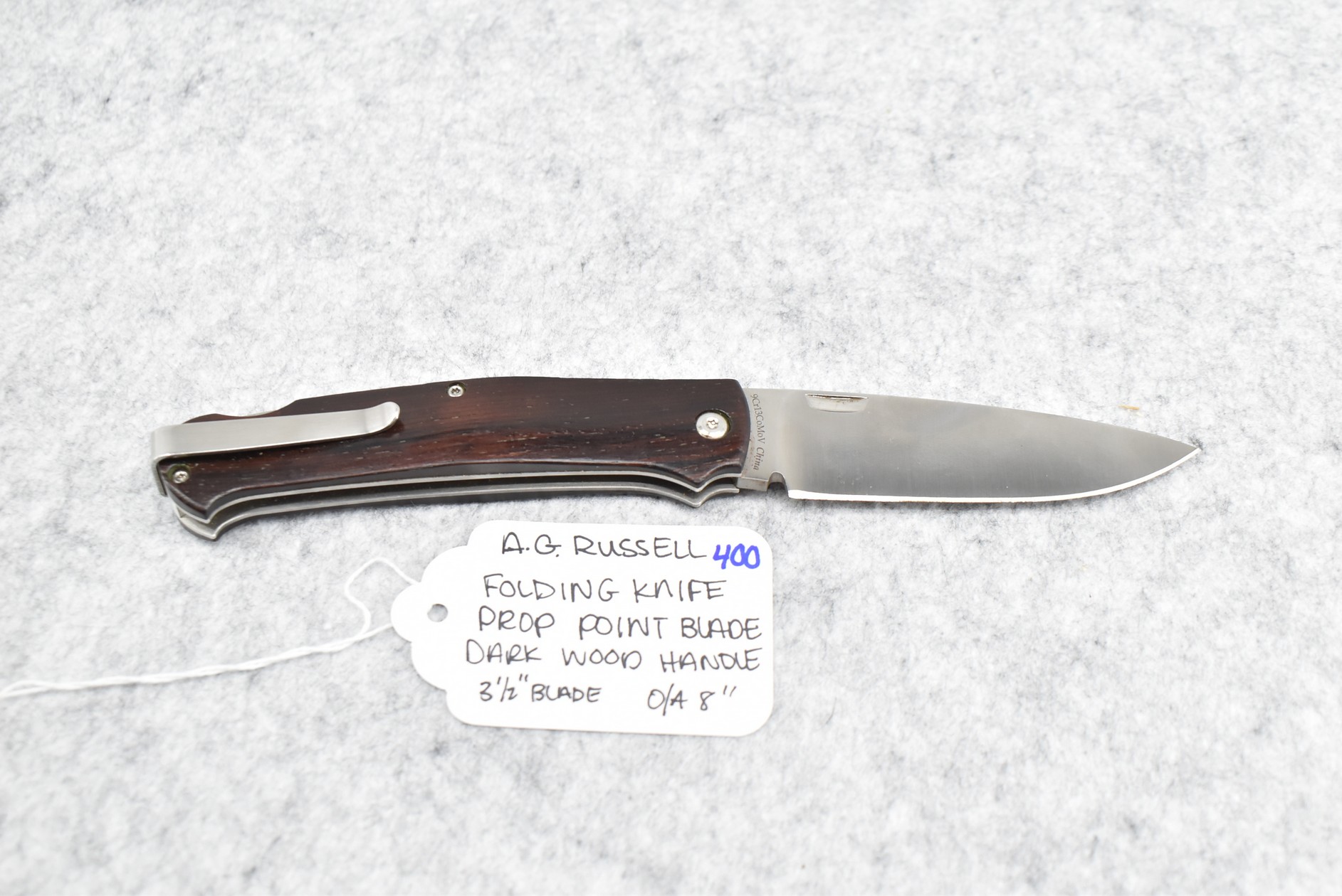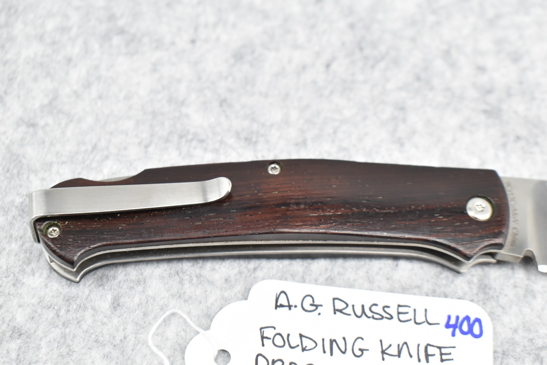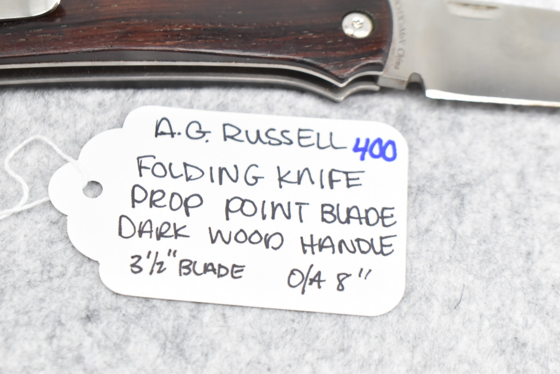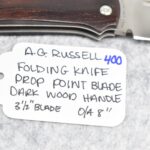 400. A.G. Russel – Folding Knife – w/3 ½” Drop Point Blade – 8” Overall Length – w/Dark Wood Handle