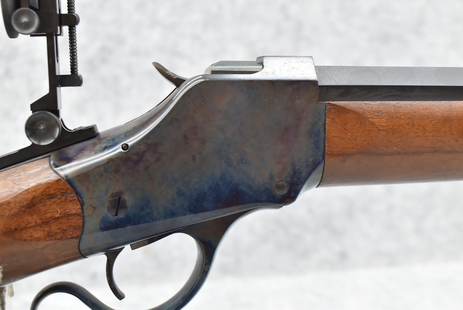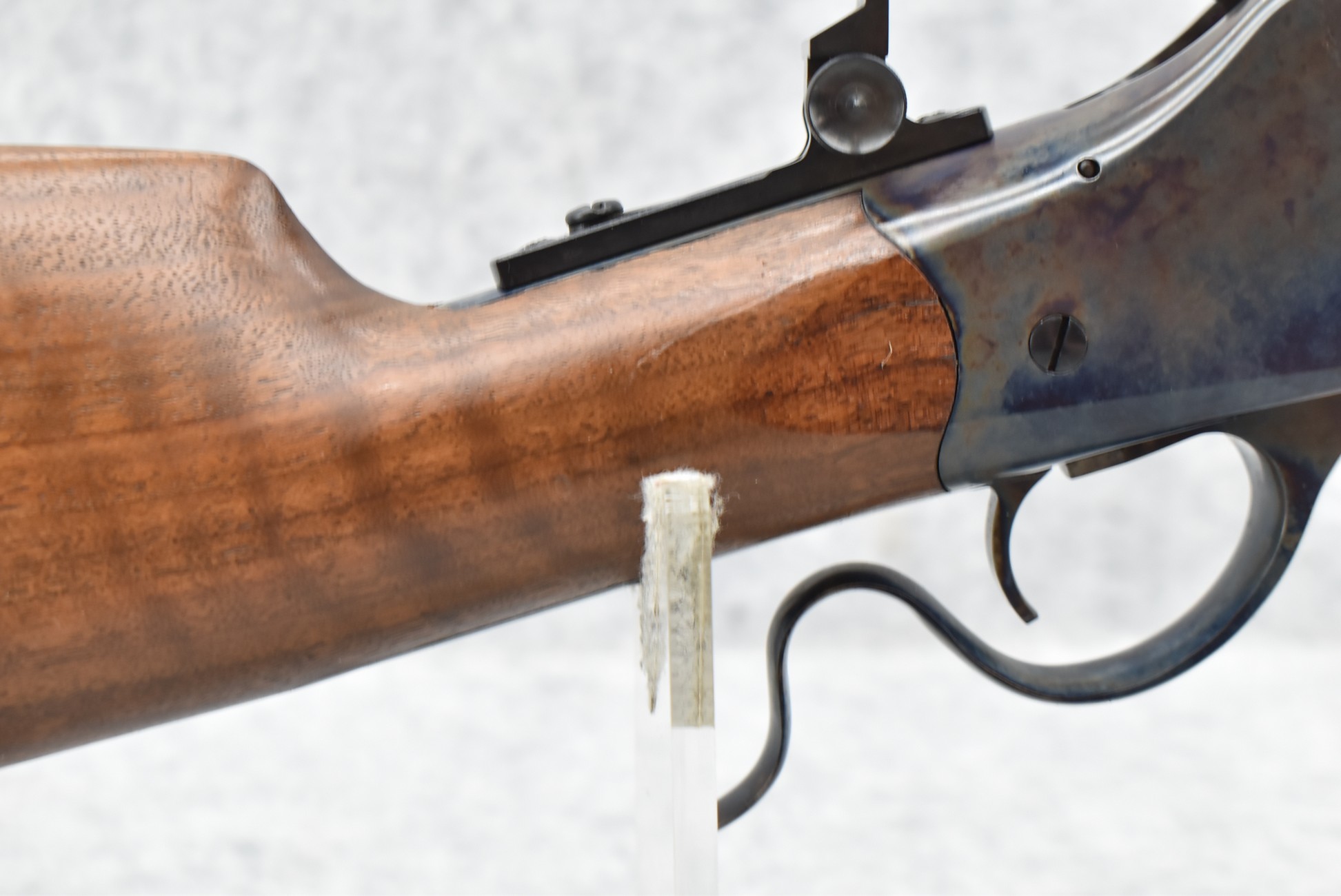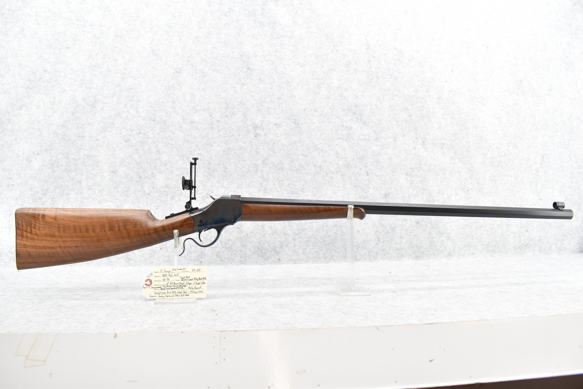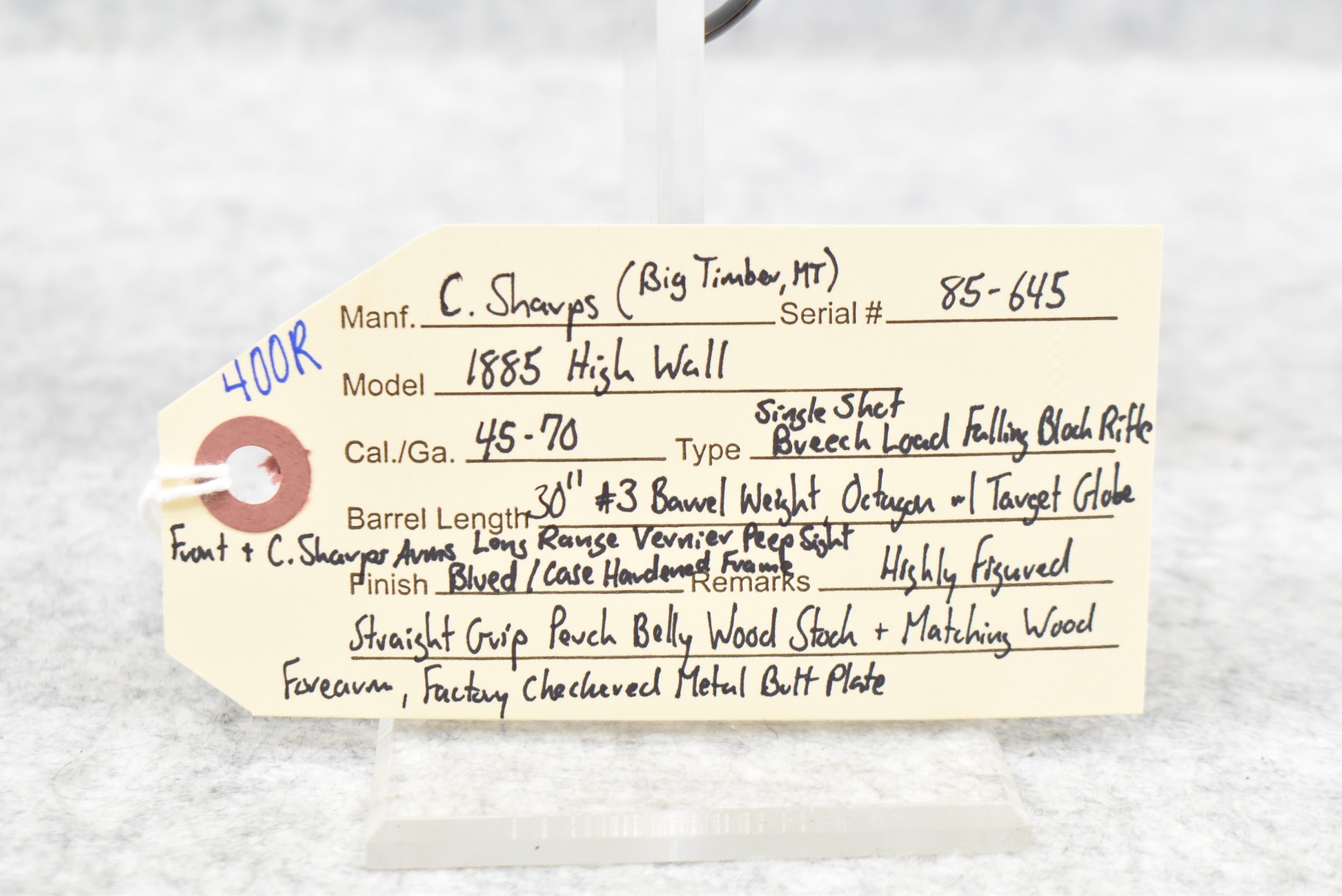 400R. C. Sharps (Big Timber, MT) – Mod. 1885 High Wall – 45-70 Cal. Single Shot Breech Loading Falling Block Rifle – w/30” Octagon No. 3 Barrel Weight Barrel w/Target Globe Front and C. Sharps Arms Long Range Vernier Tang Peep Sight – Blued Finish w/Case Hardened Frame – w/Highly Figured Straight Grip Wood Stock and Matching Wood Forearm w/Factory Checkered Metal Butt Plate