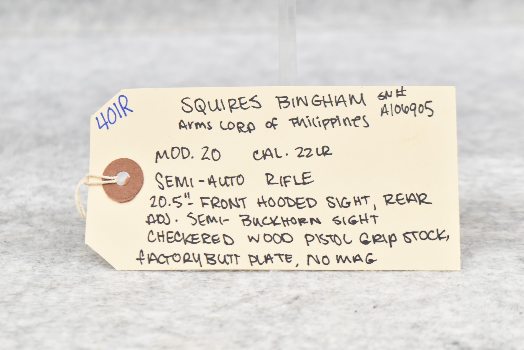 401R. Squires Bingham Arms Corp. of Philippines – Mod. 20 – 22LR Cal. Semi-Auto Rifle – w/20.5” Barrel w/Front Hooded Sight & Rear Adj. Semi-Buckhorn Sight – w/Checkered Wood Pistol Grip Stock w/Factory Butt Plate – No Mag