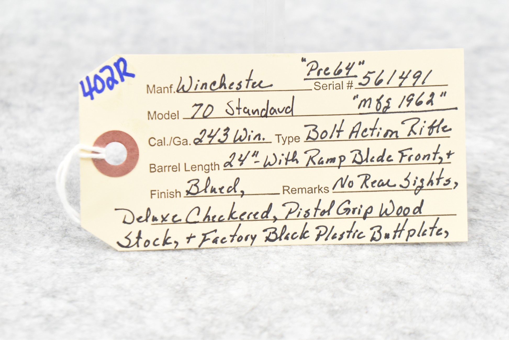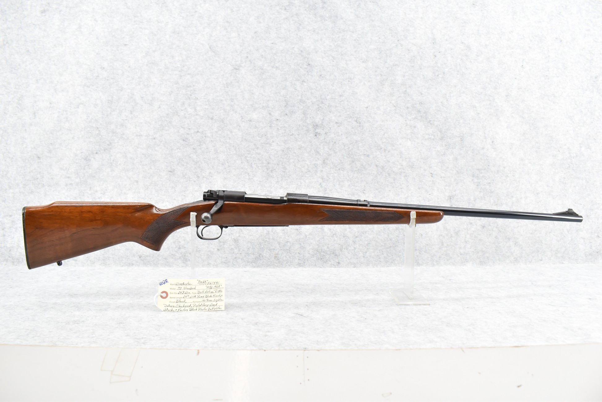 402R. Winchester – Mod. 70 Standard (Pre-64) – 243 Win. Cal. Bolt Action Rifle – w/24” Barrel w/Ramp Blade Front Sight (No Rear Sights) – Blued Finish – w/Deluxe Checkered Pistol Grip Wood Stock w/Factory Butt Plate – Mfg. 1962