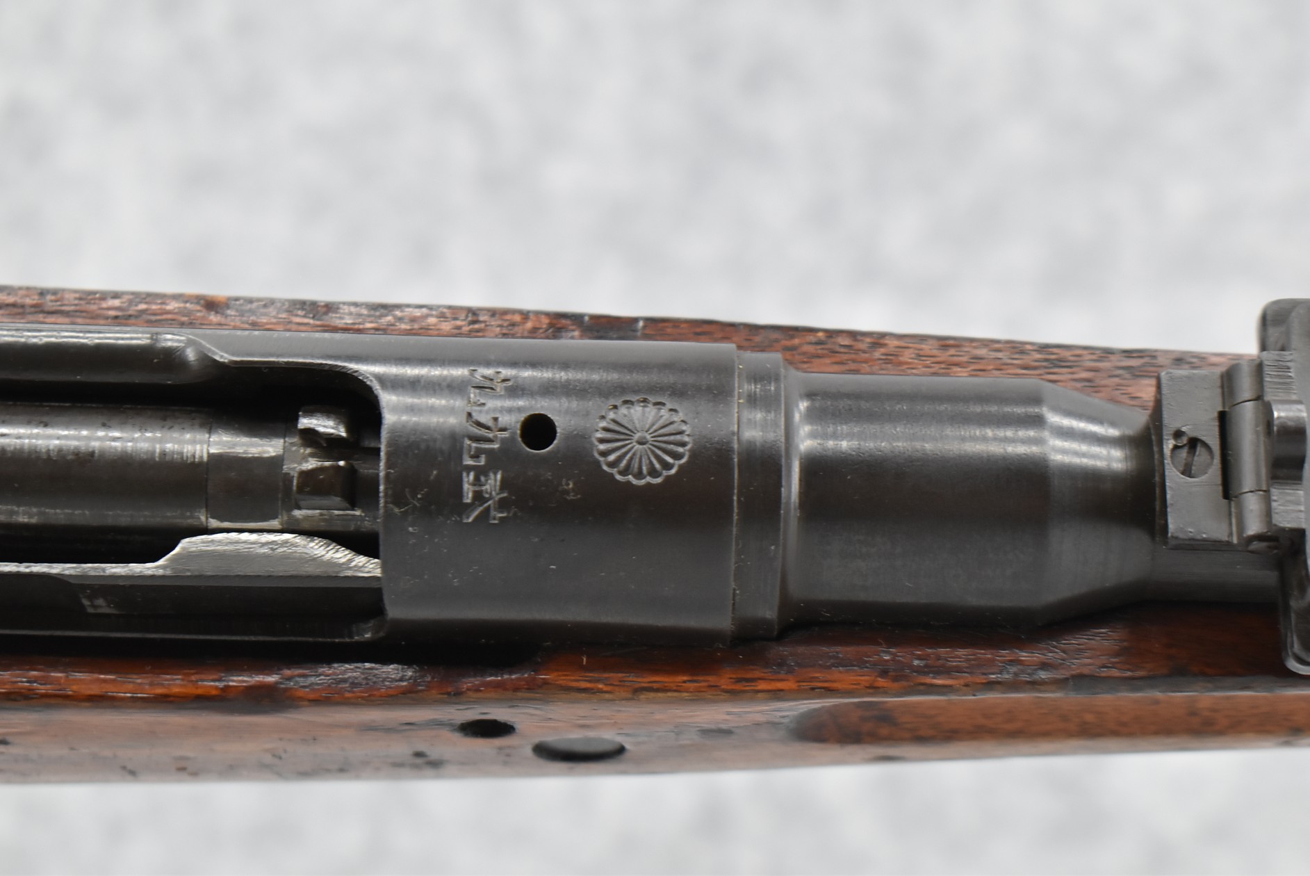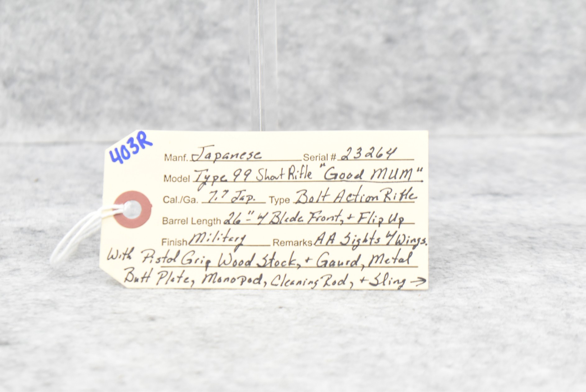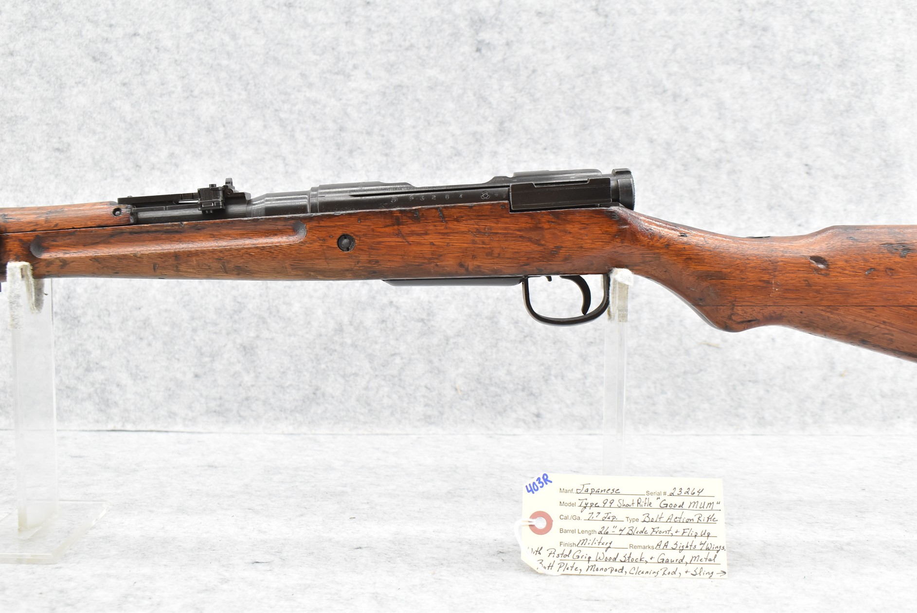 403R. Japanese – Type 99 Short Rifle – 7.7 Jap Cal. Bolt Action Rifle – w/26” Barrel w/Blade Front & Flip Up Anti-Aircraft Sights w/Wings – Military Finish – w/Pistol Grip Wood Stocks w/Metal Butt Plate – w/Sling Loops – w/Cleaning Rod– w/Monopod – Matching Bolt – Unground Mum