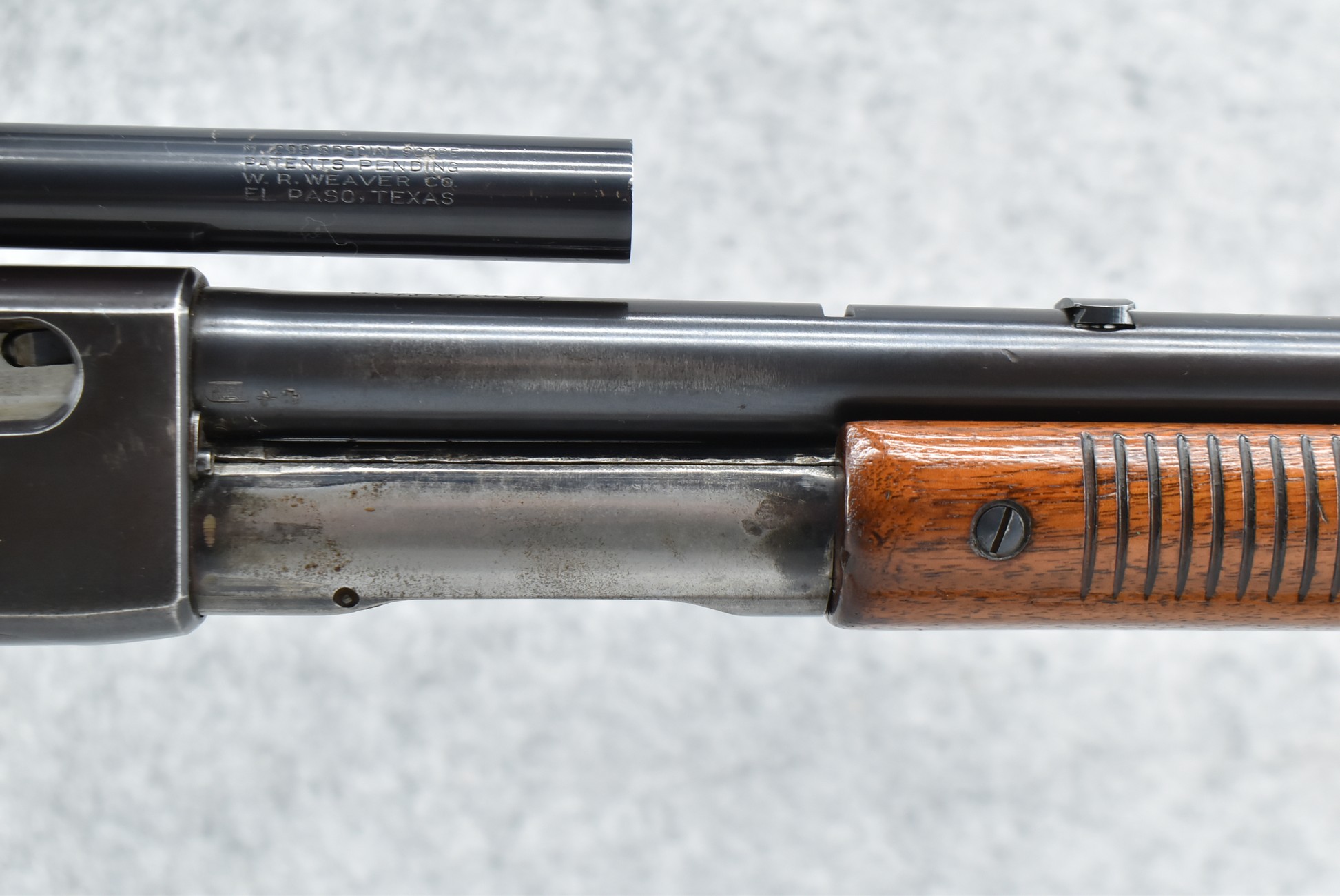 405R. Remington – Mod. 141 (Transitional Model of 1935) – In the Scarce 25 Rem. Cal. Pump Action Rifle – w/22” Barrel w/Beaded Front Sight (Rear Dovetail Blank) – Blued Finish – w/Checkered Pistol Grip Wood Butt Stock w/Factory Butt Plate & Ribbed Wood Forearm – w/Weaver M29S Scope & Mount – Mfg. Oct. 1935 – Very Few Model 141’s Were Mfg. in 25 Rem. Cal. in 1935, Approx. Only 2,000 Model 141’s Were Mfg. in 1935 w/22” Barrels!