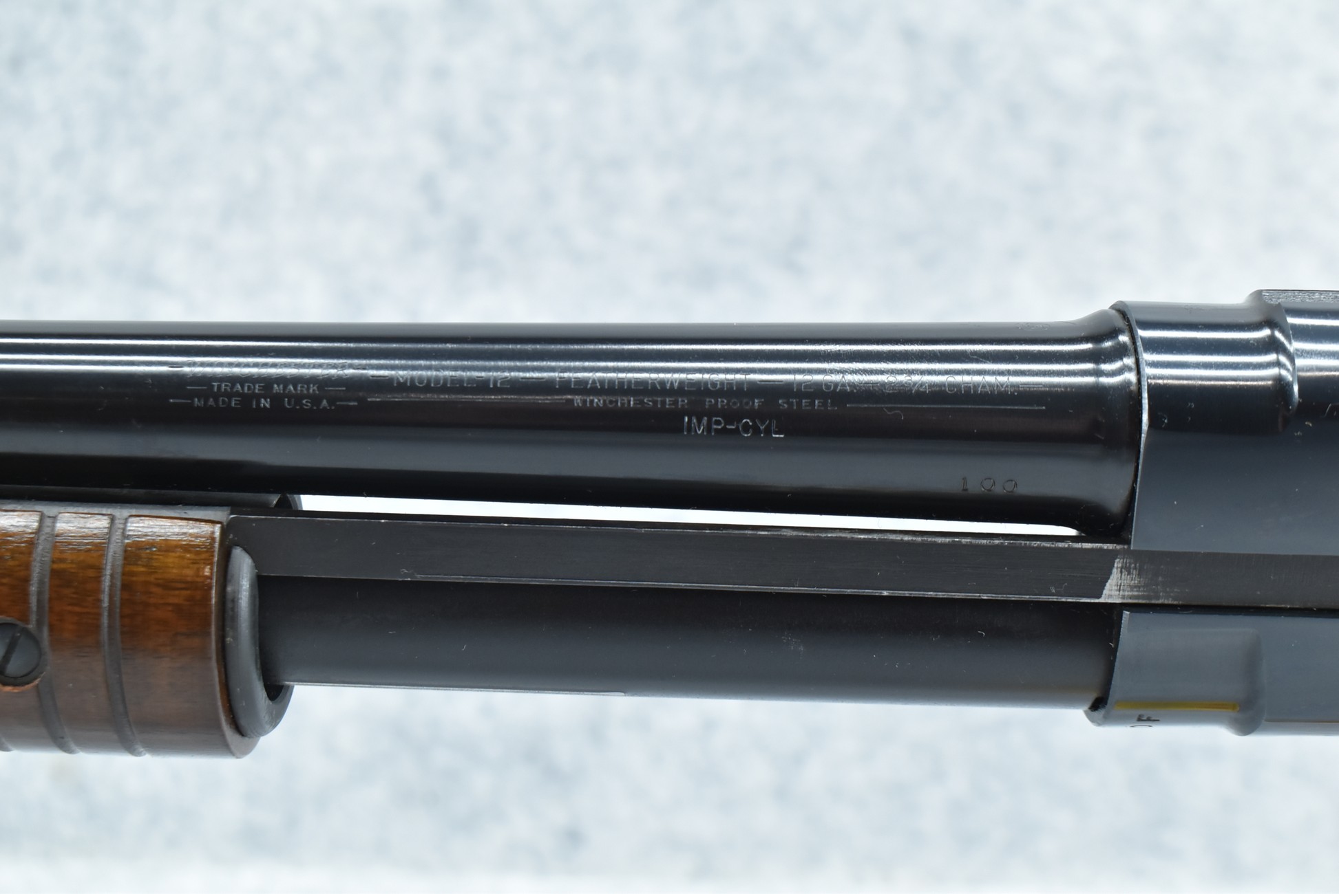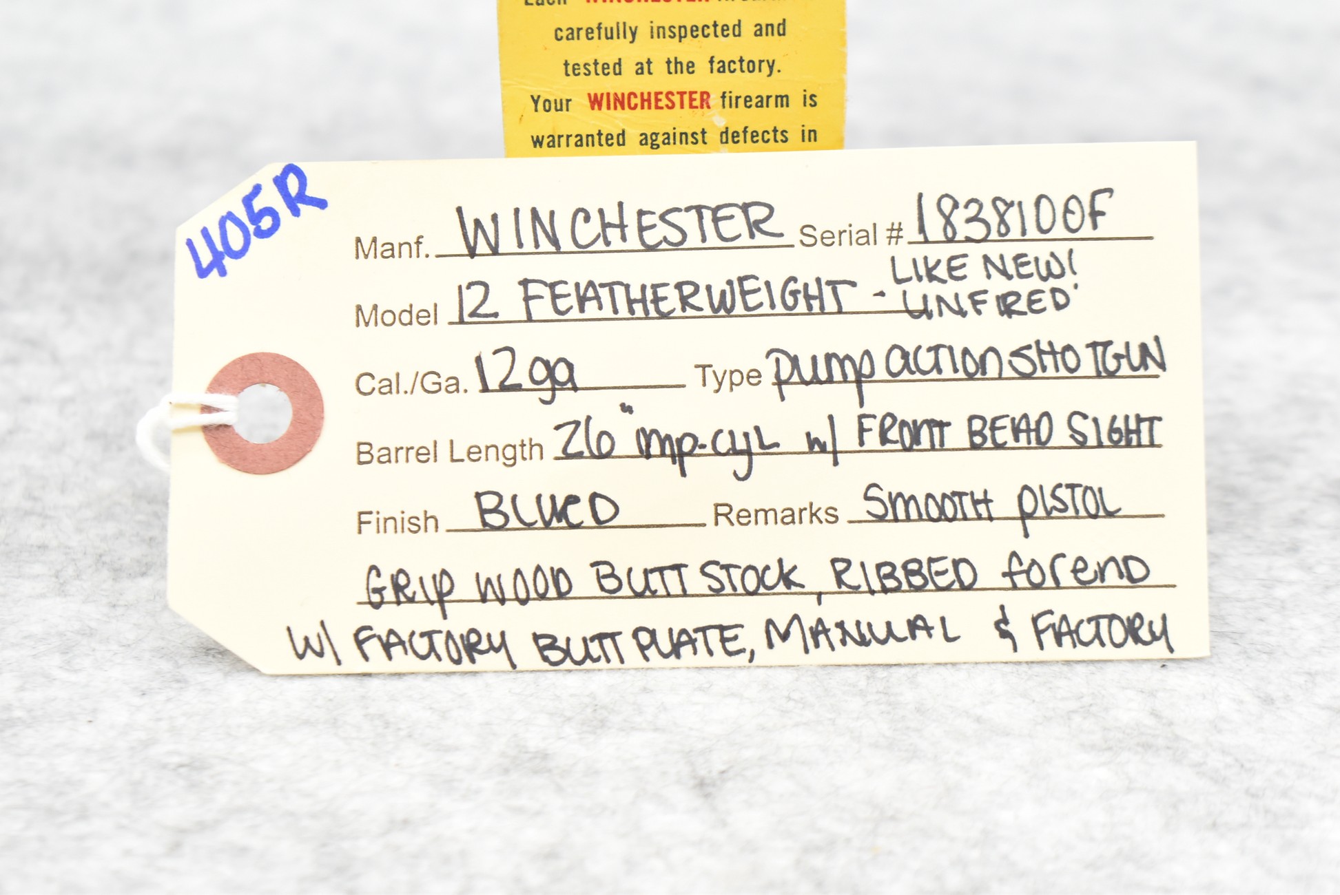 405R. Winchester – Mod. 12 Featherweight – 12ga. Pump Action Shotgun – w/26” Imp. Cyl. Choked Barrel w/Front Bead Sight – Blued Finish – w/Smooth Pistol Grip Wood Butt Stock w/Factory Butt Plate & Ribbed Forend – Appears & Unfired w/Factory Hang Tag & Manual