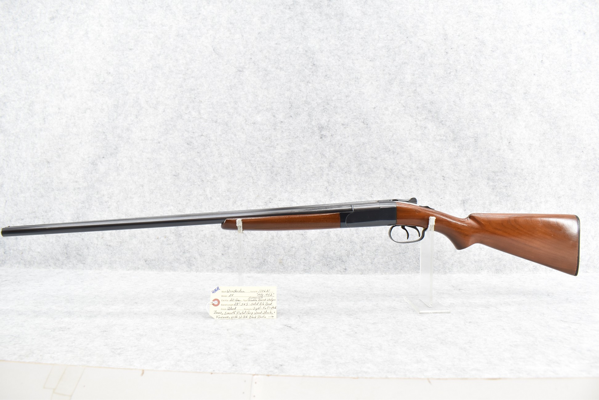 406R. Winchester – Mod. 24 – 20ga. Hammerless Double Barrel Shotgun – w/28” Full & Mod. Choked, Solid Rib Barrels w/Bead Sight – Blued Finish – w/Smooth Pistol Grip Wood Stocks w/Factory Butt Plate – Mfg. 1952