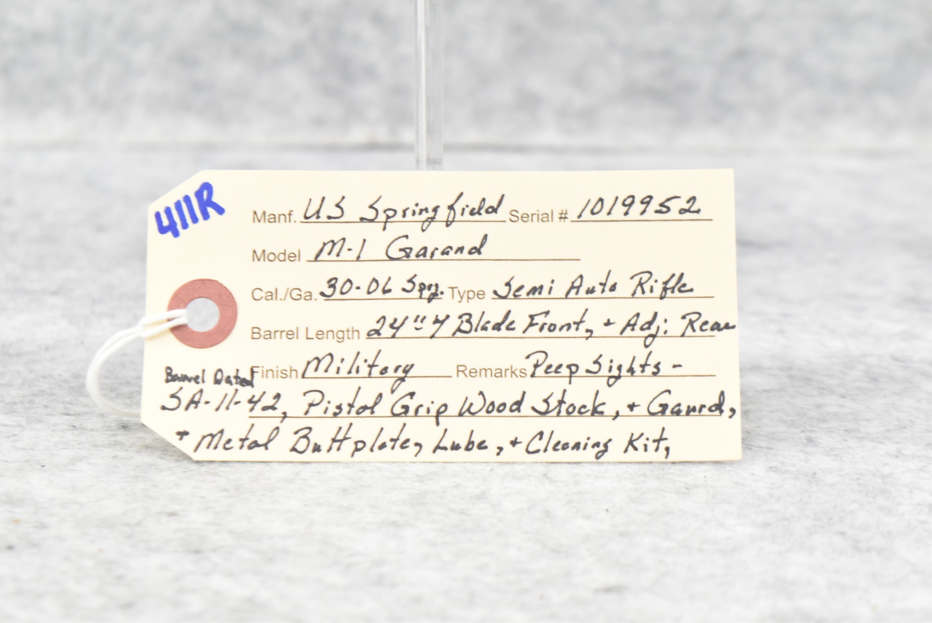 411R. U.S. Springfield – Mod. M1 Garand – 30-06 Sprg. Cal. Semi-Auto Rifle – w/24” SA-11-42 Dated Barrel w/Blade Front & Adj. Rear Peep Sights – Military Finish – w/Pistol Grip Wood Stocks w/Metal Butt Plate – w/Lube & Cleaning Kit