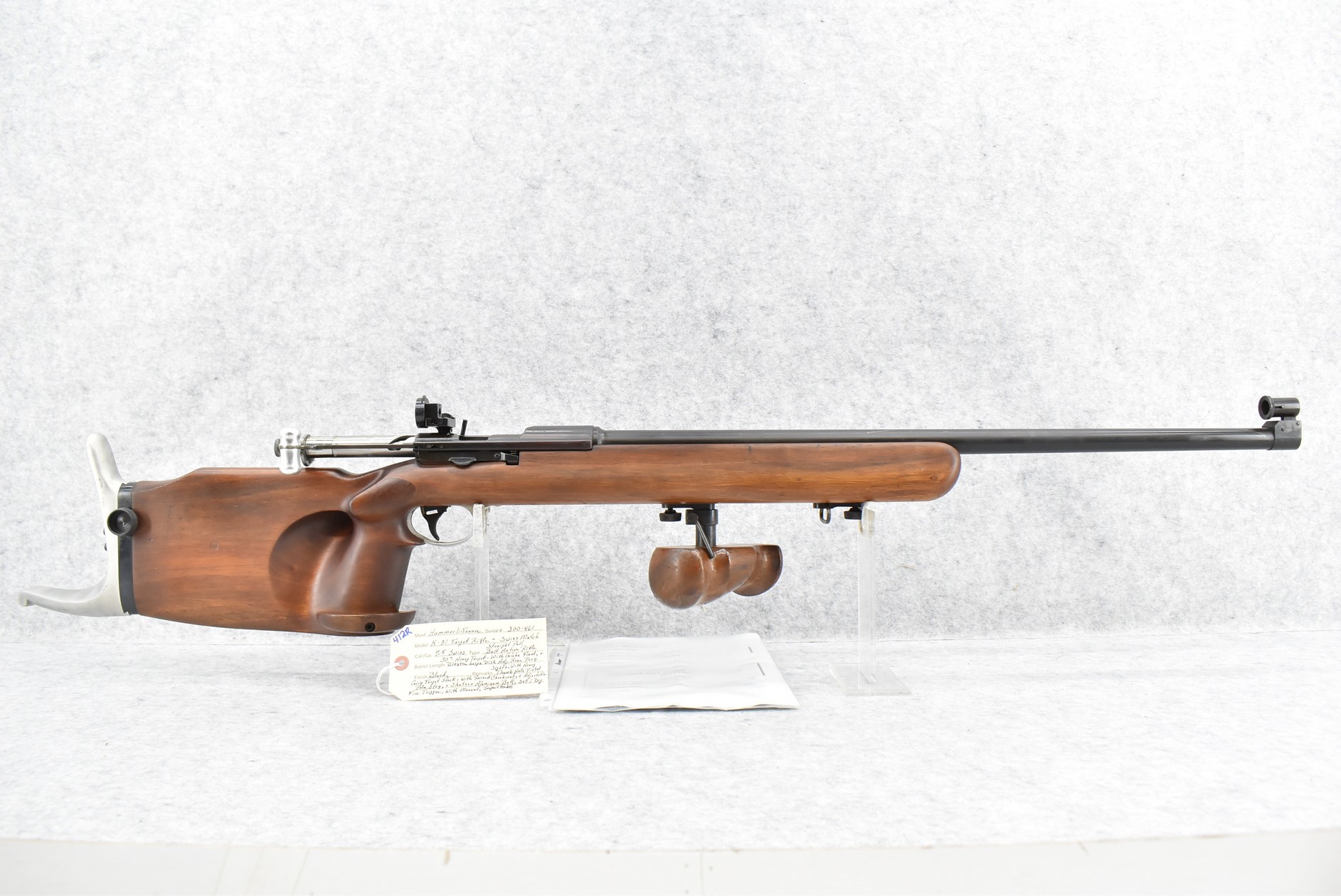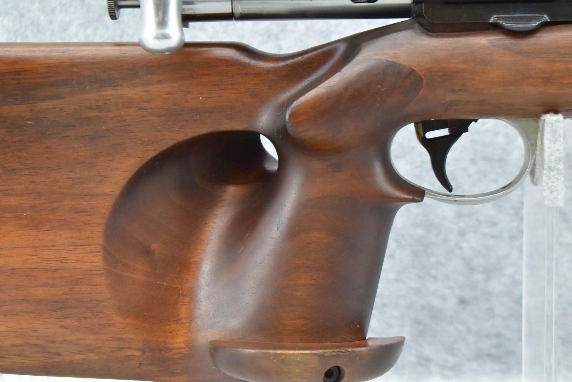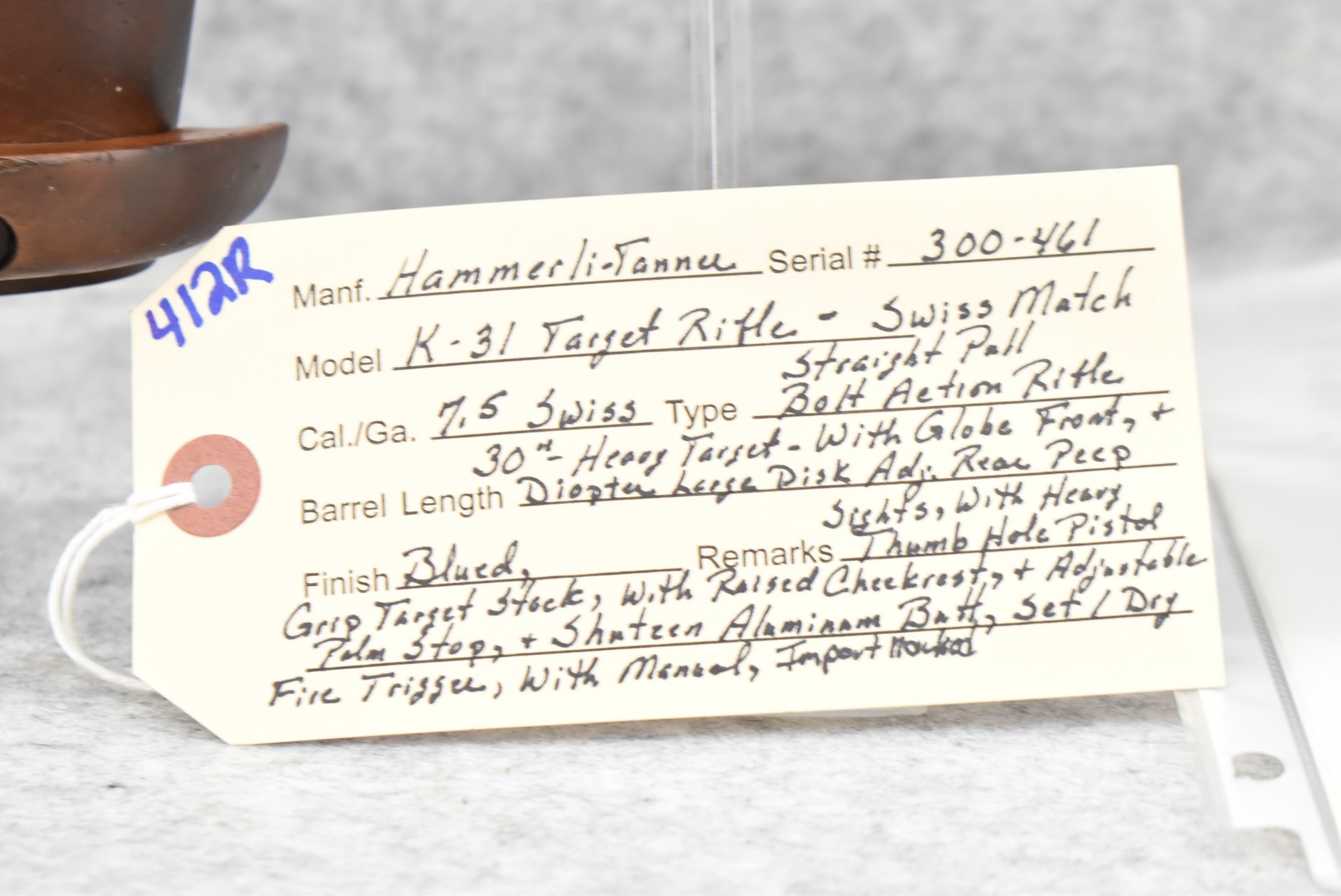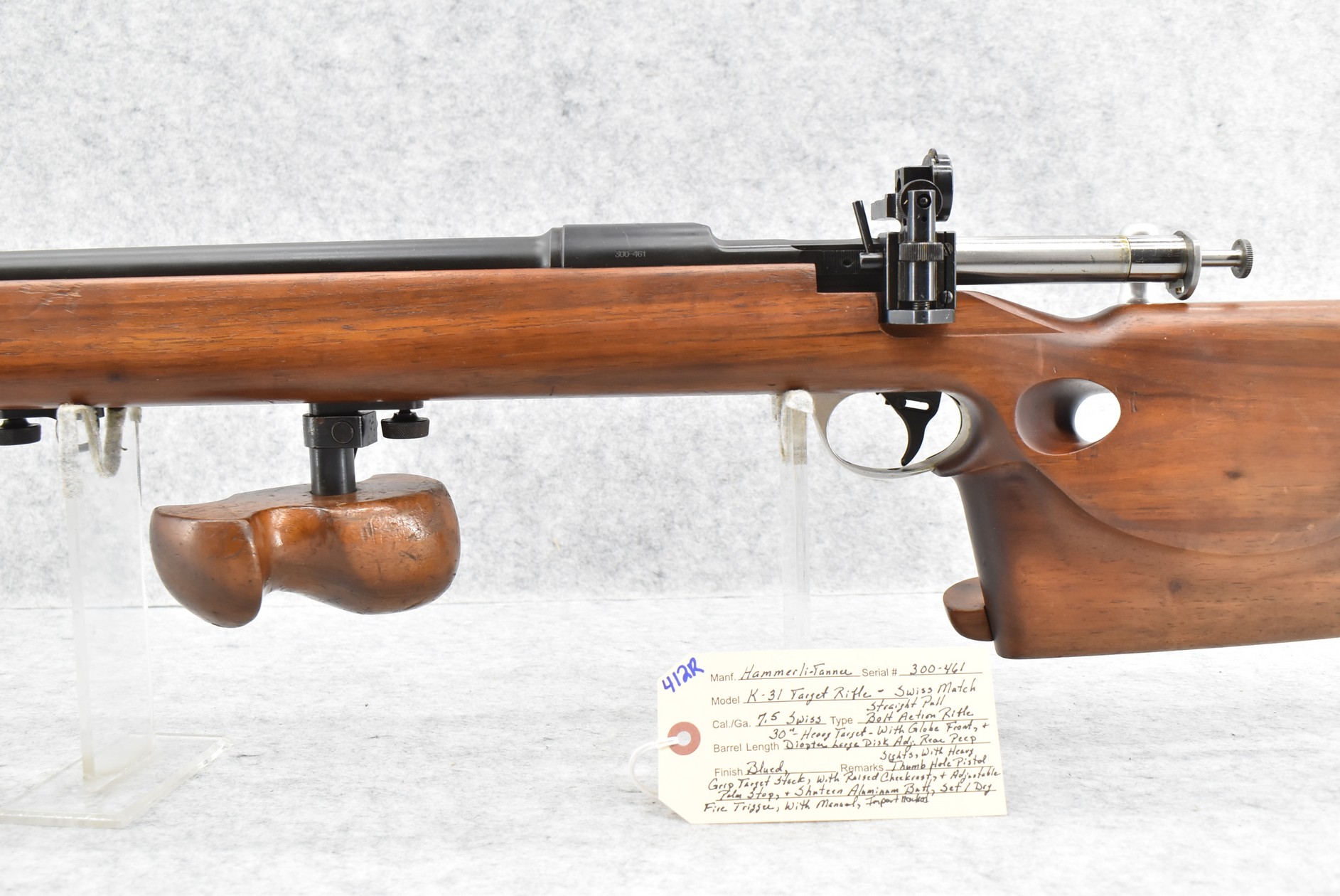 412R. Hammerli-Tanner – Mod. K-31 Target Rifle-Swiss Match – 7.5 Swiss Cal. Straight Pull Bolt Action Rifle – w/30” Heavy Target Barrel w/Globe Front & Diopter Large Disk Adj. Rear Peep Sights – Blued Finish – w/Heavy Thumb-Hole Pistol Grip Target Stock w/Raised Cheek Piece & Adjustable Palm Stop w/Shutzen Aluminum Butt Plate – w/Set/Dry Fire Trigger – w/Manual – Import Marked